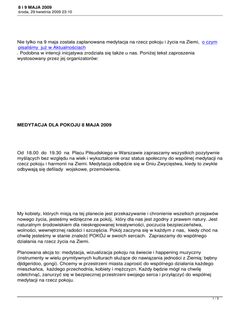 8 i 9 MAJA 2009 środa, 29 kwietnia 2009 23:10 Nie tylko na 9 maja została zaplanowana medytacja na rzecz pokoju i życia na Ziemi, o czym pisaliśmy już w Aktualnościach . Podobna w intencji inicjatywa zrodziała się także u nas. Poniżej tekst zaproszenia wystosowany przez jej organizatorów: MEDYTACJA DLA POKOJU 8 MAJA 2009 Od 18.00 do 19.30 na Placu Piłsudskiego w Warszawie zapraszamy wszystkich pozytywnie myślących bez względu na wiek i wykształcenie oraz status społeczny do wspólnej medytacji na rzecz pokoju i harmonii na Ziemi. Medytacja odbędzie się w Dniu Zwycięstwa, kiedy to zwykle odbywają się defilady wojskowe, przemówienia. My kobiety, których misją na tej planecie jest przekazywanie i chronienie wszelkich przejawów nowego życia, jesteśmy wdzięczne za pokój, który dla nas jest zgodny z prawem natury. Jest naturalnym środowiskiem dla nieskrępowanej kreatywności, poczucia bezpieczeństwa, wolności, wewnętrznej radości i szczęścia. Pokój zaczyna się w każdym z nas, kiedy choć na chwilę jesteśmy w stanie znaleźć POKÓJ w swoich sercach. Zapraszamy do wspólnego działania na rzecz życia na Ziemi. Planowana akcja to: medytacja, wizualizacja pokoju na świecie i happening muzyczny (instrumenty w wielu prymitywnych kulturach służące do nawiązania jedności z Ziemią: bębny djidgeridoo, gongi). Chcemy w przestrzeni miasta zaprosić do wspólnego działania każdego mieszkańca, każdego przechodnia, kobiety i mężczyzn. Każdy będzie mógł na chwilę odetchnąć, zanurzyć się w bezpiecznej przestrzeni swojego serca i przyłączyć do wspólnej medytacji na rzecz pokoju. 1/3 8 i 9 MAJA 2009 środa, 29 kwietnia 2009 23:10 Zapraszamy wszystkich, którzy zechcą zrobić ten mały gest dla naszej Ziemi, na której wszyscy mieszkamy. Akcja ma charakter społeczno-kulturalny jak również prewencyjny i eksperymentalny. Jak wskazują badania naukowe medytacje dla pokoju pozytywnie wpływają na otoczenie, zmniejszając przemoc i przestępczość*. Chcemy stanąć na Placu Piłsudskiego, kreując przestrzeń wewnętrznego Zwycięstwa w kręgu otwierając przestrzeń naszych serc symbolicznie dźwiękiem gongów zestrojonych z wibracją naszej planety. Czując własne serce otwieramy się prawdziwie na swoje potrzeby i potrzeby miejsca, w którym żyjemy. Chcemy po krótkiej medytacji zaprosić wszystkich obecnych do wyrażenia życzeń, intencji z przestrzeni czującego serca dla pokoju i harmonii na Ziemi. Wysnuć wizję, wypowiedzieć życzenia i marzenia, wyrazić wdzięczność i miłość dla Ziemi. Jesteśmy przekonane, że uważność, bycie w kontakcie ze sobą jest podstawą pokoju wewnętrznego, a przez to pokoju na świecie. Chcemy podzielić się doświadczeniem połączenia, otwartości i bezpieczeństwa. Według nas pokój jest zaprzeczeniem walki i przemocy, nadużywania władzy i manipulacji. Pokój jest naturalnym stanem. Jest naszym wewnętrznym kapitałem, skarbem najcenniejszym dla ludzkości. Żyjąc w harmonii wewnętrznego spokoju, żyjemy w zgodzie i harmonii z prawami natury. Jest to nam dane wraz z życiem, wraz z pierwszym oddechem. Jest to tak naturalne jak woda w rzece, jak ptaki na niebie, drzewa, rośliny i zwierzęta na Ziemi i w wodzie. To jest prawdziwe, dobre i piękne. Takiego świata chcemy. La dolce vita! napisały: Katarzyna Barszczewska, Michalina Frączek 2/3 8 i 9 MAJA 2009 środa, 29 kwietnia 2009 23:10 Grupa Kobiet Kreatywnych Pro-Kreacja. Mamy nadzieje, że tego typu akcje będą zataczać szersze kręgi w naszym kraju :) * Badanie Projekt Narodowej Demonstracji ( National Demonstration Project) przeprowadzone w Waszyngtonie w którym brało udział 4000 medytujących osób spowodowało zmniejszenie przestępczości i przemocy w mieście o prawie 25%. Wyniki te potwierdziła komisja 27 niezależnych naukowców, socjologów, kryminologów przedstawicieli policji i rządu amerykańskiego. p://istpp.org/crime_prevention/ 3/3