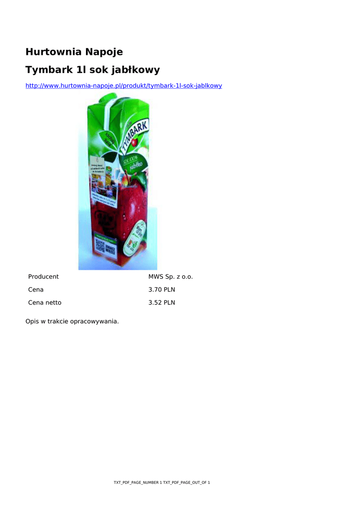 Hurtownia Napoje Tymbark 1l sok jabłkowy http://www.hurtownia-napoje.pl/produkt/tymbark-1l-sok-jablkowy Producent MWS Sp. z o.o. Cena 3.70 PLN Cena netto 3.52 PLN Opis w trakcie opracowywania. TXT_PDF_PAGE_NUMBER 1 TXT_PDF_PAGE_OUT_OF 1