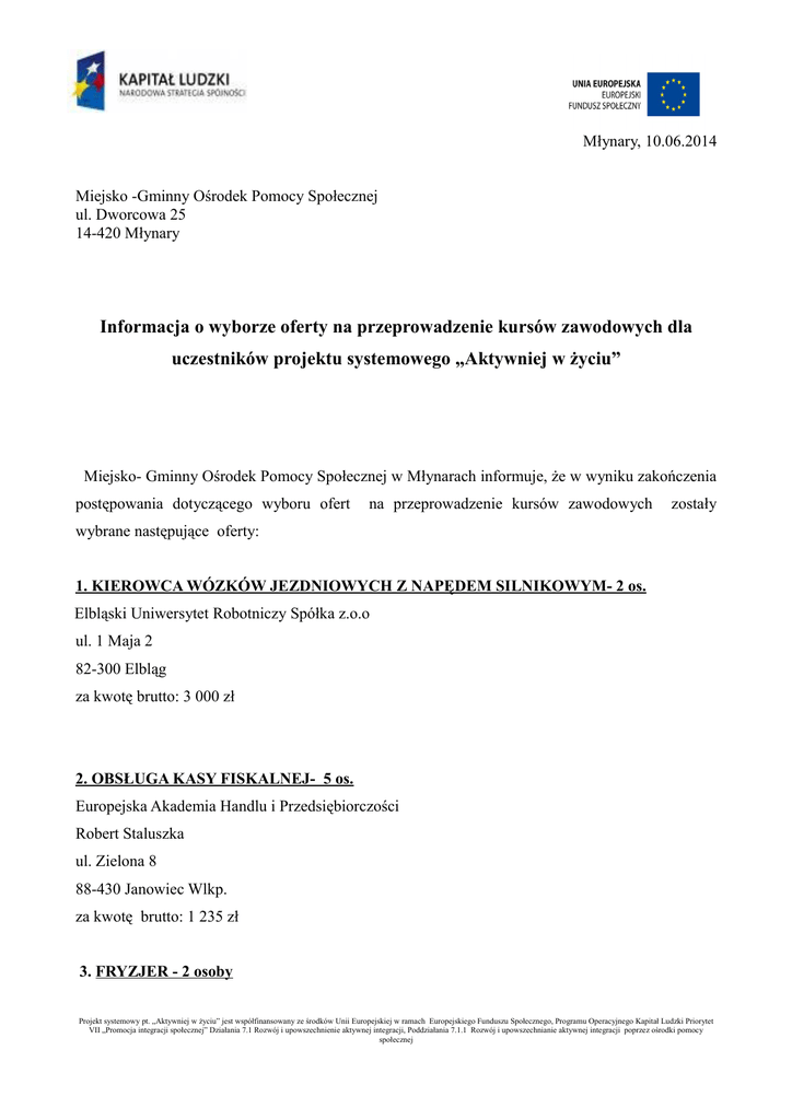 Młynary, 10.06.2014 Miejsko -Gminny Ośrodek Pomocy Społecznej ul. Dworcowa 25 14-420 Młynary Informacja o wyborze oferty na przeprowadzenie kursów zawodowych dla uczestników projektu systemowego „Aktywniej w życiu” Miejsko- Gminny Ośrodek Pomocy Społecznej w Młynarach informuje, że w wyniku zakończenia postępowania dotyczącego wyboru ofert na przeprowadzenie kursów zawodowych zostały wybrane następujące oferty: 1. KIEROWCA WÓZKÓW JEZDNIOWYCH Z NAPĘDEM SILNIKOWYM- 2 os. Elbląski Uniwersytet Robotniczy Spółka z.o.o ul. 1 Maja 2 82-300 Elbląg za kwotę brutto: 3 000 zł 2. OBSŁUGA KASY FISKALNEJ- 5 os. Europejska Akademia Handlu i Przedsiębiorczości Robert Staluszka ul. Zielona 8 88-430 Janowiec Wlkp. za kwotę brutto: 1 235 zł 3. FRYZJER - 2 osoby Projekt systemowy pt. „Aktywniej w życiu” jest współfinansowany ze środków Unii Europejskiej w ramach Europejskiego Funduszu Społecznego, Programu Operacyjnego Kapitał Ludzki Priorytet VII „Promocja integracji społecznej” Działania 7.1 Rozwój i upowszechnienie aktywnej integracji, Poddziałania 7.1.1 Rozwój i upowszechnianie aktywnej integracji poprzez ośrodki pomocy społecznej Ośrodek Kształcenia Edukacja ul.12 Lutego 25 82-300 Elbląg za kwotę brutto: 4 400 zł 4. PRAWO JAZDY KAT B – 8 osób w tym 2 os. doszkalający Ośrodek Szkolenia Kierowców „ELKA” Piotr Dabkiewicz ul .Elbląska 2 14-420 Młynary za kwotę brutto 1 400zł za osobę 5. KUCHARZ-1 os ALFA EDUKACJA CENTRUM SZKOLENIOWE ul. Armii Krajowej 7-8 82-300 Elbląg za kwote brutto: 2 903,13 zł 6. KELNER-1 os ALFA EDUKACJA CENTRUM SZKOLENIOWE ul. Armii Krajowej 7-8 82-300 Elbląg za kwote brutto: 2 903,13 zł 7. OGÓLNOBUDOWALNY-1 os Ośrodek Kształcenia „Edukacja” ul.12 Lutego 25 82-300 Elbląg za kwotę brutto: 2 900zł Projekt systemowy pt. „Aktywniej w życiu” jest współfinansowany ze środków Unii Europejskiej w ramach Europejskiego Funduszu Społecznego, Programu Operacyjnego Kapitał Ludzki Priorytet VII „Promocja integracji społecznej” Działania 7.1 Rozwój i upowszechnienie aktywnej integracji, Poddziałania 7.1.1 Rozwój i upowszechnianie aktywnej integracji poprzez ośrodki pomocy społecznej 8. SPAWACZ -MAG 135 w pierwszej gr. materiałowej , TIG- 141 w pierwszej grupie materiałowej- 2 os Elbląski Uniwersytet Robotniczy Spółka z.o.o ul. 1 Maja 2 82-300 Elbląg za kwotę brutto: 12 000 zł 9. KOSMETYCZKA-1 os Elbląski Uniwersytet Robotniczy Spółka z.o.o ul. 1 Maja 2 82-300 Elbląg za kwotę brutto: 4 000zł 10. KURS KOMPUTEROWY-13 osób ALFA EDUKACJA CENTRUM SZKOLENIOWE ul. Armii Krajowej 7-8 82-300 Elbląg za kwote brutto: 1 985,50 zł Z powodu braku ofert na kurs INSTRUKTOR SYSTEMÓW ALARMOWYCH oraz OPERATOR KOPARKO- ŁADOWARKI nie nastąpiło rozstrzygnięcie dotyczące w/w kursów. Z up. Burmistrza Miasta i Gminy Młynary mgr Jadwiga Piekarska Projekt systemowy pt. „Aktywniej w życiu” jest współfinansowany ze środków Unii Europejskiej w ramach Europejskiego Funduszu Społecznego, Programu Operacyjnego Kapitał Ludzki Priorytet VII „Promocja integracji społecznej” Działania 7.1 Rozwój i upowszechnienie aktywnej integracji, Poddziałania 7.1.1 Rozwój i upowszechnianie aktywnej integracji poprzez ośrodki pomocy społecznej