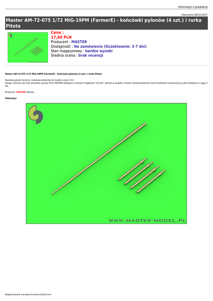 Informacje o produkcie Utworzono 08-03-2017 Master AM-72-075 1/72 MiG-19PM (FarmerE) - końcówki pylonów (4 szt.) i rurka Pitota Cena : 17,60 PLN Producent : MASTER Dostępność : Na zamówienie (Oczekiwanie: 3-7 dni) Stan magazynowy : bardzo wysoki Średnia ocena : brak recenzji Master AM-72-075 1/72 MiG-19PM (FarmerE) - końcówki pylonów (4 szt.) i rurka Pitota Wysokiej jakości toczone, metalowe elementy do modeli w skali 1/72. Uwaga: staramy się mieć wszystkie wyroby firmy MASTER dostępne w naszym magazynie "od ręki". Jednak w związku z dużym zainteresowaniem tymi produktami zaznaczamy je jako dostępne w ciągu 3 dni. Producent: MASTER (Polska) Polecamy! Wygenerowano w programie www.oscGold.com Informacje o produkcie Ważne informacje: - Całkowita cena niniejszego przedmiotu wraz z kosztami przesyłki będzie widoczna po "wrzuceniu" go do koszyka. - Zamówione towary wysyłamy w ciągu 3 dni. Wyjątkiem są przedmioty, gdzie w oknie "Dostępność" jest podany termin oznaczający, że towar będzie sprowadzony na indywidualne zamówienie klienta. Jeśli zamówione zostaną przedmioty dostępne "od ręki" oraz te "na zamówienie" termin wysyłki ulegnie zmianie o czas potrzebny na sprowadzenie towaru. - Wszystkie dostępne w naszym sklepie formy płatności są widoczne w regulaminie sklepu oraz po przejściu do koszyka. Salon Modelarski Jadar-Model Ul. Jagiellońska 58, 03-468 Warszawa (przy Pl.Hallera) tel.(22) 403-34-30 (w sprawie zamówień prosimy dzwonić: (22) 620-05-39) sklep jest czynny w godz.: pon.-pt. 11.oo 19.oo sobota 10.oo 14.oo Wygenerowano w programie www.oscGold.com
