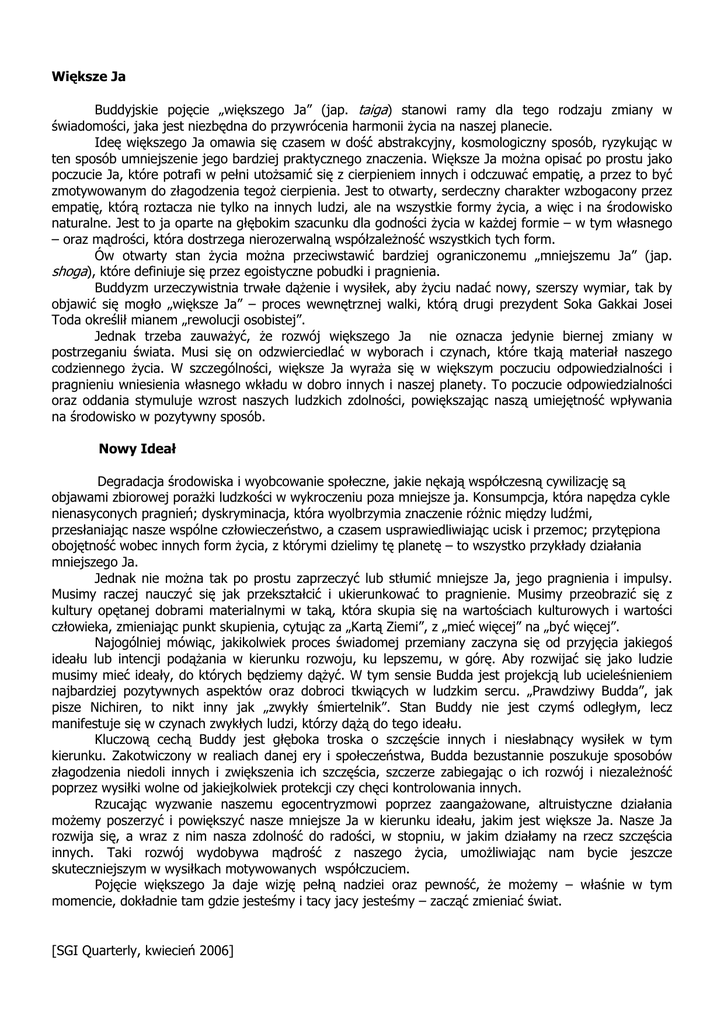 Większe Ja Buddyjskie pojęcie „większego Ja” (jap. taiga) stanowi ramy dla tego rodzaju zmiany w świadomości, jaka jest niezbędna do przywrócenia harmonii życia na naszej planecie. Ideę większego Ja omawia się czasem w dość abstrakcyjny, kosmologiczny sposób, ryzykując w ten sposób umniejszenie jego bardziej praktycznego znaczenia. Większe Ja można opisać po prostu jako poczucie Ja, które potrafi w pełni utożsamić się z cierpieniem innych i odczuwać empatię, a przez to być zmotywowanym do złagodzenia tegoż cierpienia. Jest to otwarty, serdeczny charakter wzbogacony przez empatię, którą roztacza nie tylko na innych ludzi, ale na wszystkie formy życia, a więc i na środowisko naturalne. Jest to ja oparte na głębokim szacunku dla godności życia w każdej formie – w tym własnego – oraz mądrości, która dostrzega nierozerwalną współzależność wszystkich tych form. Ów otwarty stan życia można przeciwstawić bardziej ograniczonemu „mniejszemu Ja” (jap. shoga), które definiuje się przez egoistyczne pobudki i pragnienia. Buddyzm urzeczywistnia trwałe dążenie i wysiłek, aby życiu nadać nowy, szerszy wymiar, tak by objawić się mogło „większe Ja” – proces wewnętrznej walki, którą drugi prezydent Soka Gakkai Josei Toda określił mianem „rewolucji osobistej”. Jednak trzeba zauważyć, że rozwój większego Ja nie oznacza jedynie biernej zmiany w postrzeganiu świata. Musi się on odzwierciedlać w wyborach i czynach, które tkają materiał naszego codziennego życia. W szczególności, większe Ja wyraża się w większym poczuciu odpowiedzialności i pragnieniu wniesienia własnego wkładu w dobro innych i naszej planety. To poczucie odpowiedzialności oraz oddania stymuluje wzrost naszych ludzkich zdolności, powiększając naszą umiejętność wpływania na środowisko w pozytywny sposób. Nowy Ideał Degradacja środowiska i wyobcowanie społeczne, jakie nękają współczesną cywilizację są objawami zbiorowej porażki ludzkości w wykroczeniu poza mniejsze ja. Konsumpcja, która napędza cykle nienasyconych pragnień; dyskryminacja, która wyolbrzymia znaczenie różnic między ludźmi, przesłaniając nasze wspólne człowieczeństwo, a czasem usprawiedliwiając ucisk i przemoc; przytępiona obojętność wobec innych form życia, z którymi dzielimy tę planetę – to wszystko przykłady działania mniejszego Ja. Jednak nie można tak po prostu zaprzeczyć lub stłumić mniejsze Ja, jego pragnienia i impulsy. Musimy raczej nauczyć się jak przekształcić i ukierunkować to pragnienie. Musimy przeobrazić się z kultury opętanej dobrami materialnymi w taką, która skupia się na wartościach kulturowych i wartości człowieka, zmieniając punkt skupienia, cytując za „Kartą Ziemi”, z „mieć więcej” na „być więcej”. Najogólniej mówiąc, jakikolwiek proces świadomej przemiany zaczyna się od przyjęcia jakiegoś ideału lub intencji podążania w kierunku rozwoju, ku lepszemu, w górę. Aby rozwijać się jako ludzie musimy mieć ideały, do których będziemy dążyć. W tym sensie Budda jest projekcją lub ucieleśnieniem najbardziej pozytywnych aspektów oraz dobroci tkwiących w ludzkim sercu. „Prawdziwy Budda”, jak pisze Nichiren, to nikt inny jak „zwykły śmiertelnik”. Stan Buddy nie jest czymś odległym, lecz manifestuje się w czynach zwykłych ludzi, którzy dążą do tego ideału. Kluczową cechą Buddy jest głęboka troska o szczęście innych i niesłabnący wysiłek w tym kierunku. Zakotwiczony w realiach danej ery i społeczeństwa, Budda bezustannie poszukuje sposobów złagodzenia niedoli innych i zwiększenia ich szczęścia, szczerze zabiegając o ich rozwój i niezależność poprzez wysiłki wolne od jakiejkolwiek protekcji czy chęci kontrolowania innych. Rzucając wyzwanie naszemu egocentryzmowi poprzez zaangażowane, altruistyczne działania możemy poszerzyć i powiększyć nasze mniejsze Ja w kierunku ideału, jakim jest większe Ja. Nasze Ja rozwija się, a wraz z nim nasza zdolność do radości, w stopniu, w jakim działamy na rzecz szczęścia innych. Taki rozwój wydobywa mądrość z naszego życia, umożliwiając nam bycie jeszcze skuteczniejszym w wysiłkach motywowanych współczuciem. Pojęcie większego Ja daje wizję pełną nadziei oraz pewność, że możemy – właśnie w tym momencie, dokładnie tam gdzie jesteśmy i tacy jacy jesteśmy – zacząć zmieniać świat. [SGI Quarterly, kwiecień 2006]