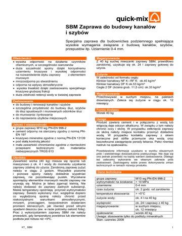 SBM Zaprawa do budowy kanałów i szybów Specjalna zaprawa dla budownictwa podziemnego spełniająca wysokie wymagania związane z budową kanałów, szybów, przepustów itp. Uziarnienie 0-4 mm. Właściwości • wysoka odporność na działanie czynników chemicznych, w szczególności siarczanów • duża szczelność spoiny dzięki korzystnemu uziarnieniu kruszywa i wysokiej odporności na rozwarstwienie styku zaprawy z elementem murowym • mrozoodporna po stwardnieniu • odporna na wpływy atmosferyczne • wysoka trwałość dzięki zastosowaniu specjalnego kruszywa grubszej frakcji • duża zdolność retencji wody w świeżej zaprawie Zastosowanie • do budowy i renowacji kanałów i szybów • szczególna przydatność do budowy śluz, szybów do śluz spustowych i murowanych odcinków śluz • do murowania i tynkowania • do naprawiania ubytków miejscowych Jakość i niezawodność • grupa zaprawy M10 wg PN-EN 998-2 • cement odporny na siarczany zgodny z normą PNEN 197 • kruszywo mineralne zgodne z normą PN-EN 13139 • pod stałą kontrolą jakości • mała zawartość chromianów zgodnie z niemieckimi przepisami technicznymi dot. materiałów niebezpiecznych TRGS 613 Obróbka Zawartość worka (40 kg) miesza się ręcznie lub maszynowo z ok. 4 l wody do momentu uzyskania zaprawy zdatnej do użycia. Zarobioną zaprawę zużyć należy w ciągu 2 godzin. Wszystkie poziome i pionowe spoiny należy dokładnie wypełniać zaprawą, nie pozostawiając pustek. Wyciskane spomiędzy elementów murowych resztki zaprawy nie urywają się. Można je łatwo zgarnąć kielnią. Nie należy dodawać do zaprawy żadnych substancji. Niskie temperatury opóźniają przyrost wytrzymałości zaprawy. Świeżo wykonany mur, względnie dopiero co wygładzoną spoinę należy chronić przed niekorzystnymi warunkami atmosferycznymi, mrozem, przeciągiem, bezpośrednim działaniem promieni słonecznych, jak również przed silnymi opadami deszczu (ew. w razie potrzeby osłonić folią). Prac z wykorzystaniem zaprawy SBM nie należy prowadzić, gdy temperatura powietrza lub elementów podłoża jest niższa niż +5ºC. KT_ SBM Magazynowanie Z 40 kg suchej mieszanki zaprawy SBM, prawidłowo zarobionej, uzyskuje się ok. 24 l zaprawy gotowej do użycia. Zużycie W zależności od formatu cegły: Klinkier kanałowy NF K i RF K: ok.45 kg/m² Klinkier kanałowy DF K: ok.53 kg/m² Cegła 2 DF (ściana grub. 11,5 cm): ok.33 kg/m² Magazynowanie Przechowywać w suchym miejscu, na paletach drewnianych. Zaleca się zużycie w ciągu ok. 12 miesięcy. Forma dostawy Worek 40 kg Uwaga Produkt zawiera cement i w połączeniu z wodą lub wilgocią daje odczyn alkaliczny. W związku z tym należy chronić oczy i skórę. W przypadku zetknięcia zaprawy ze skórą należy miejsce kontaktu przemyć dokładnie wodą. W przypadku kontaktu zaprawy z okiem konieczne jest obfite przemycie oka wodą oraz bezzwłoczne zasięgnięcie porady lekarza. Patrz również nadruk na opakowaniu. Przedstawione informacje uzyskano w wyniku obszernych prób i wieloletniego doświadczenia praktycznego. Nie daje się ono jednak przenieść na każdy wariant zastosowania. Dlatego też zalecamy wykonanie we własnym zakresie prób zastosowań. Zastrzegamy sobie prawo dokonywania zmian technicznych w ramach rozwoju produktu. Dane techniczne grupa zaprawy: wytrzymałość na ściskanie: uziarnienie: czas zużycia: M10 wg PN-EN 998-2 > 10 MPa 0-4 mm ok. 2 godz. od zarobienia temperatura stosowania: > +5°C zużycie wody: ok. 4 l na 40 kg wydajność: magazynowanie: ok. 24 l zaprawy z 40 kg w suchym miejscu, ok. 12 miesięcy opakowanie: worek 40 kg Uwaga: stosowanie tylko do podłoży mineralnych Stan: czerwiec 2008 1 Szersze informacje można uzyskać: quick-mix sp. z o.o. ul. Brzegowa 73 57-100 Strzelin tel. 071/ 392 72 20, 15 fax. 071/ 392 72 23, 24 e-mail: [email protected] www.quick-mix.pl quick-mix sp. z o.o., ul. Brzegowa, 73, 57-100 Strzelin, tel. 071/ 392 72 10, 392 72 23, www.quick-mix.pl, [email protected] doradcy techniczni quick-mix: woj. Lubuskie, Wielkopolskie – tel. 601 927 273; woj. Lubuskie, Wielkopolskie - tel. 609 666 776; woj. Zachodnio-Pomorskie - tel. 601 864 635; woj. Pomorskie, Warmińsko-mazurskie - tel. 609 446 009; woj. Podlaskie, Mazowieckie - tel. 603 393 918; woj. Podlaskie, Mazowieckie - tel. 605 208 628, woj. Kujawsko-pomorskie tel. 601 880 118, woj. Łódzkie - tel. 693 403 790 woj. Podkarpackie, Świętokrzyskie, Lubelskie - tel. 609 446 088 woj. Śląskie, Małopolskie - tel. 603 769 966; woj. Dolnośląskie tel. 601 864 637; woj. Dolnośląskie – tel. 695 250 928; woj. Opolskie - tel. 609 757 353 KT_SBM 2