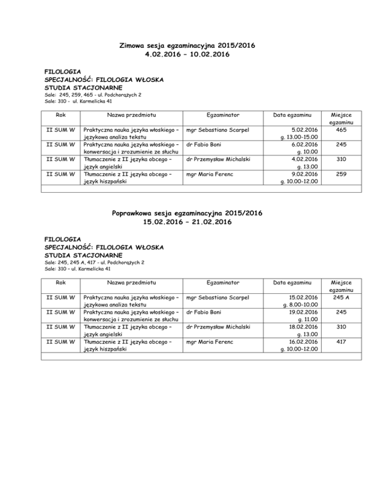 Zimowa sesja egzaminacyjna 2015/2016 4.02.2016 – 10.02.2016 FILOLOGIA SPECJALNOŚĆ: FILOLOGIA WŁOSKA STUDIA STACJONARNE Sale: 245, 259, 465 - ul. Podchorążych 2 Sale: 310 - ul. Karmelicka 41 Rok Nazwa przedmiotu II SUM W Praktyczna nauka języka włoskiego – językowa analiza tekstu Praktyczna nauka języka włoskiego – konwersacja i zrozumienie ze słuchu Tłumaczenie z II języka obcego – język angielski Tłumaczenie z II języka obcego – język hiszpański II SUM W II SUM W II SUM W Egzaminator mgr Sebastiano Scarpel dr Fabio Boni dr Przemysław Michalski mgr Maria Ferenc Data egzaminu 5.02.2016 g. 13.00-15.00 6.02.2016 g. 10.00 4.02.2016 g. 13.00 9.02.2016 g. 10.00-12.00 Miejsce egzaminu 465 245 310 259 Poprawkowa sesja egzaminacyjna 2015/2016 15.02.2016 – 21.02.2016 FILOLOGIA SPECJALNOŚĆ: FILOLOGIA WŁOSKA STUDIA STACJONARNE Sale: 245, 245 A, 417 - ul. Podchorążych 2 Sale: 310 – ul. Karmelicka 41 Rok Nazwa przedmiotu II SUM W Praktyczna nauka języka włoskiego – językowa analiza tekstu Praktyczna nauka języka włoskiego – konwersacja i zrozumienie ze słuchu Tłumaczenie z II języka obcego – język angielski Tłumaczenie z II języka obcego – język hiszpański II SUM W II SUM W II SUM W Egzaminator mgr Sebastiano Scarpel dr Fabio Boni dr Przemysław Michalski mgr Maria Ferenc Data egzaminu 15.02.2016 g. 8.00-10.00 19.02.2016 g. 11.00 18.02.2016 g. 13.00 16.02.2016 g. 10.00-12.00 Miejsce egzaminu 245 A 245 310 417