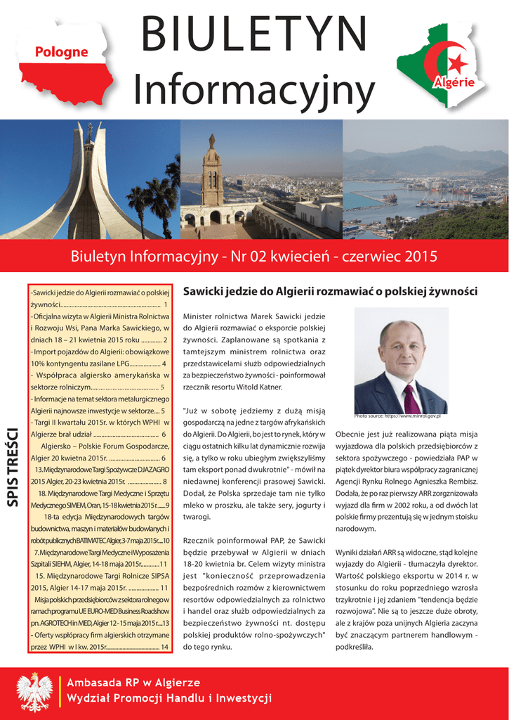 BIULETYN Informacyjny Biuletyn Informacyjny - Nr 02 kwiecień - czerwiec 2015 -Sawicki jedzie do Algierii rozmawiać o polskiej Sawicki jedzie do Algierii rozmawiać o polskiej żywności żywności............................................................... 1 - Oficjalna wizyta w Algierii Ministra Rolnictwa Minister rolnictwa Marek Sawicki jedzie i Rozwoju Wsi, Pana Marka Sawickiego, w do Algierii rozmawiać o eksporcie polskiej żywności. Zaplanowane są spotkania z dniach 18 – 21 kwietnia 2015 roku ............. 2 - Współpraca algiersko amerykańska w tamtejszym ministrem rolnictwa oraz przedstawicelami służb odpowiedzialnych za bezpieczeństwo żywności - poinformował sektorze rolniczym........................................ 5 rzecznik resortu Witold Katner. - Import pojazdów do Algierii: obowiązkowe 10% kontyngentu zasilane LPG.................... 4 - Informacje na temat sektora metalurgicznego "Już w sobotę jedziemy z dużą misją gospodarczą na jedne z targów afrykańskich do Algierii. Do Algierii, bo jest to rynek, który w Obecnie jest już realizowana piąta misja ciągu ostatnich kilku lat dynamicznie rozwija się, a tylko w roku ubiegłym zwiększyliśmy wyjazdowa dla polskich przedsiębiorców z sektora spożywczego - powiedziała PAP w tam eksport ponad dwukrotnie" - mówił na niedawnej konferencji prasowej Sawicki. piątek dyrektor biura współpracy zagranicznej Agencji Rynku Rolnego Agnieszka Rembisz. 18. Międzynarodowe Targi Medyczne i Sprzętu Dodał, że Polska sprzedaje tam nie tylko Dodała, że po raz pierwszy ARR zorgznizowała MedycznegoSIMEM,Oran,15-18kwietnia2015r........9 mleko w proszku, ale także sery, jogurty i twarogi. wyjazd dla firm w 2002 roku, a od dwóch lat polskie firmy prezentują się w jednym stoisku narodowym. Algierii najnowsze inwestycje w sektorze.... 5 SPIS TREŚCI - Targi II kwartału 2015r. w których WPHI w Algierze brał udział ......................................... 6 Algiersko – Polskie Forum Gospodarcze, Algier 20 kwietna 2015r. ................................ 6 13. MiędzynarodoweTargi Spożywcze DJAZAGRO 2015 Algier, 20-23 kwietnia 2015r. ..................... 8 18-ta edycja Międzynarodowych targów budownictwa, maszyn i materiałów budowlanych i robótpublicznychBATIMATECAlgier,3-7maja2015r.....10 7. MiędzynarodoweTargi Medyczne iWyposażenia Szpitali SIEHM, Algier, 14-18 maja 2015r............11 15. Międzynarodowe Targi Rolnicze SIPSA 2015, Algier 14-17 maja 2015r. ................... 11 Misjapolskichprzedsiębiorcówzsektorarolnegow ramachprogramuUE EURO-MEDBusinessRoadshow Rzecznik poinformował PAP, że Sawicki będzie przebywał w Algierii w dniach 18-20 kwietnia br. Celem wizyty ministra jest "konieczność przeprowadzenia bezpośrednich rozmów z kierownictwem resortów odpowiedzialnych za rolnictwo i handel oraz służb odpowiedzialnych za Photo source: https://www.minrol.gov.pl Wyniki działań ARR są widoczne, stąd kolejne wyjazdy do Algierii - tłumaczyła dyrektor. Wartość polskiego eksportu w 2014 r. w stosunku do roku poprzedniego wzrosła trzykrotnie i jej zdaniem "tendencja będzie rozwojowa". Nie są to jeszcze duże obroty, - Oferty wspłópracy firm algierskich otrzymane bezpieczeństwo żywności nt. dostępu polskiej produktów rolno-spożywczych" ale z krajów poza unijnych Algieria zaczyna być znaczącym partnerem handlowym - przez WPHI w I kw. 2015r....................................... 14 do tego rynku. podkreśliła. pn.AGROTECHinMED,Algier12-15maja2015r....13 Wartość eksportu w 2013 r. wyniosła 283 Od ubiegłego roku wzrosło zainteresowanie Rembisz zaznaczyła, że Algierczycy mln dolarów , wobec 110 mln dolarów w zakupem polskich jabłek. Algierczycy nie 2013 r. Import produktów rolno-spożywczych mają tu specjalnych wymagań, importują większość żywności mają z importu. Jedynie samowystarczalni są pod względem z Algierii do Polski w latach 2009-2014 był nieznaczny, największy w 2011 r., kiedy wyniósł 12 mln dolarów, a w pozostałych np. owoce odmiany idared, które wysyłane były też do Rosji. Jak mówiła, kilka lat temu polskie jabłka sprzedawali Hiszpanie, produkcji drobiu. Natomiast jest szansa na eksport wołowiny, ale pod warunkiem, że będzie pochodziła z uboju rytualnego latach nie przekraczał 0,6 mln dolarów. obecnie pośrednik jest niepotrzebny, (halal). bo nasze firmy nawiązały bezpośrednie 20 kwietnia rozpoczynają się targi Djazagro w Algierze, pojedzie na nie 19 firm i instytucji z sektora rolno-spożywczego. Obecna będzie kontakty z algierskimi odbiorcami zaznaczyła Rembisz. Według dyrektor, Algierczycy mają sporo środków na inwestycje, dlatego dobrze widziane są wspólne przedsięwzięcia. Dodała, branża: mleczarska, nasienna, owoce i warzywa świeże i przetworzone, maszyny i Głównym produktem eksportowym na tamten rynek jest mleko w proszku. Zdaniem dyrektor, że dzięki misjom ARR powstała polskoalgierska spółka "Skłody", która zajmuje się urządzenia dla rolnictwa, producenci słodyczy, soków itd - wyliczała Rembisz. to wynika z niedostatecznej organizacji handlu, nie ma tam hurtowni, które podjęłyby się przechowania produktów i systematycznego handlem żywnością. Zaznaczyła, że dotychczas największy dział w eksporcie żywności do Algierii ma sektor mleczarski (66 proc.) oraz producenci zbóż (22 proc.). Coraz silniejszą pozycje zdobywają słodycze i wyroby cukiernicza. Zaznaczyła, że mieszkańcy Afryki Północnej bardzo chętnie jedzą wyroby czekoladowe, ale Algierczycy kupują od nas także karmelki, landrynki, krówki oraz inne słodycze. dostarczania do małych sklepów. Stąd trudno jest sprzedać przetwory mleczarskie. kwietnia w Algierze. W zaplanowanym na poniedziełek forum branży spożywczej wezmą udział ministrowie rolnictwa z obu krajów. Dyrektor zwróciła uwagę, że barierą w rozwoju eksportu jest słaba infrastruktura handlu w Algierii. Żywność sprzeda