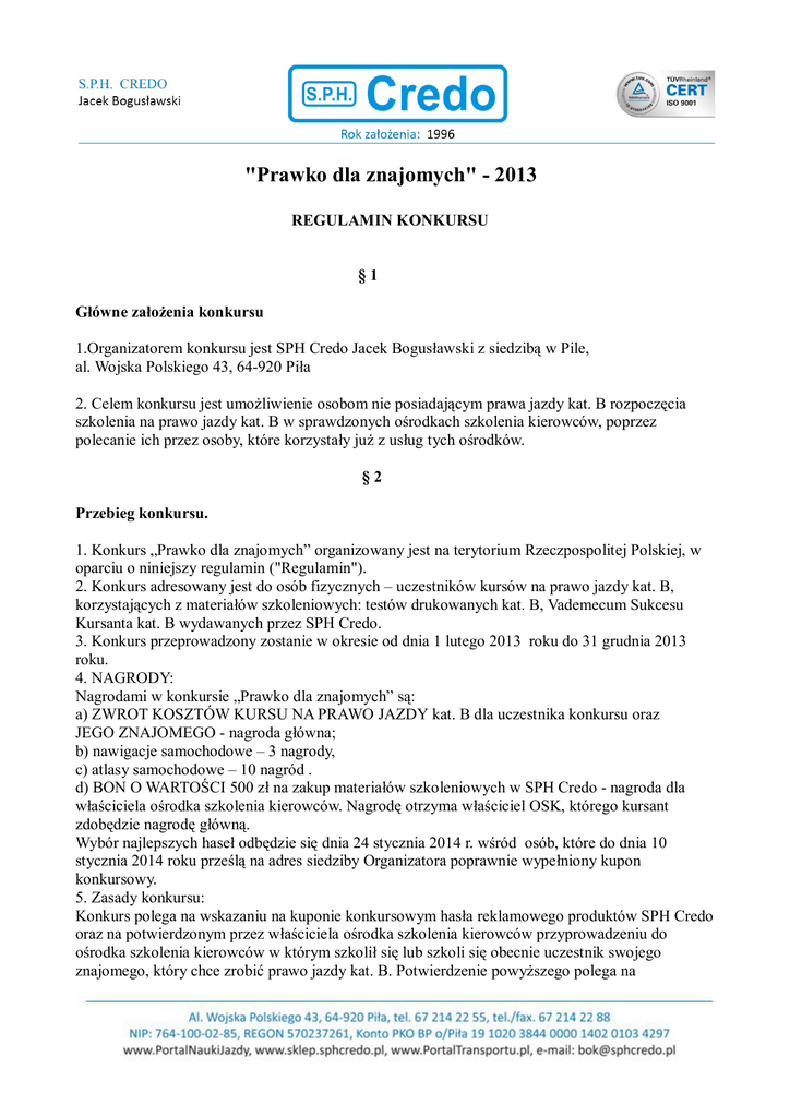 www.portalnaukijazdy.pl. oraz w siedzibie SPH Credo, w Pile, al. Wojska Polskiego 43.