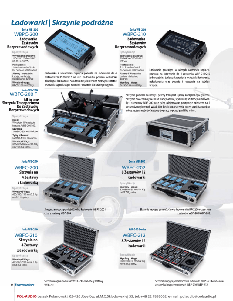 Ładowarki | Skrzynie podróżne Seria WB-200 Seria WB-200 WBPC-200 WBPC-210 Ładowarka Zestawów Bezprzewodowych Ładowarka Zestawów Bezprzewodowych Specyfikacja Specyfikacja Wymagania prądowe: 110-120/220-240 VAC/ 50-60 Hz/15 VA. Podłączenie: 1 do 4 zestawów/2-3 h Do pełnego naładowania. Alarmy i wskaźniki: Ładuję, nie ładuję, naładowana, zwarcie Wymiary i waga: 84x55x155 mm/650 gr. Ładowarka z selektorem napięcia pozwala na ładowanie do 4 zestawów WBP-200/202 na raz. Ładowarka posiada wskaźniki określające ładowanie, naładowanie jak również niezwykle istotne wskaźniki sygnalizujące zwarcie i rozwarcie dla każdego wyjścia. Wymagania prądowe: 90-264 VAC/50-60 Hz/ 20 VA. Podłączenie: 1 do 4 zestawów/4 h do pełnego naładowania. Alarmy i Wskaźniki: Ładuje, nie ładuję, zwarcie. Wymiary i Waga: 84x55x155 mm/290 gr. Ładowarka pracująca w różnych zakresach napięcia, pozwala na ładowanie do 4 zestawów WBP-210/212 jednocześnie. Ładowarka posiada wskaźniki ładowania, naładowania oraz zwarcia i rozwarcia na każdym wyjściu. Seria WB-200 WBFC-200 F Skrzynia pozwala na łatwy i pewny transport i pracę kompletnego systemu. Skrzynia zawiera miejsca 1U na stację bazową, wysuwaną szufladę na ładowarkę i 4 zestawy WBP-200 oraz tylną zdejmowaną pokrywę z miejscem na 5 zestawów nagłownych WAM-100. Dzięki umieszczeniu anten stacji bazowej na górze zestaw może być gotowy do pracy w przeciągu kilku minut. All in one Skrzynia Transportowa Do Zestawów Bezprzewodowych Specyfikacja Rack: Wysokość 1U na stację bazową, WBS-200/202. Szuflada: 1x WBPC-200 + 4xWBP200. Tylny schowek: 5xWAM-100 + akcesoria. Wymiary i Waga: 530x520x180 mm/10.5 Kg net/16.5 Kg pełny. Seria WB-200 Seria WB-200 WBFC-200 WBFC-202 Skrzynia na 4 Zestawy z Ładowarką 8 Zestawów i 2 Ładowarki Specyfikacja Wymiary i Waga: 620x360x130 mm/4.4 Kg net/6.7 Kg pełny. Specyfikacja Wymiary i Waga: 460x350x130 mm/3.6 Kg net/5.1 Kg pełny. Skrzynia mogąca pomieścić jedną ładowarkę WBPC-200 i cztery zestawy WBP-200. Seria WB-200 WB-200 Series WBFC-210 WBFC-212 Skrzynia na 4 Zestawy z Ładowarką 8 Zestawów i 2 Ładowarki Specyfikacja Specyfikacja Wymiary i Waga: 660x390x130 mm/6.2 Kg net/9.8 Kg pełny. Wymiary i Waga: 490x350x130 mm/4.2 Kg net/6 Kg pełny. 6 Skrzynia mogąca pomieścić dwie ładowarki WBPC-200 oraz osiem zestawów WBP-200/WBP-202. Bezprzewodowe Skrzynia mogąca pomieścić WBPC-210 oraz cztery zestawy WBP-210. Skrzynia mogąca pomieścić dwie ładowarki WBPC-210 oraz osiem zestawów bezprzewodowych WBP-210/WBP-212. POL-AUDIO Leszek Polanowski, 05-420 Józefów, ul.M.C.Skłodowskiej 33, tel: +48 22 7893002, e-mail: [email protected]