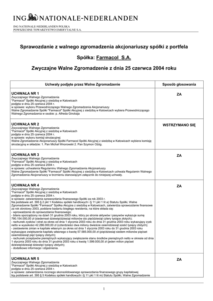 ING NATIONALE-NEDERLANDEN POLSKA POWSZECHNE TOWARZYSTWO EMERYTALNE S.A. Sprawozdanie z walnego zgromadzenia akcjonariuszy spółki z portfela Spółka: Farmacol S.A. Zwyczajne Walne Zgromadzenie z dnia 25 czerwca 2004 roku Uchwały podjęte przez Walne Zgromadzenie UCHWAŁA NR 1 Zwyczajnego Walnego Zgromadzenia "Farmacol" Spółki Akcyjnej z siedzibą w Katowicach podjęta w dniu 25 czerwca 2004 r. w sprawie: wyboru Przewodniczącego Walnego Zgromadzenia Akcjonariuszy Walne Zgromadzenie Spółki "Farmacol" Spółki Akcyjnej z siedzibą w Katowicach wybiera Przewodniczącego Walnego Zgromadzenia w osobie: p. Alfreda Ginckaja UCHWAŁA NR 2 Zwyczajnego Walnego Zgromadzenia "Farmacol" Spółki Akcyjnej z siedzibą w Katowicach podjęta w dniu 25 czerwca 2004 r. w sprawie: wyboru komisji skrutacyjnej Walne Zgromadzenie Akcjonariuszy Spółki Farmacol Spółki Akcyjnej z siedzibą w Katowicach wybiera komisję skrutacyjną w składzie: 1. Pan Michał Wnorowski 2. Pan Szymon Ożóg. UCHWAŁA NR 3 Zwyczajnego Walnego Zgromadzenia "Farmacol" Spółki Akcyjnej z siedzibą w Katowicach podjęta w dniu 25 czerwca 2004 r. w sprawie: uchwalenia Regulaminu Walnego Zgromadzenia Akcjonariuszy Walne Zgromadzenie Spółki "Farmacol" Spółki Akcyjnej z siedzibą w Katowicach uchwala Regulamin Walnego Zgromadzenia Akcjonariuszy w brzmieniu stanowiącym załącznik do niniejszej uchwały. UCHWAŁA NR 4 Zwyczajnego Walnego Zgromadzenia "Farmacol" Spółki Akcyjnej z siedzibą w Katowicach podjęta w dniu 25 czerwca 2004 r. w sprawie: zatwierdzenia sprawozdania finansowego Spółki za rok 2003 r. Na podstawie art. 395 § 2 pkt 1 Kodeksu spółek handlowych i § 11 pkt 1 lit a) Statutu Spółki, Walne Zgromadzenie Spółki "Farmacol" Spółka Akcyjna z siedzibą w Katowicach, zatwierdza sprawozdanie finansowe za rok obrotowy 2003, poddane badaniu biegłego rewidenta, na które składa się: - wprowadzenie do sprawozdania finansowego; - bilans sporządzony na dzień 31 grudnia 2003 roku, który po stronie aktywów i pasywów wykazuje sumę 790.154.000,00 zł (siedemset dziewięćdziesiąt milionów sto pięćdziesiąt cztery tysiące złotych); - rachunek zysków i strat za okres od dnia 1 stycznia 2003 roku do dnia 31 grudnia 2003 roku wykazujący zysk netto w wysokości 42.286.000,00 zł (czterdzieści dwa miliony dwieście osiemdziesiąt sześć tysięcy złotych); - zestawienie zmian w kapitale własnym za okres od dnia 1 stycznia 2003 roku do 31 grudnia 2003 roku wykazujące zwiększenie kapitału własnego o kwotę 57.585.000,00 zł (pięćdziesiąt siedem milionów pięćset osiemdziesiąt pięć tysięcy złotych); - rachunek przepływów pieniężnych wykazujący zwiększenie stanu środków pieniężnych netto w okresie od dnia 1 stycznia 2003 roku do dnia 31 grudnia 2003 roku o kwotę 1.599.000,00 zł (jeden milion pięćset dziewięćdziesiąt dziewięć tysięcy złotych); - dodatkowe informacje i objaśnienia. UCHWAŁA NR 5 Zwyczajnego Walnego Zgromadzenia "Farmacol" Spółki Akcyjnej z siedzibą w Katowicach podjęta w dniu 25 czerwca 2004 r. w sprawie: zatwierdzenia rocznego skonsolidowanego sprawozdania finansowego grupy kapitałowej Na podstawie art. 395 § 5 Kodeksu spółek handlowych i § 11 pkt 1 lit m) Statutu Spółki, Walne Zgromadzenie 1 Sposób głosowania ZA WSTRZYMANO SIĘ ZA ZA ZA ING NATIONALE-NEDERLANDEN POLSKA POWSZECHNE TOWARZYSTWO EMERYTALNE S.A. Spółki "Farmacol" Spółka Akcyjna z siedzibą w Katowicach, zatwierdza roczne skonsolidowane sprawozdanie finansowe za rok obrotowy 2003, poddane badaniu biegłego rewidenta, na które składa się: - wprowadzenie do skonsolidowanego sprawozdania finansowego; - skonsolidowany bilans sporządzony na dzień 31 grudnia 2003 roku, który po stronie aktywów i pasywów zamyka się sumą 869.570.000,00 zł (osiemset sześćdziesiąt dziewięć milionów pięćset siedemdziesiąt tysięcy złotych); - skonsolidowany rachunek zysków i strat za rok obrotowy od dnia 1 stycznia 2003 roku do dnia 31 grudnia 2003 roku wykazujący zysk netto w wysokości 41.692.000,00 zł (czterdzieści jeden milionów sześćset dziewięćdziesiąt dwa tysiące złotych); - zestawienie zmian w skonsolidowanym kapitale własnym za rok obrotowy od 1 stycznia 2003 roku do 31 grudnia 2003 roku wykazujące zwiększenie kapitału własnego o kwotę 56.557.000,00 zł (pięćdziesiąt sześć milionów pięćset pięćdziesiąt siedem tysięcy złotych); - skonsolidowany rachunek przepływów pieniężnych za rok obrotowy od dnia 1 stycznia 2003 roku do dnia 31 grudnia 2003 roku wykazujący zwiększenie stanu środków pieniężnych o kwotę 13.231.000,00 zł (trzynaście milionów dwieście trzydzieści jeden tysięcy złotych); - dodatkowe informacje i objaśnienia. UCHWAŁA NR 6 Zwyczajnego Walnego Zgromadzenia "Farmacol" Spółki Akcyjnej z siedzibą w Katowicach podjęta w dniu 25 czerwca 2004 r. w sprawie: zatwierdzenia sprawozdania Zarządu z działalności Spółki w 2003 roku Na podstawie art. 395 § 2 pkt 1 Kodeksu spółek handlowych i § 11 pkt 1 lit a) Statutu Spółki, Walne Zgromadzenie Spółki "Farmacol" Spółka Akcyjna z siedzibą w Katowicach, zatwierdza sprawozdanie Zarządu z działalności Spółki za rok 2003 r. UCHWAŁA NR 7 Zwyczajnego Walnego Zgromadzenia "Farmacol" Spółki Akcyjnej z siedzibą w Katowicach podjęta w dniu 25 czerwca 2004 r. w sprawie: udzielenia absolutorium Wiceprezesowi Zarządu ds. Handlu i Rozwoju Panu Michałowi Sulencie pełniącemu funkcję do dnia 06.06.2003 r. Na podstawie art. 395 § 2 pkt 3 i § 3 Kodeksu spółek handlowych oraz § 11 pkt 1 lit c) Statutu Spółki, Walne Zgromadzenie Spółki "Farmacol" Spółka Akcyjna z siedzibą w Katowicach udziela absolutorium z wykonania obowiązków Panu Michałowi Sulencie pełniącemu funkcję Wiceprezesa Zarządu ds. Handlu i Rozwoju do dnia 06.06.2003 r. UCHWAŁA NR 8 Zwyczajnego Walnego Zgromadzenia "Farmacol" Spółki Akcyjnej z siedzibą w Katowicach podjęta w dni
