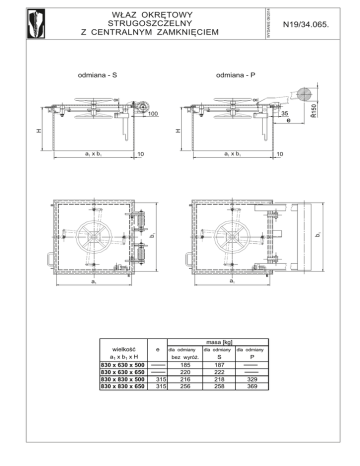WYDANIE 09/2014 WŁAZ OKRĘTOWY STRUGOSZCZELNY Z CENTRALNYM ZAMKNIĘCIEM odmiana - S N19/34.065. odmiana - P 8 8 35 100 H H e Ř150 M M E E B B LL O O M M O O R R a1 x b1 10 b1 10 b1 a1 x b1 a1 a1 masa [kg] wielkość a1 x b 1 x H 830 x 630 x 500 830 x 630 x 650 830 x 830 x 500 830 x 830 x 650 e dla odmiany bez wyróż. 315 315 185 220 216 256 dla odmiany S 187 222 218 258 dla odmiany P 329 369 WYDANIE 09/2014 WŁAZ OKRĘTOWY STRUGOSZCZELNY Z CENTRALNYM ZAMKNIĘCIEM M M E E B B LL O O M M O O R R N19/34.065. 1.Przeznaczenie: Właz stalowy strugoszczelny z zamknięciami klinowymi centralnie zamykanymi przeznaczony jest do montażu w pokładzie statku. 2.Charakterystyka techniczna: Właz skonstruowany jest na bazie normy DIN 83404. Wykonany jest ze stali kat. A (RST-37) wg PN-93/H-92147. Sworznie zamknięć, zawias i mechanizmu centralnego są nierdzewne. Zamknięcia i mechanizm centralny posiadają otwory pod smarowniczki M10x1. Smarowniczki montuje stocznia, nie wchodzą w zakres dostawy. Właz wyposażony jest w blokadę pokrywy w położeniu otwartym oraz w odmianie S w sprężyny, w odmianie P w przeciwciężar do wspomagania unoszenia pokrywy. Właz posiada przyspawane ucha do zamykania pokrywy na kłódkę. Dla wersji K mechanizm centralny zakończony jest od zewnątrz na 19 do zamykania specjalnym kluczem - znajduje się na wyposażeniu włazu. Inne wielkości włazów, wyposażenie oraz wykonanie do uzgodnienia z producentem. 3.Wykończenie: Właz malowany zestawem malarskim nr M23. 4.Podział i oznaczenie: - rodzaje: P - zamocowanie blokady z prawej strony (jak na rysunku) L - zamocowanie blokady z lewej strony - wielkości: a1 x b1 x H - odmiany: P - właz z przeciwciężarem S - właz z regulowaną sprężyną odciążającą bez wyróżnika - właz bez sprężyny lub przeciwciężaru - wersje: K - z kołem tylko od wewnątrz, od zewnątrz zamykany kluczem bez wyróżnika - zamykany kołami z obu stron. Przy zamawianiu włazu należy podać w kolejności: nazwę, rodzaj, wielkość, odmianę, wersję i nr rysunku np. Właz P - 830 x830 x 500 - S - K wg N19/34.065.