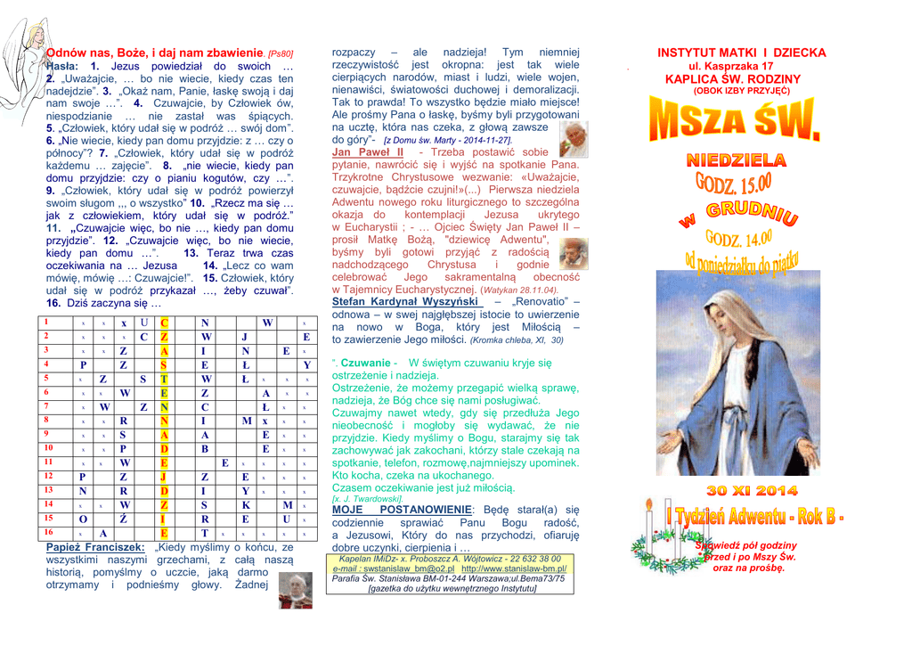 Odnów nas, Boże, i daj nam zbawienie. [Ps80] Hasła: 1. Jezus powiedział do swoich … 2. „Uważajcie, … bo nie wiecie, kiedy czas ten nadejdzie”. 3. „Okaż nam, Panie, łaskę swoją i daj nam swoje …”. 4. Czuwajcie, by Człowiek ów, niespodzianie … nie zastał was śpiących. 5. „Człowiek, który udał się w podróż … swój dom”. 6. „Nie wiecie, kiedy pan domu przyjdzie: z … czy o północy”? 7. „Człowiek, który udał się w podróż każdemu … zajęcie”. 8. „nie wiecie, kiedy pan domu przyjdzie: czy o pianiu kogutów, czy …”. 9. „Człowiek, który udał się w podróż powierzył swoim sługom ,,, o wszystko” 10. „Rzecz ma się … jak z człowiekiem, który udał się w podróż.” 11. „Czuwajcie więc, bo nie …, kiedy pan domu przyjdzie”. 12. „Czuwajcie więc, bo nie wiecie, kiedy pan domu …”. 13. Teraz trwa czas oczekiwania na … Jezusa 14. „Lecz co wam mówię, mówię …: Czuwajcie!”. 15. Człowiek, który udał się w podróż przykazał …, żeby czuwał”. 16. Dziś zaczyna się … 1 x x U C C N 2 x x x Z W 3 x x Z A I 4 P Z S E 5 x Z S T W 6 x x W E Z 7 x W Z N C 8 x x R N I 9 x x S A A 10 x x P D B 11 x x W E E 12 P Z J Z 13 N R D I 14 x x W Z S 15 O Ź I R 16 x A E T x Papież Franciszek: „Kiedy myślimy wszystkimi naszymi grzechami, z historią, pomyślmy o uczcie, jaką otrzymamy i podnieśmy głowy. x W J N Ł Ł x E E A Ł M x E E x x x x x x x x x x x x x x x x E Y K E x x x x x x M U x x x x x o końcu, ze całą naszą darmo Żadnej INSTYTUT MATKI I DZIECKA . ul. Kasprzaka 17 KAPLICA ŚW. RODZINY (OBOK IZBY PRZYJĘĆ) x Y x rozpaczy – ale nadzieja! Tym niemniej rzeczywistość jest okropna: jest tak wiele cierpiących narodów, miast i ludzi, wiele wojen, nienawiści, światowości duchowej i demoralizacji. Tak to prawda! To wszystko będzie miało miejsce! Ale prośmy Pana o łaskę, byśmy byli przygotowani na ucztę, która nas czeka, z głową zawsze do góry”- [z Domu św. Marty - 2014-11-27]. Jan Paweł II - Trzeba postawić sobie pytanie, nawrócić się i wyjść na spotkanie Pana. Trzykrotne Chrystusowe wezwanie: «Uważajcie, czuwajcie, bądźcie czujni!»(...) Pierwsza niedziela Adwentu nowego roku liturgicznego to szczególna okazja do kontemplacji Jezusa ukrytego w Eucharystii ; - … Ojciec Święty Jan Paweł II – prosił Matkę Bożą, "dziewicę Adwentu", byśmy byli gotowi przyjąć z radością nadchodzącego Chrystusa i godnie celebrować Jego sakramentalną obecność w Tajemnicy Eucharystycznej. (Watykan 28.11.04). Stefan Kardynał Wyszyński – „Renovatio” – odnowa – w swej najgłębszej istocie to uwierzenie na nowo w Boga, który jest Miłością – to zawierzenie Jego miłości. (Kromka chleba, XI, 30) W świętym czuwaniu kryje się ostrzeżenie i nadzieja. Ostrzeżenie, że możemy przegapić wielką sprawę, nadzieja, że Bóg chce się nami posługiwać. Czuwajmy nawet wtedy, gdy się przedłuża Jego nieobecność i mogłoby się wydawać, że nie przyjdzie. Kiedy myślimy o Bogu, starajmy się tak zachowywać jak zakochani, którzy stale czekają na spotkanie, telefon, rozmowę,najmniejszy upominek. Kto kocha, czeka na ukochanego. Czasem oczekiwanie jest już miłością. ”. Czuwanie - [x. J. Twardowski]. x MOJE POSTANOWIENIE: Będę starał(a) się codziennie sprawiać Panu Bogu radość, a Jezusowi, Który do nas przychodzi, ofiaruję dobre uczynki, cierpienia i … Kapelan IMiDz- x. Proboszcz A. Wójtowicz - 22 632 38 00 e-mail : [email protected] http://www.stanislaw-bm.pl/ Parafia Św. Stanisława BM-01-244 Warszawa;ul.Bema73/75 [gazetka do użytku wewnętrznego Instytutu] Spowiedź pół godziny przed i po Mszy Św. oraz na prośbę. Okaż nam, Panie, łaske swoją i daj nam swoje zbawienie. (Ps 85,8) Mk 13,33-37 Jezus powiedział do swoich uczniów: Uważajcie, czuwajcie, bo nie wiecie, kiedy czas ten nadejdzie. Bo rzecz ma się podobnie jak z człowiekiem, który udał się w podróż. Zostawił swój dom, powierzył swoim sługom staranie o wszystko, każdemu wyznaczył zajęcie, a odźwiernemu przykazał, żeby czuwał. Czuwajcie więc, bo nie wiecie, kiedy pan domu przyjdzie: z wieczora czy o północy, czy o pianiu kogutów, czy rankiem. By niespodzianie przyszedłszy, nie zastał was śpiących. Lecz co wam mówię, mówię wszystkim: Czuwajcie! Czasem spada na nas nagle, czasem dojrzewa powoli, wspomagane kaprysami losu albo kolejnym fiaskiem naszych dobrych chęci – poczucie, że wszystko dzieje się tak, jakby Boga nie było. Mamy wrażenie, jakbyśmy błąkali się po wielkim domu, który nam zostawił, wyjeżdżając w daleką podróż. Czy rzeczywiście tu był? Czy powróci kiedyś? Skąd tyle zła? Jak długo jeszcze? Zgiełk pytań, na które nie możemy znaleźć odpowiedzi. A może przestaliśmy już pytać? Dziś zaczyna się Adwent – czas powrotu do zapomnianych pytań, czas spodziewania się, czas nadziei. [Wojciech Czwichocki OP, „Oremus” grudzień 2008, s. 4]. I Tydzień Adwentu – Maranatha Oczekujmy czujnie i radośnie, ponieważ Pan niebawem przyjdzie: On przychodzi, aby uwolnić Swój lud od grzechu. Zapraszamy na Roraty. Msza roratnia – to nabożeństwo wotywne o Najświętszej Maryi Pannie. - Charakterystycznym elementem Rorat jest zapalanie specjalnej świecy ozdobionej białą wstęgą. Świeca ta (roratka) umieszczana jest w pobliżu ołtarza jedynie w Adwencie. Symbolizuje Najświętszą Maryję Pannę. MODLITWA WIERNYCH 1. Módlmy się za Ojca świętego, biskupów i kapłanów, aby starczyło im Twojej łaski w codziennej służbie … 2. Módlmy się za Polskę i rządzących naszym krajem, aby odczytywali Prawo Boże w swoich sercach i zawsze nim się kierowali … 3. Módlmy się za dzieci z naszego Instytutu, ich rodziny, lekarzy, pielęgniarki aby w radości doświadczali Twojej Miłości. … 4. Módlmy się za nas, abyśmy słuchali, wszystkich słów naszego Króla, Jezusa Chrystusa,