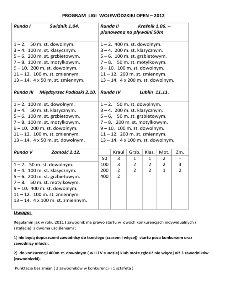 PROGRAM LIGI WOJEWÓDZKIEJ OPEN – 2012 Runda I Świdnik 1.04. 1 – 2. 50 m. st. dowolnym. 3 – 4. 100 m. st. klasycznym. 5 – 6. 200 m. st. grzbietowym. 7 – 8. 100 m. st. motylkowym. 9 – 10. 200 m. st. dowolnym. 11 – 12. 100 m. st. zmiennym. 13 – 14. 4 x 50 m. st. zmiennym. Runda III Runda II Kraśnik 1.06. – planowana na pływalni 50m 1 – 2. 400 m. st. dowolnym. 3 – 4. 200 m. st. klasycznym. 5 – 6. 100 m. st. grzbietowym. 7 – 8. 50 m. st. motylkowym. 9 – 10. 100 m. st. dowolnym. 11 – 12. 200 m. st. zmiennym. 13 – 14. 4 x 200 m. st. dowolnym. Międzyrzec Podlaski 2.10. Runda IV Lublin 11.11. 1 – 2. 100 m. st. dowolnym. 3 – 4. 50 m. st. klasycznym. 5 – 6. 100 m. st. grzbietowym. 7 – 8. 100 m. st. motylkowym. 9 – 10. 200 m. st. dowolnym. 11 – 12. 100 m. st. zmiennym. 13 – 14. 4 x 50 m. st. dowolnym. 1 – 2. 50 m. st. dowolnym. 3 – 4. 200 m. st. klasycznym. 5 – 6. 50 m. st. grzbietowym. 7 – 8. 200 m. st. motylkowym. 9 – 10. 100 m. st. dowolnym. 11 – 12. 200 m. st. zmiennym. 13 – 14. 4 x 100 m. st. dowolnym. Runda V Kraul Grzb. Klas. Mot. 50 3 1 1 2 100 3 2 2 2 200 2 2 2 1 400 2 Zamość 2.12. 1 – 2. 50 m. st. dowolnym. 3 – 4. 100 m. st. klasycznym. 5 – 6. 200 m. st. grzbietowym. 7 – 8. 50 m. st. motylkowym. 9 – 10. 400 m. st. dowolnym. 11 – 12. 100 m. st. zmiennym. 13 – 14. 4 x 100 m. st. zmiennym. Zm. 3 2 Uwaga: Regulamin jak w roku 2011 ( zawodnik ma prawo startu w dwóch konkurencjach indywidualnych i sztafecie) z dwoma uściśleniami : 1) nie będą dopuszczeni zawodnicy do trzeciego (czasem i więcej) startu poza konkursem oraz zawodnicy młodsi. 2) do konkurencji 400m st. dowolnym ( w II i V rundzie) klub może zgłosić nie więcej niż 3 zawodników (zawodniczki). Punktacja bez zmian ( 2 zawodników w konkurencji i 1 sztafeta ).