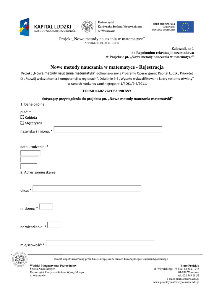 Projekt „Nowe metody nauczania w matematyce” Nr POKL.09.04.00-14-133/11 Załącznik nr 1 do Regulaminu rekrutacji i uczestnictwa w Projekcie pt. „Nowe metody nauczania w matematyce” Nowe metody nauczania w matematyce - Rejestracja Projekt „Nowe metody nauczania matematyki” dofinansowany z Programu Operacyjnego Kapitał Ludzki, Priorytet IX „Rozwój wykształcenia i kompetencji w regionach”, Działanie 9.4 „Wysoko wykwalifikowane kadry systemu oświaty” w ramach konkursu zamkniętego nr 1/POKL/9.4/2011. FORMULARZ ZGŁOSZENIOWY dotyczący przystąpienia do projektu pn. „Nowe metody nauczania matematyki” 1. Dane ogólne płeć: * Kobieta Mężczyzna nazwisko i imiona: * data urodzenia: * 2. Adres zamieszkania ulica: * nr domu: * nr mieszkania: * miejscowość: * Projekt współfinansowany przez Unię Europejską w ramach Europejskiego Funduszu Społecznego Wydział Matematyczno-Przyrodniczy Szkoła Nauk Ścisłych Uniwersytet Kardynała Stefana Wyszyńskiego w Warszawie Biuro Projektu ul. Wóycickiego 1/3 Bud. 12 pok. 1248 01-938 Warszawa tel. 022 569 68 52 e-mail: [email protected] www.projekty.matematyka.uksw.edu.pl Projekt „Nowe metody nauczania w matematyce” Nr POKL.09.04.00-14-133/11 kod: * 3. Dane kontaktowe tel. domowy: * tel. służbowy: * tel. kom.: * e-mail: * 4. Wykształcenie nazwa wyższej uczelni (szkoły): * rok ukończenia: * tytuł: * 5. Obecne miejsce zatrudnienia 6. Niepełnosprawn-y/-a ruchowo Tak Projekt współfinansowany przez Unię Europejską w ramach Europejskiego Funduszu Społecznego Wydział Matematyczno-Przyrodniczy Szkoła Nauk Ścisłych Uniwersytet Kardynała Stefana Wyszyńskiego w Warszawie Biuro Projektu ul. Wóycickiego 1/3 Bud. 12 pok. 1248 01-938 Warszawa tel. 022 569 68 52 e-mail: [email protected] www.projekty.matematyka.uksw.edu.pl Projekt „Nowe metody nauczania w matematyce” Nr POKL.09.04.00-14-133/11 Nie 7. Przynależność do delegatury Kuratorium Oświaty Ciechanów Ostrołęka Płock Siedlce Radom Warszawa 8. Edycja Proszę wybrać preferowany termin zajęć: * I edycja II edycja III edycja OŚWIADCZENIA UCZESTNIKA Deklaruję przystąpienie do udziału w projekcie „Nowe metody nauczania matematyki” w ramach Priorytetu IX – Rozwój wykształcenia i kompetencji w regionach Działanie 9.4. Wysoko wykwalifikowane kadry systemu oświaty – Programu Operacyjnego Kapitał Ludzki 2007-2013. Oświadczam, że jestem świadomy/a, że mój udział w projekcie jest współfinansowany przez Unię Europejską w ramach Europejskiego Funduszu Społecznego. Oświadczam, że informacje zawarte w formularzu zgłoszeniowym do projektu „Nowe metody nauczania matematyki” są zgodne z prawdą. Oświadczam, iż na dzień złożenia formularza zgłoszeniowego do projektu „Nowe metody nauczania matematyki”, spełniam wymagane warunki: 1. jestem osobą wykonującą pracę na podstawie umowy o pracę w placówce oświatowej, 2. z własnej inicjatywy jestem zainteresowany/a nabyciem nowych, uzupełnieniem lub podwyższeniem kwalifikacji i umiejętności. Oświadczam, iż zgodnie z Ustawą z dnia 29 sierpnia 1997 r. o ochronie danych osobowych (jednolity tekst Projekt współfinansowany przez Unię Europejską w ramach Europejskiego Funduszu Społecznego Wydział Matematyczno-Przyrodniczy Szkoła Nauk Ścisłych Uniwersytet Kardynała Stefana Wyszyńskiego w Warszawie Biuro Projektu ul. Wóycickiego 1/3 Bud. 12 pok. 1248 01-938 Warszawa tel. 022 569 68 52 e-mail: [email protected] www.projekty.matematyka.uksw.edu.pl Projekt „Nowe metody nauczania w matematyce” Nr POKL.09.04.00-14-133/11 Dz. U. Nr 101 poz. 926 z dnia 2002r.) wyrażam zgodę na gromadzenie, przetwarzanie i przekazywanie moich danych osobowych, w tym danych wrażliwych dla potrzeb rekrutacji, monitorowania i ewaluacji projektu „Nowe metody nauczania matematyki” realizowanego w ramach Działania 9.4. PO KL. Przyjmuję do wiadomości, że złożenie formularza zgłoszeniowego nie jest jednoznaczne z przyjęciem mnie do projektu. Projekt współfinansowany przez Unię Europejską w ramach Europejskiego Funduszu Społecznego Wydział Matematyczno-Przyrodniczy Szkoła Nauk Ścisłych Uniwersytet Kardynała Stefana Wyszyńskiego w Warszawie Biuro Projektu ul. Wóycickiego 1/3 Bud. 12 pok. 1248 01-938 Warszawa tel. 022 569 68 52 e-mail: [email protected] www.projekty.matematyka.uksw.edu.pl