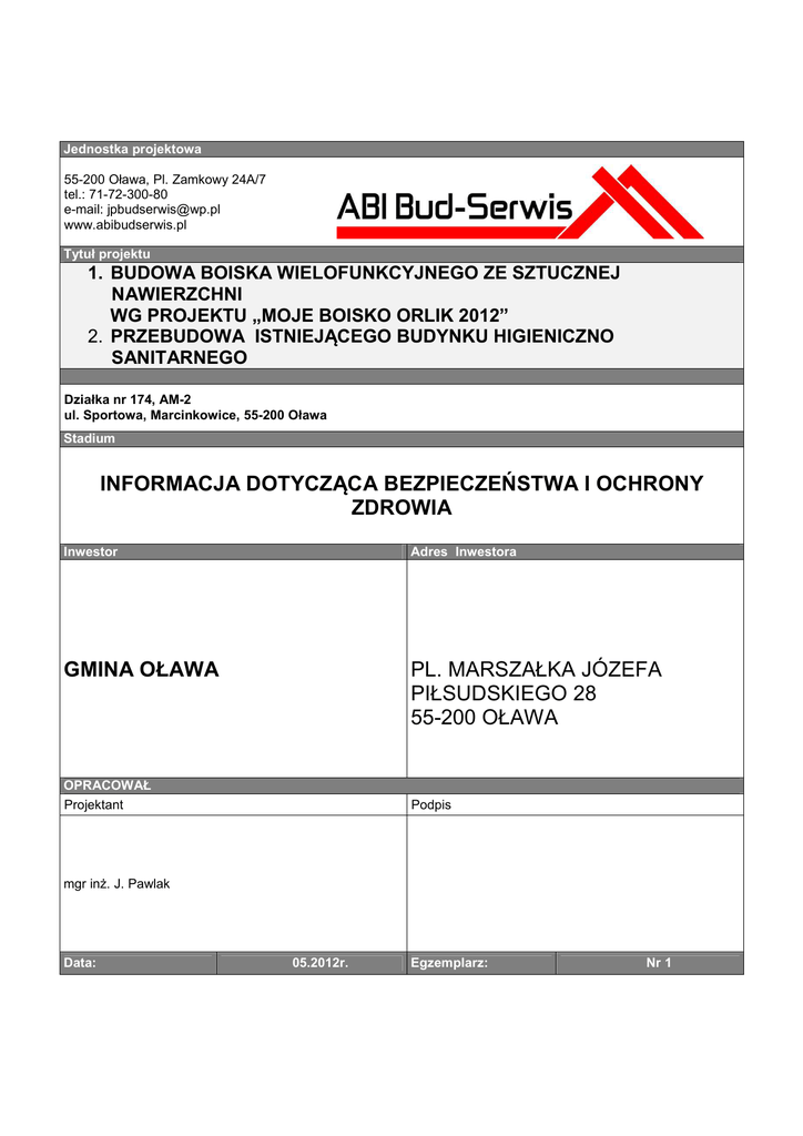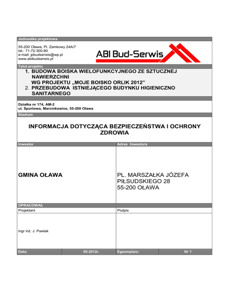 Jednostka projektowa 55-200 Oława, Pl. Zamkowy 24A/7 tel.: 71-72-300-80 e-mail: [email protected] www.abibudserwis.pl Tytuł projektu 1. BUDOWA BOISKA WIELOFUNKCYJNEGO ZE SZTUCZNEJ NAWIERZCHNI WG PROJEKTU „MOJE BOISKO ORLIK 2012” 2. PRZEBUDOWA ISTNIEJĄCEGO BUDYNKU HIGIENICZNO SANITARNEGO Działka nr 174, AM-2 ul. Sportowa, Marcinkowice, 55-200 Oława Stadium INFORMACJA DOTYCZĄCA BEZPIECZEŃSTWA I OCHRONY ZDROWIA Inwestor Adres Inwestora GMINA OŁAWA PL. MARSZAŁKA JÓZEFA PIŁSUDSKIEGO 28 55-200 OŁAWA OPRACOWAŁ Projektant Podpis mgr inż. J. Pawlak Data: 05.2012r. Egzemplarz: Nr 1 CZĘŚĆ OPISOWA 1. ZAKRES ROBÓT DLA CAŁEGO ZAMIERZENIA BUDOWLANEGO Przedmiotowa inwestycja obejmuje budowę boiska wielofunkcyjnego ze sztucznej nawierzchni wg programu „Moje boisko Orlik 2012”, na terenie gminnego terenu sportowego zlokalizowanego w Marcinkowicach, obejmującej: - budowę boisk ze sztucznej nawierzchni wg projektu „Orlik 2012”, - przebudowa istniejącego budynku higieniczno sanitarnego, - budowę drenażu i sieci kanalizacji deszczowej wraz z szczelnym zbiornikiem na wody opadowe o pojemności 10m3, - oświetlenia terenu; do realizacji na działce nr 174, AM-2 w Marcinkowicach przy ul. Sportowej. Prace budowlane przedmiotowej inwestycji obejmują również roboty przy wykonaniu utwardzonych chodników i placów, małej architektury oraz uporządkowanie terenu. Realizacja przedmiotowej budowy wykonywana będzie w jednym etapie inwestycyjnych obejmujących wykonanie wszystkich obiektów i zamierzeń projektowych. 2. KOLEJNOŚĆ REALIZACJI OBIEKTU Przedmiotowe obiekty to: - boiska ze sztuczną nawierzchnią - przebudowywany istniejący budynek higieniczno sanitarny Projektowane boiska ze sztuczną nawierzchnią opracowane wg programu „Moje boisko Orlik 2012”, wykonane będą na terenie gminnego terenu sportowego zlokalizowanego w Marcinkowicach. Pod nawierzchnią projektowanych boiska należy wykonać drenaż wg projektu branży sanitarnej, połączonej ze szczelnym zbiornikiem na wodę opadową o poj. 10m3. Projektowane jest również oświetlenie nawierzchni boiska 8 lampami o wys. 8,00m Projektowane boiska ze sztuczną nawierzchnią wykonane będą wg załączonego programu i specyfikacji „Moje boisko Orlik 2012”. Boiska wykonane będą na podbudowie przepuszczalnej z kruszyw kamiennych oraz miału o zróżnicowanej frakcji. Wykończenie nawierzchni boiska do piłki nożnej wykonane ze sztucznej nawierzchni trawy syntetycznej, a boisko wielofunkcyjne z warstwy nawierzchni poliuretanowej EPDM. Boisko ogrodzone będzie ogrodzeniem o wysokości 4,00m ze słupkami na fundamentach betonowych. Budynek zaplecza higieniczno-sanitarnego jest wolnostojącym obiektem na terenach sportowych w luźnej zabudowie jednorodzinnej. Przebudowywany budynek to obiekt higieniczno – sanitarny, znajdujący się na terenie Inwestora. Przedmiotowy budynek – to obiekt parterowy, niski niepodpiwniczony, o konstrukcji murowanej, ze stropem drewnianym, dachem dwuspadowym niesymetrycznym, przykrytym blachą trapezową. Obiekt założony na planie prostokąta. Do obiektów doprowadzone są przyłącze wody oraz energii elektrycznej. Wjazd na teren działki zaplanowano istniejącym od strony drogi ul. Sportowej Roboty budowlane obejmować będą typowe działania w zakresie robót budowlanomontażowych w kilku etapach realizacji zadania inwestycyjnego: - roboty ziemne, - roboty fundamentowe - roboty murowe, - roboty betonowe i montażowe słupów - roboty dekarskie związane i wykonaniem konstrukcji i pokrycia dachu - roboty instalacyjne - roboty wykończeniowe - wykonanie dodatkowego ocieplenia elewacji obiektu - roboty zewnętrzne – instalacja drenażu pod płytą boisk, nawierzchni dróg i placów , mała architektura, uporządkowanie terenu. 3. WYKAZ ISTNIEJĄCYCH OBIEKTÓW BUDOWLANYCH Działka dz. nr 174 AM-2, na której zrealizowana ma być inwestycja budowy zespołu boisk sportowych ze sztucznej nawierzchni wg programu „Orlik 2012” oraz inne elementy zagospodarowania terenu, tworzą regularny kształt przybliżony do prostokąta. Na przedmiotowej działce znajduje się obiekt, użytkowane jako zaplecze higieniczno – sanitarne dla otwartych terenów sportowych, ogrodzone wysokim piłko chwytem boisko do piłki tenisowej, ogrodzone boisko do piłki nożnej (wraz z dwoma stalowymi bramkami i piłkochwytem), wał ziemny z betonowa trybuną z dwoma rzędami plastikowych krzesełek oraz stalowa kratownicowa wieża telefonii komórkowej w wydzielonym ogrodzeniem fragmencie działki. Najbliższe obiekty zlokalizowane są na działkach sąsiednich od strony wschodniej i zachodniej - przy ul. Sportowej, ul. Wiśniowej i ul. Spacerowej.. Nieruchomość jest własnością Inwestora – Gminy Oława. 4. WSKAZANIE ELEMENTÓW ZAGOSPODAROWANIA DZIAŁKI STWARZAJĄCE ZAGROŻENIE BEZPIECZEŃSTWA I ZDROWIA LUDZI Prowadzone przy tym obiekcie prace budowlane mogą stanowić zagrożenie dla przechodzących chodnikami osób, dla ruchu pojazdów samochodowych w ul. Sportowej, ul. Wiśniowej i ul. Spacerowej. Zagrożenie stanowić może również ruch pojazdów samochodowych wywożących materiał z wykopów oraz zaopatrujących budowę w materiały budowlane. Teren lokalizacji budynków na czas prowadzonych robót budowlanych należy ogrodzić oraz oznakować tablicami ostrzegawczymi. 5. PRZEWIDYWANE ZAGROŻENIA WYSTĘPUJĄCE PRZY REALIZACJI ROBÓT BUDOWLANYCH Zagrożenia mogące występować przy realizacji przedmiotowej inwestycji określono na podstawie rozporządzeń ministra infrastruktury z dnia 27 sierpnia 2002r – Dz. U. 02.151.1256 oraz z dnia 6 lutego 2003r - Dz.U. 03.47.401. Przy realizacji przedmiotowych zamierzeń wystąpić mogą następujące zagrożenia: - upadek pracowników z wysokości - niebezpieczeństwo dla przebywających w sąsiedztwie osób– upadek materiałów, narzedzi, elementów konstrukcji z wysokości - ruch pojazdów transportowych przez tereny ogólnodostępne - wykony