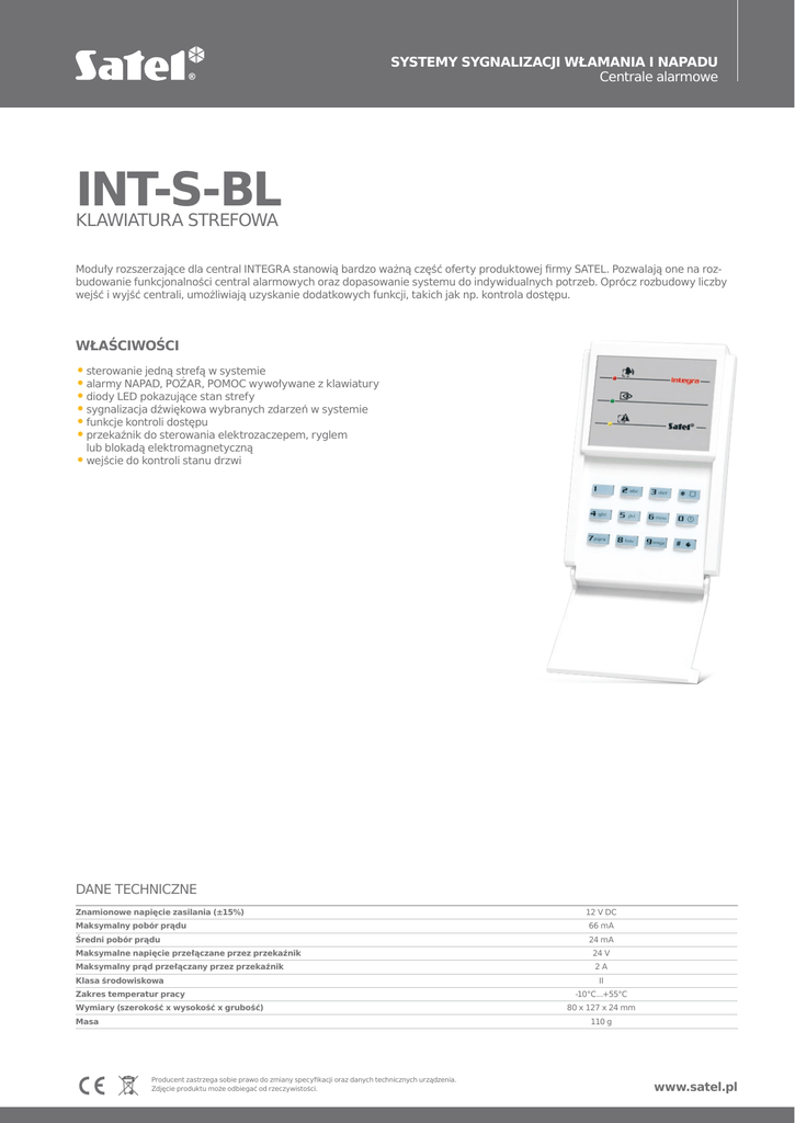 SYSTEMY SYGNALIZACJI WŁAMANIA I NAPADU Centrale alarmowe INT-S-BL KLAWIATURA STREFOWA Moduły rozszerzające dla central INTEGRA stanowią bardzo ważną część oferty produktowej firmy SATEL. Pozwalają one na rozbudowanie funkcjonalności central alarmowych oraz dopasowanie systemu do indywidualnych potrzeb. Oprócz rozbudowy liczby wejść i wyjść centrali, umożliwiają uzyskanie dodatkowych funkcji, takich jak np. kontrola dostępu. WŁAŚCIWOŚCI ••sterowanie jedną strefą w systemie ••alarmy NAPAD, POŻAR, POMOC wywoływane z klawiatury ••diody LED pokazujące stan strefy ••sygnalizacja dźwiękowa wybranych zdarzeń w systemie ••funkcje kontroli dostępu ••przekaźnik do sterowania elektrozaczepem, ryglem lub blokadą elektromagnetyczną ••wejście do kontroli stanu drzwi DANE TECHNICZNE Znamionowe napięcie zasilania (±15%) 12 V DC Maksymalny pobór prądu 66 mA Średni pobór prądu 24 mA Maksymalne napięcie przełączane przez przekaźnik 24 V Maksymalny prąd przełączany przez przekaźnik 2A Klasa środowiskowa Zakres temperatur pracy Wymiary (szerokość x wysokość x grubość) Masa II -10°C...+55°C 80 x 127 x 24 mm 110 g Producent zastrzega sobie prawo do zmiany specyfikacji oraz danych technicznych urządzenia. Zdjęcie produktu może odbiegać od rzeczywistości. www.satel.pl