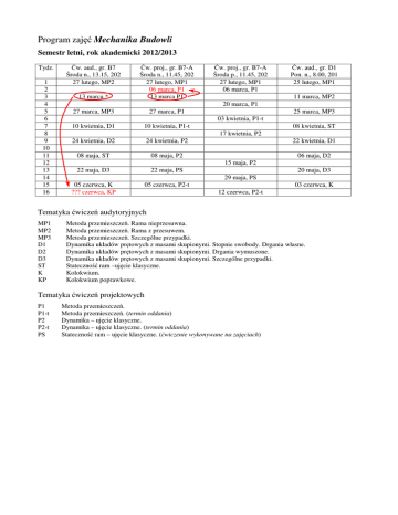 Program zajęć Mechanika Budowli Semestr letni, rok akademicki 2012/2013 Tydz. 1 2 3 4 5 6 7 8 9 10 11 12 13 14 15 16 Ćw. aud., gr. B7 Środa n., 13.15, 202 27 lutego, MP2 13 marca * Ćw. proj., gr. B7-A Środa n., 11.45, 202 27 lutego, MP1 06 marca, P1 13 marca P1 Ćw. proj., gr. B7-A Środa p., 11.45, 202 27 lutego, MP1 06 marca, P1 Ćw. aud., gr. D1 Pon. n., 8.00, 201 25 lutego, MP1 11 marca, MP2 20 marca, P1 27 marca, MP3 27 marca, P1 25 marca, MP3 03 kwietnia, P1-t 10 kwietnia, D1 10 kwietnia, P1-t 08 kwietnia, ST 17 kwietnia, P2 24 kwietnia, D2 24 kwietnia, P2 08 maja, ST 08 maja, P2 22 kwietnia, D1 06 maja, D2 15 maja, P2 22 maja, D3 22 maja, PS 20 maja, D3 29 maja, PS 05 czerwca, K ??? czerwca, KP 05 czerwca, P2-t 03 czerwca, K 12 czerwca, P2-t Tematyka ćwiczeń audytoryjnych MP1 MP2 MP3 D1 D2 D3 ST K KP Metoda przemieszczeń. Rama nieprzesuwna. Metoda przemieszczeń. Rama z przesuwem. Metoda przemieszczeń. Szczególne przypadki. Dynamika układów prętowych z masami skupionymi. Stopnie swobody. Drgania własne. Dynamika układów prętowych z masami skupionymi. Drgania wymuszone. Dynamika układów prętowych z masami skupionymi. Szczególne przypadki. Stateczność ram –ujęcie klasyczne. Kolokwium. Kolokwium poprawkowe. Tematyka ćwiczeń projektowych P1 P1-t P2 P2-t PS Metoda przemieszczeń. Metoda przemieszczeń. (termin oddania) Dynamika – ujęcie klasyczne. Dynamika – ujęcie klasyczne. (termin oddania) Stateczność ram – ujęcie klasyczne. (ćwiczenie wykonywane na zajęciach)