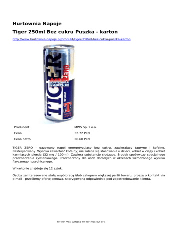 Hurtownia Napoje Tiger 250ml Bez cukru Puszka - karton http://www.hurtownia-napoje.pl/produkt/tiger-250ml-bez-cukru-puszka-karton Producent MWS Sp. z o.o. Cena 32.72 PLN Cena netto 26.60 PLN TIGER ZERO - gazowany napój energetyzujący bez cukru, zawierający taurynę i kofeinę. Pasterysowany. Wysoka zawartość kofeiny; nie zaleca się stosowania u dzieci, kobiet w ciąży i kobiet karmiących piersią (32 mg / 100ml). Zawiera substancje słodzące. Środek spożywczy specjalnego przeznaczenia żywieniowego. Przeznaczony dla osób dorosłych w okresach wzmożonego wysiłku fizycznego i psychicznego. W kartonie znajduje się 12 sztuk. Osoby zainteresowane stałą współpracą i/lub zakupem większej partii towaru, proszę o kontakt via e-mail - prześlemy ofertę cenową, skorygowaną odpowiednio pod zapotrzebowanie klienta. TXT_PDF_PAGE_NUMBER 1 TXT_PDF_PAGE_OUT_OF 1