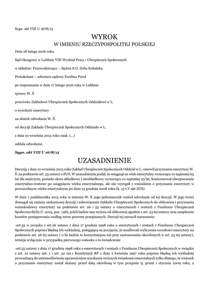 Decyzją z dnia 10 września 2015 roku Zakład Ubezpieczeń Społecznych Oddział w L. omówił przyznania emerytury W.