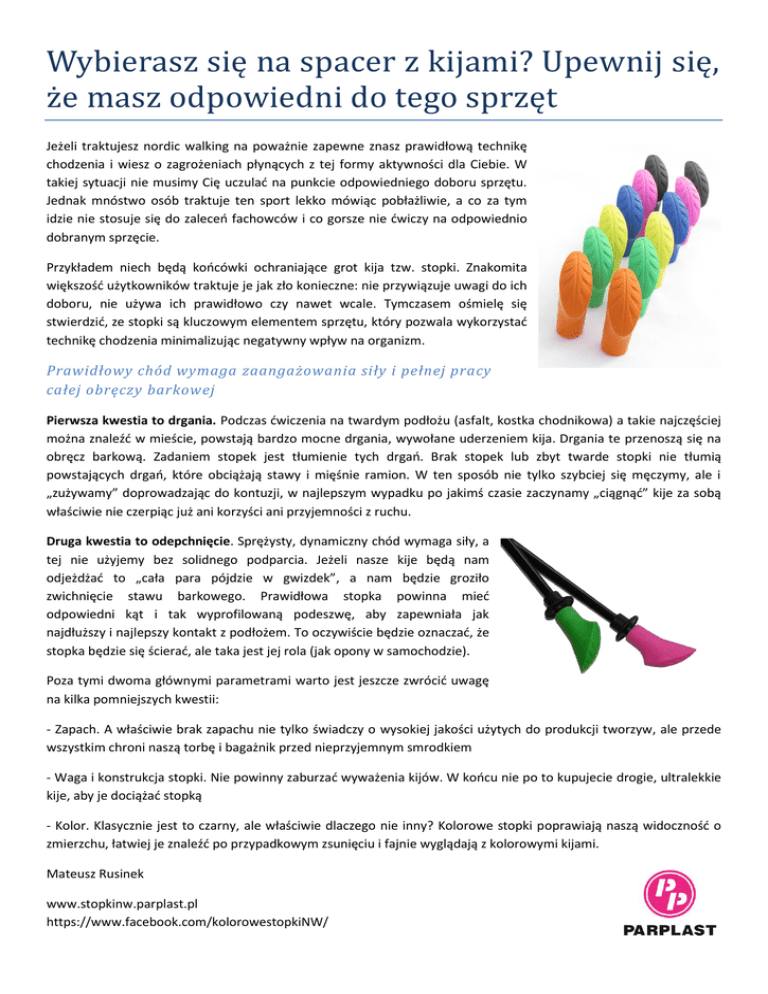 Wybierasz się na spacer z kijami? Upewnij się, ze masz odpowiedni do tego sprzęt Jeżeli traktujesz nordic walking na poważnie zapewne znasz prawidłową technikę chodzenia i wiesz o zagrożeniach płynących z tej formy aktywności dla Ciebie. W takiej sytuacji nie musimy Cię uczulać na punkcie odpowiedniego doboru sprzętu. Jednak mnóstwo osób traktuje ten sport lekko mówiąc pobłażliwie, a co za tym idzie nie stosuje się do zaleceń fachowców i co gorsze nie ćwiczy na odpowiednio dobranym sprzęcie. Przykładem niech będą końcówki ochraniające grot kija tzw. stopki. Znakomita większość użytkowników traktuje je jak zło konieczne: nie przywiązuje uwagi do ich doboru, nie używa ich prawidłowo czy nawet wcale. Tymczasem ośmielę się stwierdzić, ze stopki są kluczowym elementem sprzętu, który pozwala wykorzystać technikę chodzenia minimalizując negatywny wpływ na organizm. Prawidłowy chód wymaga zaangażowania siły i pełnej pracy całej obręczy barkowej Pierwsza kwestia to drgania. Podczas ćwiczenia na twardym podłożu (asfalt, kostka chodnikowa) a takie najczęściej można znaleźć w mieście, powstają bardzo mocne drgania, wywołane uderzeniem kija. Drgania te przenoszą się na obręcz barkową. Zadaniem stopek jest tłumienie tych drgań. Brak stopek lub zbyt twarde stopki nie tłumią powstających drgań, które obciążają stawy i mięśnie ramion. W ten sposób nie tylko szybciej się męczymy, ale i „zużywamy” doprowadzając do kontuzji, w najlepszym wypadku po jakimś czasie zaczynamy „ciągnąć” kije za sobą właściwie nie czerpiąc już ani korzyści ani przyjemności z ruchu. Druga kwestia to odepchnięcie. Sprężysty, dynamiczny chód wymaga siły, a tej nie użyjemy bez solidnego podparcia. Jeżeli nasze kije będą nam odjeżdżać to „cała para pójdzie w gwizdek”, a nam będzie groziło zwichnięcie stawu barkowego. Prawidłowa stopka powinna mieć odpowiedni kąt i tak wyprofilowaną podeszwę, aby zapewniała jak najdłuższy i najlepszy kontakt z podłożem. To oczywiście będzie oznaczać, że stopka będzie się ścierać, ale taka jest jej rola (jak opony w samochodzie). Poza tymi dwoma głównymi parametrami warto jest jeszcze zwrócić uwagę na kilka pomniejszych kwestii: - Zapach. A właściwie brak zapachu nie tylko świadczy o wysokiej jakości użytych do produkcji tworzyw, ale przede wszystkim chroni naszą torbę i bagażnik przed nieprzyjemnym smrodkiem - Waga i konstrukcja stopki. Nie powinny zaburzać wyważenia kijów. W końcu nie po to kupujecie drogie, ultralekkie kije, aby je dociążać stopką - Kolor. Klasycznie jest to czarny, ale właściwie dlaczego nie inny? Kolorowe stopki poprawiają naszą widoczność o zmierzchu, łatwiej je znaleźć po przypadkowym zsunięciu i fajnie wyglądają z kolorowymi kijami. Mateusz Rusinek www.stopkinw.parplast.pl https://www.facebook.com/kolorowestopkiNW/