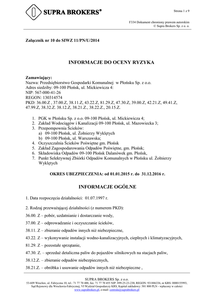 Strona 1 z 9 F334 Dokument chroniony prawem autorskim © Supra Brokers Sp. z o. o. Załącznik nr 10 do SIWZ 11/PN/U/2014 INFORMACJE DO OCENY RYZYKA Zamawiający: Nazwa: Przedsiębiorstwo Gospodarki Komunalnej w Płońsku Sp. z o.o. Adres siedziby: 09-100 Płońsk, ul. Mickiewicza 4: NIP: 567-000-41-26 REGON: 130314574 PKD: 36.00.Z , 37.00.Z, 38.11.Z, 43.22.Z, 81.29.Z, 47.30.Z, 39.00.Z, 42.21.Z, 49.41.Z, 47.99.Z, 38.32.Z. 38.12.Z, 38.21.Z., 38.22.Z., 20.15.Z. 1. PGK w Płońsku Sp. z o.o. 09-100 Płońsk, ul. Mickiewicza 4; 2. Zakład Wodociągów i Kanalizacji 09-100 Płońsk, ul. Mazowiecka 3; 3. Przepompownia Ścieków: a) 09-100 Płońsk, ul. Żołnierzy Wyklętych b) 09-100 Płońsk, ul. Warszawska; 4. Oczyszczalnia Ścieków Poświętne gm. Płońsk 5. Zakład Zagospodarowania Odpadów Poświętne, gm. Płońsk; 6. Składowiska Odpadów 09-100 Płońsk Dalanówek gm. Płońsk, 7. Punkt Selektywnej Zbiórki Odpadów Komunalnych w Płońsku ul. Żołnierzy Wyklętych OKRES UBEZPIECZENIA: od 01.01.2015 r. do 31.12.2016 r. INFORMACJE OGÓLNE 1. Data rozpoczęcia działalności: 01.07.1997 r. 2. Rodzaj przeważającej działalności (z numerem PKD): 36.00. Z – pobór, uzdatnianie i dostarczanie wody, 37.00. Z – odprowadzanie i oczyszczanie ścieków, 38.11. Z – zbieranie odpadów innych niż niebezpieczne, 43.22. Z – wykonywanie instalacji wodno-kanalizacyjnych, cieplnych i klimatyzacyjnych, 81.29. Z – pozostałe sprzątanie, 47.30. Z. – sprzedaż detaliczna paliw do pojazdów silnikowych na stacjach paliw, 38.12.Z. – zbieranie odpadów niebezpiecznych, 38.21.Z. – obróbka i usuwanie odpadów innych niż niebezpieczne , SUPRA BROKERS Sp. z o.o. 53-609 Wrocław, ul. Fabryczna 10, tel.: 71 77 70 400, fax: 71 77 70 455 NIP: 899-25-23-230, REGON: 931886336, nr KRS: 0000155993, Sąd Rejonowy dla Wrocławia-Fabrycznej, VI Wydział Gospodarczy KRS, Kapitał zakładowy: 501 800 PLN - wpłacony w całości www.suprabrokers.pl, e-mail: [email protected] Strona 2 z 9 F334 Dokument chroniony prawem autorskim © Supra Brokers Sp. z o. o. 38.22.Z. – Przetwarzanie i unieszkodliwianie odpadów niebezpiecznych, 20.15.Z. – produkcja nawozów i związków azotowych. 3. Rodzaj działalności dodatkowej (z numerami PKD): 39.00. Z – działalność związana z rekultywacją i pozostała działalność usługowa związana z gospodarką odpadami, 42.21.Z – roboty związane z budową rurociągów przesyłowych i sieci rozdzielczych 49.41.Z – transport drogowy towarów 47.99.Z – pozostała sprzedaż detaliczna prowadzona poza siecią sklepową 38.32.Z. – odzysk surowców z materiałów segregowanych 1. Czy firma wykonuje prace ziemne i podziemne? tak X nie Jeśli TAK to proszę je opisać: W pracach instalacyjnych zewnętrznych sieci wodno-kanalizacyjnych oraz instalacji kanalizacji deszczowej w zasadzie zawsze występują prace ziemne związane z wykopami do głębokości zależnej od ukształtowania sieci. Głębokość ta sporadycznie może osiągnąć 6 metrów. 2. Czy firma wykonuje prace z użyciem młotów kafarów lub walców? tak X nie 6. Liczba zatrudnionych pracowników: 247 7. Obrót firmy w poprzednim roku: 36 184 000 zł 8. Obrót planowany na rok bieżący: 36 000 000 zł 9. Firma sprzedaje produkty/usługi poza granicami RP tak nie X 10. Czy jest wymagana koncesja/zezwolenie na prowadzoną działalność: …………………… Jeśli TAK, to jaka – proszę wymienić: - wpisy do rejestru działalności regulowanej w zakresie odbierania odpadów komunalnych od właścicieli nieruchomości, SUPRA BROKERS Sp. z o.o. 53-609 Wrocław, ul. Fabryczna 10, tel.: 71 77 70 400, fax: 71 77 70 455 NIP: 899-25-23-230, REGON: 931886336, nr KRS: 0000155993, Sąd Rejonowy dla Wrocławia-Fabrycznej, VI Wydział Gospodarczy KRS, Kapitał zakładowy: 501 800 PLN - wpłacony w całości www.suprabrokers.pl, e-mail: [email protected] Strona 3 z 9 F334 Dokument chroniony prawem autorskim © Supra Brokers Sp. z o. o. - zezwolenie na prowadzenie działalności gospodarczej w zakresie opróżniania zbiorników bezodpływowych i transportu nieczystości ciekłych, - pozwolenie na wytworzenie odpadów, - pozwolenie na prowadzenie działalności w zakresie zbierania i transportów odpadów, - pozwolenie zintegrowane dla składników odpadów innych niż niebezpieczne i obojętne - zezwolenie na prowadzenie działalności zbiorowego zaopatrzenia w wodę i zbiorowego odprowadzania ścieków, - koncesja na obrót paliwami ciekłymi, - decyzja zatwierdzająca program gospodarki odpadami wytwarzanymi w wyniku prowadzonej działalności usługowej w zakresie czyszczenia zbiorników lub urządzeń, - pozwolenie wodno-prawne w zakresie odprowadzania ścieków, - koncesja na wydobywanie kopalin metodę odkrywkową ze złoża surowców ilastych Siedlin, - licencja na wykonywanie krajowego transportu drogowego rzeczy 11. Krótki opis przedsiębiorstwa/informacje dodatkowe: PGK w Płońsku Sp. z o.o. jest przedsiębiorstwem wielozakładowym. W jego skład wchodzi: Zakład Zagospodarowania Odpadów, w tym sortowania odpadów komunalnych, kompostowania, składowisko odpadów komunalnych innych niż niebezpieczne i obojętne. Zakład Wodociągów i Kanalizacji, w tym oczyszczania ścieków i stacja uzdatniania wody. Zakład Oczyszczania Miasta, w tym punkt selektywnej zbiórki odpadów komunalnych. Przedsiębiorstwo prowadzi detaliczną sprzedaż paliw płynnych w istniejącej stacji paliw przy ul. Mickiewicza 4. Ponadto przedsiębiorstwo wykonuje działalność usługową w zakresie zewnętrznych sieci wodociągowo-kanalizacyjnych, kanalizacji deszczowej oraz robót budowlanych. 12. Firma wynajmuje pomieszczenia od innych podmiotów tak nie X 13. Firma wynajmuje pomieszczenia innym podmiotom tak X nie SUPRA BROKERS Sp. z o.o. 53-609 Wrocław, ul. Fabryczna 10, tel.: 71 77 70 400, fax: 71 77 70 455 NIP: 899-25-23-230, REGON: 931886336, nr KRS: 0000155993, Sąd Rejonowy dla Wrocławia-Fabrycznej, VI Wydział