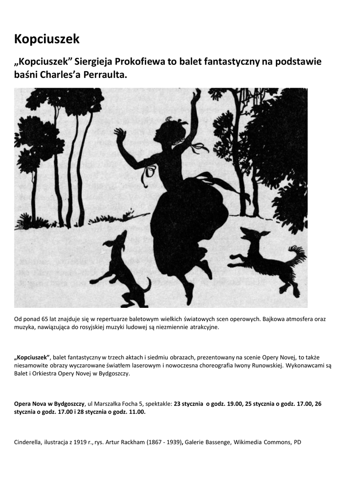 Kopciuszek „Kopciuszek” Siergieja Prokofiewa to balet fantastyczny na podstawie baśni Charles’a Perraulta. Od ponad 65 lat znajduje się w repertuarze baletowym wielkich światowych scen operowych. Bajkowa atmosfera oraz muzyka, nawiązująca do rosyjskiej muzyki ludowej są niezmiennie atrakcyjne. „Kopciuszek”, balet fantastyczny w trzech aktach i siedmiu obrazach, prezentowany na scenie Opery Novej, to także niesamowite obrazy wyczarowane światłem laserowym i nowoczesna choreografia Iwony Runowskiej. Wykonawcami są Balet i Orkiestra Opery Novej w Bydgoszczy. Opera Nova w Bydgoszczy, ul Marszałka Focha 5, spektakle: 23 stycznia o godz. 19.00, 25 stycznia o godz. 17.00, 26 stycznia o godz. 17.00 i 28 stycznia o godz. 11.00. Cinderella, ilustracja z 1919 r., rys. Artur Rackham (1867 - 1939), Galerie Bassenge, Wikimedia Commons, PD