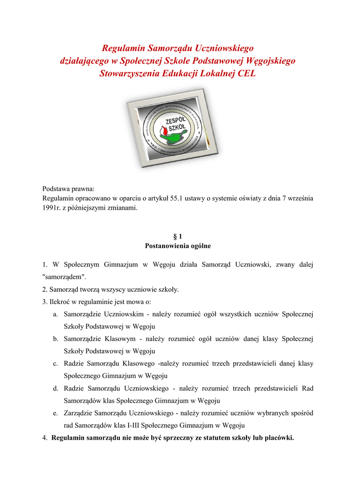 Regulamin Samorządu Uczniowskiego działającego w Społecznej Szkole Podstawowej Węgojskiego Stowarzyszenia Edukacji Lokalnej CEL Podstawa prawna: Regulamin opracowano w oparciu o artykuł 55.1 ustawy o systemie oświaty z dnia 7 września 1991r. z późniejszymi zmianami. §1 Postanowienia ogólne 1. W Społecznym Gimnazjum w Węgoju działa Samorząd Uczniowski, zwany dalej "samorządem". 2. Samorząd tworzą wszyscy uczniowie szkoły. 3. Ilekroć w regulaminie jest mowa o: a. Samorządzie Uczniowskim - należy rozumieć ogół wszystkich uczniów Społecznej Szkoły Podstawowej w Węgoju b. Samorządzie Klasowym - należy rozumieć ogół uczniów danej klasy Społecznej Szkoły Podstawowej w Węgoju c. Radzie Samorządu Klasowego -należy rozumieć trzech przedstawicieli danej klasy Społecznego Gimnazjum w Węgoju d. Radzie Samorządu Uczniowskiego - należy rozumieć trzech przedstawicieli Rad Samorządów klas Społecznego Gimnazjum w Węgoju e. Zarządzie Samorządu Uczniowskiego - należy rozumieć uczniów wybranych spośród rad Samorządów klas I-III Społecznego Gimnazjum w Węgoju 4. Regulamin samorządu nie może być sprzeczny ze statutem szkoły lub placówki. §2 Cele Samorządu Uczniowskiego Do podstawowych celów Samorządu Uczniowskiego należą: a. rozwijanie samorządności i współdziałania uczniów. b. motywowanie społeczności uczniowskiej do jak najlepszego spełniania obowiązków szkolnych, c. współdziałanie z organami szkoły w zapewnianiu uczniom należytych warunków do nauki d. działanie na rzecz społeczności uczniowskiej i obrona jej praw, e. rozwijanie demokratycznych form współżycia i współdziałania uczniów, f. dbanie o dobre imię i honor szkoły, kultywowanie i wzbogacanie jej tradycji, g. godne reprezentowanie szkoły w środowisku, h. występowanie z nowymi inicjatywami dotyczącymi życia szkolnego, i. prowadzenie działalności kulturalnej poprzez planowanie i organizację ważnych uroczystości i imprez szkolnych, j. współpracowanie z instytucjami i organizacjami pozaszkolnymi. §3 Prawa Samorządu Uczniowskiego 1. Samorząd może przedstawiać Radzie Rodziców, Radzie Pedagogicznej, Zarządowi Stowarzyszenia oraz dyrektorowi wnioski i opinie we wszystkich sprawach szkoły, w szczególności dotyczących realizacji podstawowych praw uczniów, takich jak: a. prawo do zapoznawania się z programem nauczania, z jego treścią, celem i stawianymi wymaganiami, b. prawo do jawnej i umotywowanej oceny postępów w nauce i zachowaniu, c. prawo do organizacji życia szkolnego, umożliwiające zachowanie właściwych proporcji między wysiłkiem szkolnym, a możliwością rozwijania i zaspokajania własnych zainteresowań, d. prawo redagowania i wydawania gazety szkolnej, e. prawo organizowania działalności kulturalnej, oświatowej, sportowej oraz rozrywkowej zgodnie z własnymi potrzebami i możliwościami organizacyjnymi, w porozumieniu z dyrektorem, f. prawo wyboru nauczyciela pełniącego rolę opiekuna samorządu. §4 Zasady wyboru 1. Zasady wybierania i działania organów samorządu określa regulamin uchwalany przez opiekuna i Zarząd SU. 2. Opracowany regulamin musi uwzględniać zasady głosowania równego, tajnego i powszechnego. §5 Regulamin Samorządu Uczniowskiego 1. Regulamin jest przedstawiany do zapoznania się: a. we wszystkich klasach przed wyborami b. w czasie pierwszego po wyborach posiedzenia Rad Samorządów Klasowych oraz Zarządu Samorządu Uczniowskiego 2. Zmiany, poprawki do regulaminu: a. potrzeba zmian lub poprawki do regulaminu mogą być zgłaszane przez: dyrektora, nauczyciela, opiekuna Samorządu, Zarząd Samorządu lub trzech członków Rady Samorządu b. zmiany są głosowane na specjalnie w tym celu zwołanym posiedzeniu Rad Samorządów Klasowych oraz Zarządu. c. o treści poprawek wszyscy członkowie muszą być poinformowani tydzień przed tym posiedzeniem d. treść poprawek powinna być wywieszona w miejscu ogólnie dostępnym e. zmiany w Regulaminie Samorządu uchwalane są większością głosów w obecności 2/3 członków Rad Klasowych f. w przypadku wprowadzenia dużej ilości zmian, opiekun wraz z Zarządem przygotowuje projekt nowego regulaminu, a ogół uczniów uchwala jego nowelizację. §6 Samorząd Klasy - wybory Rady Samorządu Klasy 1. Uczniowie danej klasy tworzą Samorząd Klasy 2. Każdy uczeń ma prawo wziąć udział i może być wybierany do Rady Samorządu Klasy 3. Uczniowie spośród społeczności swojej klasy zgłaszają kandydatów do Rady Samorządu Klasy 4. Każdy uczeń ma jeden głos. 5. Wybory odbywają się we wrześniu, w każdej klasie osobno. 6. Wybory są ważne, gdy uczestniczy w nich 2/3 liczby uczniów klasy. 7. Rada Samorządu Klasy składa się z 3 uczniów: przewodniczącego/przewodniczącej, sekretarza oraz skarbnika 8. kompetencje Rady Samorządu Klasy: a. wyraża swoją opinię w sytuacjach spornych z udziałem uczniów jego klasy b. może przedstawić wychowawcy lub organom szkoły opinie we wszystkich sprawach dotyczących klasy oraz szkoły §7 Rada Samorządu Uczniowskiego 1. Rada Samorządu Uczniowskiego składa się z Samorządów Klasowych 2. Zadania Rady Samorządu Uczniowskiego: a. uchwalenie Regulaminu Samorządu Uczniowskiego, dokonywanie niezbędnych zmian i poprawek b. na wniosek dyrektora szkoły opiniowanie oceny pracy nauczyciela c. zgłaszanie propozycji do planów pracy i programów szkoły d. uchwalenie budżetu Samorządu e. wybór komisji wyborczej, która przeprowadza wybory do władz samorządu f. podejmowanie uchwał dotyczących głównych kierunków działania samorządu g. opiniowanie projektów dokumentów regulujących organizację pracy w szkole takich jak: Statut Szkoły, WO, Program Wychowawczy, Program Profilaktyki, Program Rozwoju Szkoły, Program Regionalizmu, oraz regulaminów szkolnych dotyczących uczniów 3. Organizacja pracy: a. Zebrania Rady Samorządu Uczniowskiego odbywają się nie rzadziej niż raz na 