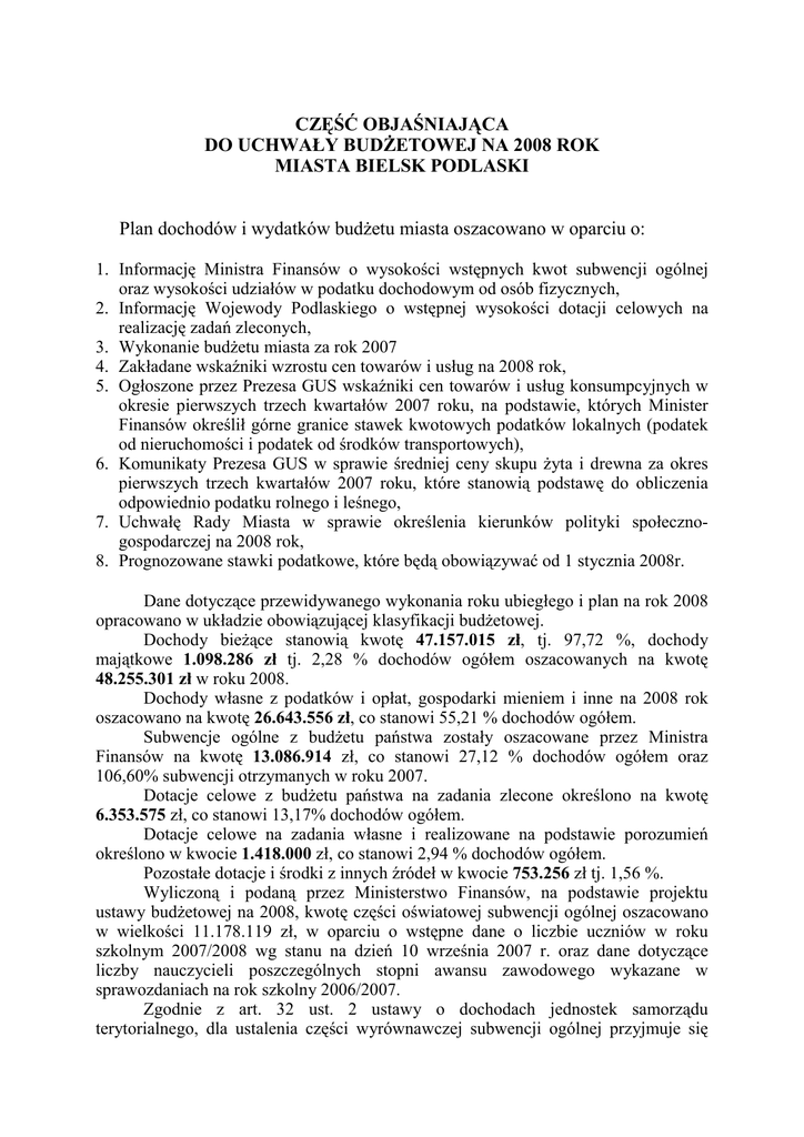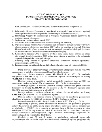 CZĘŚĆ OBJAŚNIAJĄCA DO UCHWAŁY BUDśETOWEJ NA 2008 ROK MIASTA BIELSK PODLASKI Plan dochodów i wydatków budŜetu miasta oszacowano w oparciu o: 1. Informację Ministra Finansów o wysokości wstępnych kwot subwencji ogólnej oraz wysokości udziałów w podatku dochodowym od osób fizycznych, 2. Informację Wojewody Podlaskiego o wstępnej wysokości dotacji celowych na realizację zadań zleconych, 3. Wykonanie budŜetu miasta za rok 2007 4. Zakładane wskaźniki wzrostu cen towarów i usług na 2008 rok, 5. Ogłoszone przez Prezesa GUS wskaźniki cen towarów i usług konsumpcyjnych w okresie pierwszych trzech kwartałów 2007 roku, na podstawie, których Minister Finansów określił górne granice stawek kwotowych podatków lokalnych (podatek od nieruchomości i podatek od środków transportowych), 6. Komunikaty Prezesa GUS w sprawie średniej ceny skupu Ŝyta i drewna za okres pierwszych trzech kwartałów 2007 roku, które stanowią podstawę do obliczenia odpowiednio podatku rolnego i leśnego, 7. Uchwałę Rady Miasta w sprawie określenia kierunków polityki społecznogospodarczej na 2008 rok, 8. Prognozowane stawki podatkowe, które będą obowiązywać od 1 stycznia 2008r. Dane dotyczące przewidywanego wykonania roku ubiegłego i plan na rok 2008 opracowano w układzie obowiązującej klasyfikacji budŜetowej. Dochody bieŜące stanowią kwotę 47.157.015 zł, tj. 97,72 %, dochody majątkowe 1.098.286 zł tj. 2,28 % dochodów ogółem oszacowanych na kwotę 48.255.301 zł w roku 2008. Dochody własne z podatków i opłat, gospodarki mieniem i inne na 2008 rok oszacowano na kwotę 26.643.556 zł, co stanowi 55,21 % dochodów ogółem. Subwencje ogólne z budŜetu państwa zostały oszacowane przez Ministra Finansów na kwotę 13.086.914 zł, co stanowi 27,12 % dochodów ogółem oraz 106,60% subwencji otrzymanych w roku 2007. Dotacje celowe z budŜetu państwa na zadania zlecone określono na kwotę 6.353.575 zł, co stanowi 13,17% dochodów ogółem. Dotacje celowe na zadania własne i realizowane na podstawie porozumień określono w kwocie 1.418.000 zł, co stanowi 2,94 % dochodów ogółem. Pozostałe dotacje i środki z innych źródeł w kwocie 753.256 zł tj. 1,56 %. Wyliczoną i podaną przez Ministerstwo Finansów, na podstawie projektu ustawy budŜetowej na 2008, kwotę części oświatowej subwencji ogólnej oszacowano w wielkości 11.178.119 zł, w oparciu o wstępne dane o liczbie uczniów w roku szkolnym 2007/2008 wg stanu na dzień 10 września 2007 r. oraz dane dotyczące liczby nauczycieli poszczególnych stopni awansu zawodowego wykazane w sprawozdaniach na rok szkolny 2006/2007. Zgodnie z art. 32 ust. 2 ustawy o dochodach jednostek samorządu terytorialnego, dla ustalenia części wyrównawczej subwencji ogólnej przyjmuje się 2 dochody, które gmina moŜe uzyskać z podatku rolnego, stosując do ich obliczenia średnią cenę skupu Ŝyta, z podatku leśnego – średnią cenę sprzedaŜy drewna, ogłoszone przez Prezesa Głównego Urzędu Statystycznego, a w przypadku innych podatków, stosując do ich obliczenia górne granice stawek podatków obowiązujące w danym roku bez zwolnień, odroczeń oraz umorzeń poboru takich podatków. Podstawę do ustalenia wysokości kwoty podstawowej stanowią dane ze sprawozdań z wykonania dochodów podatkowych gminy za 2006 r. oraz dane o liczbie mieszkańców według stanu na dzień 31 grudnia 2006 r. ustalonej przez GUS. Ustawa o dochodach jednostek samorządu terytorialnego wprowadza mechanizm wyrównania dochodów dla gmin, w których wskaźnik dochodów podatkowych na jednego mieszkańca jest niŜszy niŜ 92 % wskaźnika dochodów podatkowych dla wszystkich gmin. Gmina miejska Bielsk Podlaski naleŜy do gmin o wskaźniku dochodów niŜszym niŜ 92 % i z tego tytułu otrzyma część wyrównawczą subwencji ogólnej w szacowanej kwocie 1.397.431 zł, co stanowi 159,60% wielkości tej części subwencji otrzymanej w roku 2007. Podobnie jak w roku bieŜącym, wpłynie część równowaŜąca subwencji ogólnej w kwocie 511.364 zł, co stanowi 94,89 % kwoty otrzymanej w roku 2007. O ostatecznych wielkościach poszczególnych części subwencji ogólnej na 2008 rok Minister Finansów powiadomi – zgodnie z artykułem 33 ust. 1 pkt 2 ustawy o dochodach jednostek samorządu terytorialnego – w terminie 14 dni od dnia ogłoszenia ustawy budŜetowej na 2008 rok. Część tabelaryczna szczegółowo obrazuje poszczególne pozycje dochodów na rok budŜetowy 2008. DOCHODY Szacunek dochodów poszczególnych pozycji przedstawia się następująco: I. Dochody z podatków i opłat, gospodarki mieniem i inne Szacunek łączny wymienionych dochodów wynosi 39.730.470 zł co stanowi 82,33% dochodów ogółem. Na powyŜsze dochody własne składają się: W dziale 600 Transport i łączność dochody w kwocie 174.625 zł, na które składają się: − w rozdziale 60016 Drogi publiczne gminne – przewidywane wpływy z róŜnych opłat w kwocie 75.000 zł za zajęcie pasa drogowego, − w rozdziale 60095 Pozostała działalność - środki w kwocie 99.625 zł (dochody majątkowe) , z tytułu wpłat mieszkańców w związku z inwestycjami realizowanymi przy ich udziale. Uwzględniono wpłaty z tytułu współfinansowania następujących inwestycji: 1. Wodociąg w zaułku ul. 11 Listopada, 2. Kanalizacja sanitarna i wodociąg w zaułku ulicy Hołowieskiej, 3. Wodociąg w zaułku ul. Chmielnej, 4. Kanalizacja sanitarna i wodociąg w ulicy Pogodnej, 3 5. Kanalizacja sanitarna w ul. Białowieskiej, 6. Kanalizacja sanitarna w ulicy Wiśniowej, 7. Kanalizacja sanitarna w ul. Rejtana, 8. Kanalizacja sanitarna i wodociąg w zaułku ul. Ogrodowej, 9. Wodociąg w ul. Słonecznikowej. Dział 700 – Gospodarka mieszkaniowa Na rok 2008 plan dochodów własnych oszacowano na kwotę 944.000 zł i będą je stanowiły : Rozdział 70005 Gospodarka gruntami i nieruchomościami Dochody w łącznej kwocie 944.000 zł , będą stanowiły: 1) W