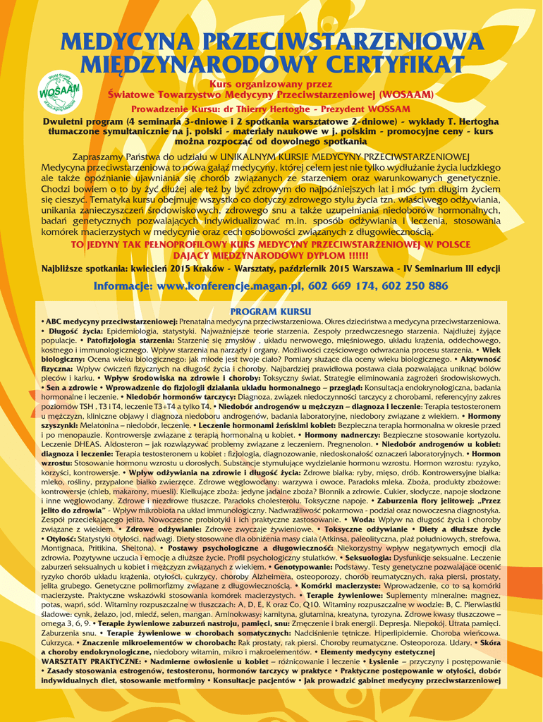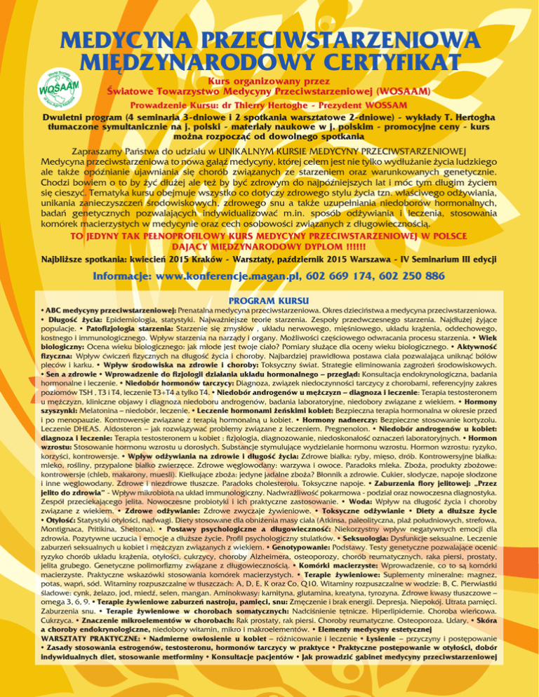 MEDYCYNA PRZECIWSTARZENIOWA MIĘDZYNARODOWY CERTYFIKAT Kurs organizowany przez Światowe Towarzystwo Medycyny Przeciwstarzeniowej (WOSAAM) Prowadzenie Kursu: dr Thierry Hertoghe - Prezydent WOSSAM Dwuletni program (4 seminaria 3-dniowe i 2 spotkania warsztatowe 2-dniowe) - wykłady T. Hertogha tłumaczone symultanicznie na j. polski - materiały naukowe w j. polskim - promocyjne ceny - kurs można rozpocząć od dowolnego spotkania Zapraszamy Państwa do udziału w UNIKALNYM KURSIE MEDYCYNY PRZECIWSTARZENIOWEJ Medycyna przeciwstarzeniowa to nowa gałąź medycyny, której celem jest nie tylko wydłużanie życia ludzkiego ale także opóźnianie ujawniania się chorób związanych ze starzeniem oraz warunkowanych genetycznie. Chodzi bowiem o to by żyć dłużej ale też by być zdrowym do najpóźniejszych lat i móc tym długim życiem się cieszyć. Tematyka kursu obejmuje wszystko co dotyczy zdrowego stylu życia tzn. właściwego odżywiania, unikania zanieczyszczeń środowiskowych, zdrowego snu a także uzupełniania niedoborów hormonalnych, badań genetycznych pozwalających indywidualizować m.in. sposób odżywiania i leczenia, stosowania komórek macierzystych w medycynie oraz cech osobowości związanych z długowiecznością. TO JEDYNY TAK PEŁNOPROFILOWY KURS MEDYCYNY PRZECIWSTARZENIOWEJ W POLSCE DAJĄCY MIĘDZYNARODOWY DYPLOM !!!!!! Najbliższe spotkania: kwiecień 2015 Kraków - Warsztaty, październik 2015 Warszawa - IV Seminarium III edycji Informacje: www.konferencje.magan.pl, 602 669 174, 602 250 886 PROGRAM KURSU • ABC medycyny przeciwstarzeniowej: Prenatalna medycyna przeciwstarzeniowa. Okres dzieciństwa a medycyna przeciwstarzeniowa. • Długość życia: Epidemiologia, statystyki. Najważniejsze teorie starzenia. Zespoły przedwczesnego starzenia. Najdłużej żyjące populacje. • Patofizjologia starzenia: Starzenie się zmysłów , układu nerwowego, mięśniowego, układu krążenia, oddechowego, kostnego i immunologicznego. Wpływ starzenia na narządy i organy. Możliwości częściowego odwracania procesu starzenia. • Wiek biologiczny: Ocena wieku biologicznego: jak młode jest twoje ciało? Pomiary służące dla oceny wieku biologicznego. • Aktywność fizyczna: Wpływ ćwiczeń fizycznych na długość życia i choroby. Najbardziej prawidłowa postawa ciała pozwalająca uniknąć bólów pleców i karku. • Wpływ środowiska na zdrowie i choroby: Toksyczny świat. Strategie eliminowania zagrożeń środowiskowych. • Sen a zdrowie • Wprowadzenie do fizjologii działania układu hormonalnego – przegląd: Konsultacja endokrynologiczna, badania hormonalne i leczenie. • Niedobór hormonów tarczycy: Diagnoza, związek niedoczynności tarczycy z chorobami, referencyjny zakres poziomów TSH , T3 i T4, leczenie T3+T4 a tylko T4. • Niedobór androgenów u mężczyzn – diagnoza i leczenie: Terapia testosteronem u mężczyzn, kliniczne objawy i diagnoza niedoboru androgenów, badania laboratoryjne, niedobory związane z wiekiem. • Hormony szyszynki: Melatonina – niedobór, leczenie. • Leczenie hormonami żeńskimi kobiet: Bezpieczna terapia hormonalna w okresie przed i po menopauzie. Kontrowersje związane z terapią hormonalną u kobiet. • Hormony nadnerczy: Bezpieczne stosowanie kortyzolu. Leczenie DHEAS. Aldosteron – jak rozwiązywać problemy związane z leczeniem. Pregnenolon. • Niedobór androgenów u kobiet: diagnoza i leczenie: Terapia testosteronem u kobiet : fizjologia, diagnozowanie, niedoskonałość oznaczeń laboratoryjnych. • Hormon wzrostu: Stosowanie hormonu wzrostu u dorosłych. Substancje stymulujące wydzielanie hormonu wzrostu. Hormon wzrostu: ryzyko, korzyści, kontrowersje. • Wpływ odżywiania na zdrowie i długość życia: Zdrowe białka: ryby, mięso, drób. Kontrowersyjne białka: mleko, rośliny, przypalone białko zwierzęce. Zdrowe węglowodany: warzywa i owoce. Paradoks mleka. Zboża, produkty zbożowe: kontrowersje (chleb, makarony, muesli). Kiełkujące zboża: jedyne jadalne zboża? Błonnik a zdrowie. Cukier, słodycze, napoje słodzone i inne węglowodany. Zdrowe i niezdrowe tłuszcze. Paradoks cholesterolu. Toksyczne napoje. • Zaburzenia flory jelitowej: „Przez jelito do zdrowia” - Wpływ mikrobiota na układ immunologiczny. Nadwrażliwość pokarmowa - podział oraz nowoczesna diagnostyka. Zespół przeciekającego jelita. Nowoczesne probiotyki i ich praktyczne zastosowanie. • Woda: Wpływ na długość życia i choroby związane z wiekiem. • Zdrowe odżywianie: Zdrowe zwyczaje żywieniowe. • Toksyczne odżywianie • Diety a dłuższe życie • Otyłość: Statystyki otyłości, nadwagi. Diety stosowane dla obniżenia masy ciała (Atkinsa, paleolityczna, plaż południowych, strefowa, Montignaca, Pritikina, Sheltona). • Postawy psychologiczne a długowieczność: Niekorzystny wpływ negatywnych emocji dla zdrowia. Pozytywne uczucia i emocje a dłuższe życie. Profil psychologiczny stulatków. • Seksuologia: Dysfunkcje seksualne. Leczenie zaburzeń seksualnych u kobiet i mężczyzn związanych z wiekiem. • Genotypowanie: Podstawy. Testy genetyczne pozwalające ocenić ryzyko chorób układu krążenia, otyłości, cukrzycy, choroby Alzheimera, osteoporozy, chorób reumatycznych, raka piersi, prostaty, jelita grubego. Genetyczne polimorfizmy związane z długowiecznością. • Komórki macierzyste: Wprowadzenie, co to są komórki macierzyste. Praktyczne wskazówki stosowania komórek macierzystych. • Terapie żywieniowe: Suplementy mineralne: magnez, potas, wapń, sód. Witaminy rozpuszczalne w tłuszczach: A, D, E, K oraz Co, Q10. Witaminy rozpuszczalne w wodzie: B, C. Pierwiastki śladowe: cynk, żelazo, jod, miedź, selen, mangan. Aminokwasy: karnityna, glutamina, kreatyna, tyrozyna. Zdrowe kwasy tłuszczowe – omega 3, 6, 9. • Terapie żywieniowe zaburzeń nastroju, pamięci, snu: Zmęczenie i brak energii. Depresja. Niepokój. Utrata pamięci. Zaburzenia sn