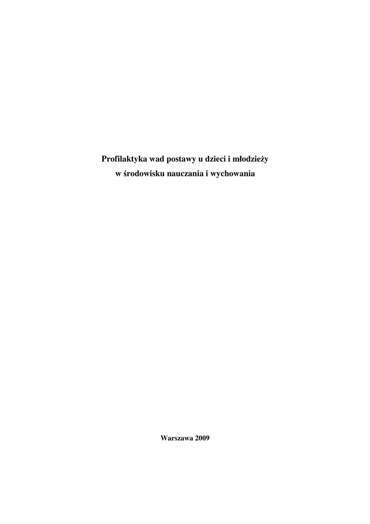 Profilaktyka wad postawy u dzieci i młodzieży w środowisku nauczania i wychowania Warszawa 2009 Niniejsze rekomendacje przygotował zespół ekspertów w składzie: 1. prof. dr hab. n. med. Andrzej Górecki – Konsultant Krajowy w dziedzinie ortopedii i traumatologii narządu ruchu 2. prof. dr hab. n. med. Jerzy Kiwerski – Polskie Towarzystwo Rehabilitacji 3. dr hab. n. med. Ireneusz Kowalski, prof. UWM - Polskie Towarzystwo Rehabilitacji 4. prof. dr hab. n. med. Wojciech Marczyński – Polskie Towarzystwo Ortopedyczne i Traumatologiczne 5. prof. dr hab. Janusz Nowotny – Komitet Rehabilitacji, Kultury Fizycznej i Integracji Społecznej Polskiej Akademii Nauk 6. mgr Małgorzata Rybińska – Polskie Towarzystwo Fizjoterapii 7. mgr Urszula Jarosz – Ministerstwo Edukacji Narodowej 8. mgr Maria Suwalska – Ministerstwo Zdrowia 2 SPIS TREŚCI 1. Wprowadzenie 2. Opis problemu 3. Epidemiologia 4. Rekomendacje w zakresie zapobiegania wadom postawy u dzieci i młodzieży 4.1 Profilaktyka wad postawy u dzieci i młodzieży 4.2 Cele działań profilaktycznych 4.3 Spodziewane efekty działań profilaktycznych 4.4 Realizatorzy działań profilaktycznych 4.5. Zadania realizatorów 4.5.1 Dyrektor placówki oświatowo-wychowawczej 4.5.2 Nauczyciel/ wychowawca 4.5.3 Nauczyciel wychowania fizycznego 4.5.4 Pielęgniarka środowiska nauczania i wychowania/ higienistka szkolna 5. Piśmiennictwo 3 1. Wprowadzenie Minister Zdrowia, dostrzegając potrzebę przygotowania jednolitego, opartego o aktualną wiedzę medyczną opracowania, zawierającego wskazania dla środowiska nauczania i wychowania, w zakresie działań zapobiegających występowaniu wad postawy u dzieci i młodzieży, w lutym 2008 r. zwrócił się z propozycją przygotowania przedmiotowego dokumentu do grona specjalistów. Gotowość współpracy w tym zakresie wyrazili: Konsultant Krajowy w dziedzinie ortopedii i traumatologii narządu ruchu, Konsultant Krajowy w dziedzinie rehabilitacji medycznej oraz eksperci rekomendowani przez Polskie Towarzystwo Fizjoterapii, Polskie Towarzystwo Rehabilitacji, Polskie Towarzystwo Ortopedyczne i Traumatologiczne oraz Komitet Rehabilitacji, Kultury Fizycznej i Integracji Społecznej Polskiej Akademii Nauk. W pracach grupy roboczej brali również udział przedstawiciele Ministerstwa Edukacji Narodowej oraz Ministerstwa Zdrowia. Prace zespołu koordynowane były początkowo przez Wydział Opieki nad Matką i Dzieckiem Departamentu Zdrowia Publicznego, a następnie przez Departament Matki i Dziecka w Ministerstwie Zdrowia. Opracowany przez ekspertów dokument pt.: Profilaktyka wad postawy u dzieci i młodzieży w środowisku nauczania i wychowania, Minister Zdrowia przekazuje Ministrowi Edukacji Narodowej, wyrażając nadzieję, że będzie on pomocny w podejmowaniu przez pracowników oświaty działań na rzecz kształtowania prozdrowotnych nawyków u dzieci i młodzieży. Opis problemu Postawą ciała nazywa się sposób trzymania się osobnika w swobodnej pozycji stojącej, a zewnętrznym tego przejawem jest wzajemny przestrzenny układ poszczególnych części ciała i sylwetka danej osoby. Postawa jest u wszystkich ludzi podobna, ale nie identyczna – jest ona cechą indywidualną. Z tego względu rozgraniczenie postawy prawidłowej i nieprawidłowej bywa niekiedy trudne. Drugą istotną cechą postawy jest zmienność. Zmienia się ona bowiem w ciągu życia, a nawet w ciągu dnia, pod wpływem różnych czynników. Pionowa postawa ciała nie jest nam dana od razu - noworodek nie ma żadnych możliwości przeciwstawienia się sile ciążenia i przyjmowania pozycji wyższych, niż leżąca. Dopiero w trakcie rozwoju dziecko nabywa umiejętność przyjmowania pionowej postawy i automatycznego utrzymywania jej w niekorzystnych warunkach równowagi chwiejnej, a sylwetka kształtuje się przez wiele lat. Pojawiają się też pewne zagrożenia dla jakości postawy, występujące podczas tzw. skoków wzrostowych, przypadających na okres 6-7 i 12-16 lat, gdy dziecko jest najbardziej podatne 4 na wpływ rozmaitych czynników zewnętrznych, a rozwój układu mięśniowego nie nadąża niejako za szybkim wzrostem kości. Prawidłowa postawa ciała rozwija się na prawidłowym podłożu morfologicznym i czynnościowym. Konieczna jest więc prawidłowa budowa aparatu ruchu (zwłaszcza układu kostno-stawowego) oraz właściwe funkcjonowanie układu mięśniowego i sterującego tą czynnością układu nerwowego. Ponieważ utrzymywanie pionowej postawy jest aktem czynnym, nie bez znaczenia jest, jak dziecko opanuje tę umiejętność i jaki wytworzy się u niego wzorzec postawy. Istotną rolę w kształtowaniu postawy ciała odgrywają nawyki, czyli swego rodzaju przyzwyczajenie do wykonywania różnych czynności w określony sposób, w tym przypadku przyjmowania określonego układu ciała, zwłaszcza podczas codziennych czynności. Niestety, dzieci dość często przyjmują nieprawidłową pozycję, co sprzyja kształtowaniu i utrwalaniu się nawyku nieprawidłowej postawy. Konieczne wydaje się rozróżnienie: 1. nawykowej nieprawidłowej postawy – podlegające czynnej korekcji i wymagającej włączenia do zajęć korekcyjnych prowadzonych przez nauczycieli wychowania fizycznego; 2. rzeczywistej wady postawy – nie korygującej się czynnie i nie będącej przedmiotem kompetencji nauczyciela, a wymagającej leczenia fizjoterapię, gorsetowanie, leczenie operacyjne. Wszelkie nieprawidłowości dotyczące postawy ciała dość powszechnie określa się mianem wad postawy, choć termin ten nie jest do końca zdefiniowany i jednoznaczny. Problem wad postawy ciała był tematem znacznej liczby publikacji o różnym charakterze, jednak wciąż pozostaje on nie do końca rozwiązany. Problem ten jest jednak ważny co najmniej z dwóch powodów: 1. nieprawidłowości tego typu występują dość licznie w populacji dzieci i młodzieży, 2. nieprawidłowości nie są wyłącznie defektem kosmetycznym, al