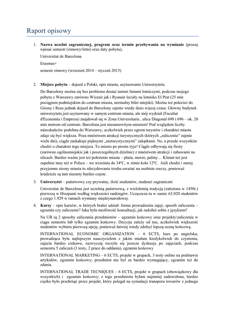 Raport opisowy 1. Nazwa uczelni zagranicznej, program oraz termin przebywania na wymianie (proszę wpisać semestr (zimowy/letni) oraz daty pobytu), Universitat de Barcelona Erasmus+ semestr zimowy (wrzesień 2014 – styczeń 2015) 2. Miejsce pobytu – dojazd z Polski, opis miasta, usytuowanie Uniwersytetu. Do Barcelony można się bez problemu dostać tanimi liniami lotniczymi, podczas mojego pobytu z Warszawy zarówno Wizzair jak i Ryanair leciały na lotnisko El Prat (25 min pociągiem podmiejskim do centrum miasta, normalny bilet miejski). Można też polecieć do Girony i Reus jednak dojazd do Barcelony zajmie wtedy dużo więcej czasu. Głowny budynek uniwersytetu jest usytuowany w samym centrum miasta, ale mój wydział (Facultat d'Economia i Empresa) znajdował się w Zona Universitaria , ulica Diagonal 690 i 696 – ok. 20 min metrem od centrum. Barcelona jest niesamowitym miastem! Pod względem liczby mieszkańców podobna do Warszawy, aczkolwiek przez ogrom turystów i charakter miasta zdaje się być większa. Poza mnóstwem atrakcji turystycznych (których „zaliczenie” zajmie wiele dni), ciągle zaskakuje pięknymi „nieturystycznymi” zakątkami. No, a przede wszystkim chodzi o charakter tego miejsca. To miasto po prostu żyje! Ciągle odbywają się fiesty (zarówno ogólnomiejskie jak i poszczególnych dzielnic) z mnóstwem atrakcji i zabawami na ulicach. Bardzo ważne jest też położenie miasta – plaża, morze, palmy… Klimat też jest zupełnie inny niż w Polsce – we wrześniu do 34ºC, w zimie koło 12ºC. Jeśli chodzi i mniej przyjemne strony miasta to zdecydowanie trzeba uważać na osobiste rzeczy, ponieważ kradzieże są tam niestety bardzo częste. 3. Uniwersytet – państwowy czy prywatny, ilość studentów, studenci zagraniczni Universitat de Barcelona jest uczelnią państwową, z wieloletnią tradycją (założona w 1450r.) pierwszą w Hiszpanii według większości rankingów. Uczęszcza tu w sumie 63.020 studentów z czego 1.929 w ramach wymiany międzynarodowej. 4. Kursy – opis kursów, w których brałeś udział: forma prowadzenia zajęć, sposób zaliczenia – egzamin czy zaliczenie? Jaka była możliwość konsultacji, jak radziłeś sobie z językiem? Na UB są 2 sposoby zaliczania przedmiotów – egzamin końcowy oraz projekty/zaliczenia w ciągu semestru lub tylko egzamin końcowy. Decyzja zależy od nas, aczkolwiek większość studentów wybiera pierwszą opcję, ponieważ łatwiej wtedy zdobyć lepszą ocenę końcową. INTERNATIONAL ECONOMIC ORGANIZATION – 6 ECTS, kurs po angielsku, prowadząca była najlepszym nauczycielem z jakim miałam kiedykolwiek do czynienia, zajęcia bardzo ciekawe, zazwyczaj toczyła się jeszcze dyskusja po zajęciach, podczas semestru 5 zaliczeń (3 testy, 2 prace do oddania), egzamin końcowy INTERNATIONAL MARKETING – 6 ECTS, projekt w grupach, 3 testy online na podstawie artykułów, egzamin końcowy; przedmiot nie był za bardzo wymagający, egzamin też do zdania. INTERNATIONAL TRADE TECNIQUES – 6 ECTS, projekt w grupach (obowiązkowy dla wszystkich) i egzamin końcowy; z tego przedmiotu byłam najmniej zadowolona, bardzo ciężko było przebrnąć przez projekt, który polegał na symulacji transporu towarów z jednego do drugiego kraju, włącznie ze wszystkimi dokumentami, przewoźnikami, kontenerami itp. Nie za bardzo było wiadomo również z czego przygotować się do egzaminu. DIRECCIÓN ESTRATEGICA – 6 ECTS, przedmiot po hiszpańsku, 2 projekty w grupach, 2 testy i na koniec egzamin, przedmiot nawet ciekawy, prowadzący chętnie pomagał w przypadku wątpliwości co do projektów itp. (była też możliwość pisania projektów i egzaminu w języku angielskim) 5. Warunki studiowania – dostęp do biblioteki, komputera, ksero Na moim wydziale były 2 biblioteki, czytelnia z komputerami, książki można wypożyczać tylko na tydzień, ale nie było problemu z przedłużaniem, punkty ksero w obu budynkach wydziału (dużo tańsze niż w innych punktach w Barcelonie). 6. Warunki mieszkaniowe – opis kampusu, co trzeba ze sobą przywieźć z Polski? Mój wydział był położony w „dzielnicy” uniwersyteckiej – dookoła były campusy różnych uczelni. Złożony jest z 2 budynków, w których znajdują się biblioteki, ksero, stołówki i kawiarnie. W kwestii miejsca zamieszkania sytuacje wygląda odwrotnie niż w Polsce, ponieważ to akademiki są dużo droższe od mieszkań. Wydaje mi się, że UB współpracuje z jakimiś akademikami, ale są też prywatne rezydencje studenckie. Co do mieszkań, pokój najłatwiej znaleźć przez internet (przykładowe strony: idealista, loquo, pisocompartido oraz grupy facebookowe). Ja znalazłam mieszkanie ze znajomymi przez agencję, która miała specjalne warunki dla studentów. Cenę pokoi różnicuje przede wszystkim fakt czy są one exterior (czyli z normalnym oknem), czy interior (bez okna lub wychodzące na szyb) oraz czy w mieszkaniu jest ogrzewanie. Polecam przyjechanie wcześniej do Barcelony i samemu sprawdzenie jak wygląda mieszkanie przed wynajęciem, ponieważ płacenie z góry za pokój, kóry się widziało tylko na zdjęciach może się źle skończyć… Na co jeszcze trzeba zwrócić uwagę to, czy w mieszkaniu jest internet. Ja z koleżankami musiałyśmy same założyć i było to baaardzo ciężkie do załatwienia, szczególnie, że nie byłyśmy obywatelkami Hiszpanii, nie miałyśmy hiszpańskiego konta bankowego, itd. 7. Recepcja – jak zostałeś przyjęty, kto się tobą opiekował, kontakt z International Student Office Przed przyjazdem dostałam maila z zapytaniem, czy chcę brać udział w Buddy Programme, co oczywiście potwierdziłam. Z moim buddy miałam kontakt jeszcze przed przyjazdem do Barcelony, na miejscu też stworzył grupę wszystkich swoich „podopiecznych”, były organizowane wspólne wyjścia itp. Na uczelni odbyło się spotkanie organizacyjne w ramach Orientation Week, podczas któr