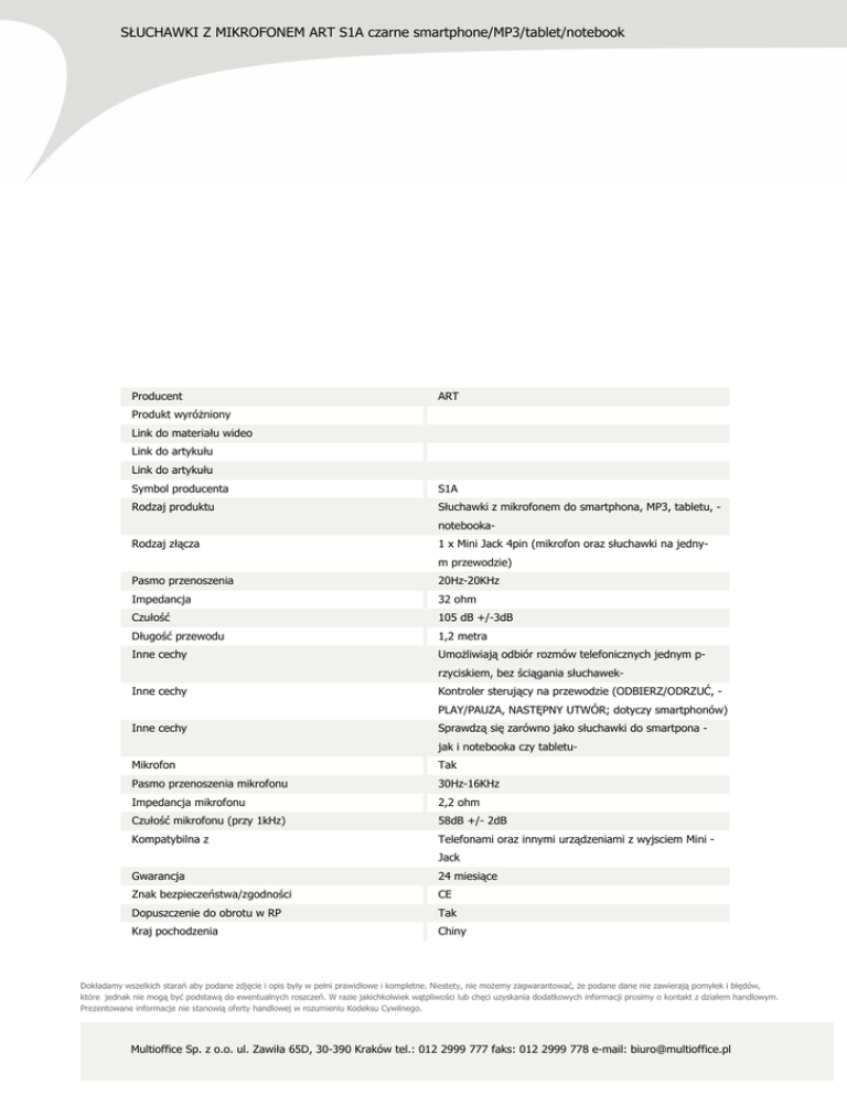 SŁUCHAWKI Z MIKROFONEM ART S1A czarne smartphone/MP3/tablet/notebook Producent ART Produkt wyróżniony Link do materiału wideo Link do artykułu Link do artykułu Symbol producenta S1A Rodzaj produktu Słuchawki z mikrofonem do smartphona, MP3, tabletu, notebooka- Rodzaj złącza 1 x Mini Jack 4pin (mikrofon oraz słuchawki na jednym przewodzie) Pasmo przenoszenia 20Hz-20KHz Impedancja 32 ohm Czułość 105 dB +/-3dB Długość przewodu 1,2 metra Inne cechy Umożliwiają odbiór rozmów telefonicznych jednym przyciskiem, bez ściągania słuchawek- Inne cechy Kontroler sterujący na przewodzie (ODBIERZ/ODRZUĆ, PLAY/PAUZA, NASTĘPNY UTWÓR; dotyczy smartphonów) Inne cechy Sprawdzą się zarówno jako słuchawki do smartpona jak i notebooka czy tabletu- Mikrofon Tak Pasmo przenoszenia mikrofonu 30Hz-16KHz Impedancja mikrofonu 2,2 ohm Czułość mikrofonu (przy 1kHz) 58dB +/- 2dB Kompatybilna z Telefonami oraz innymi urządzeniami z wyjsciem Mini Jack Gwarancja 24 miesiące Znak bezpieczeństwa/zgodności CE Dopuszczenie do obrotu w RP Tak Kraj pochodzenia Chiny Dokładamy wszelkich starań aby podane zdjęcie i opis były w pełni prawidłowe i kompletne. Niestety, nie możemy zagwarantować, że podane dane nie zawierają pomyłek i błędów, które jednak nie mogą być podstawą do ewentualnych roszczeń. W razie jakichkolwiek wątpliwości lub chęci uzyskania dodatkowych informacji prosimy o kontakt z działem handlowym. Prezentowane informacje nie stanowią oferty handlowej w rozumieniu Kodeksu Cywilnego. Multioffice Sp. z o.o. ul. Zawiła 65D, 30-390 Kraków tel.: 012 2999 777 faks: 012 2999 778 e-mail: [email protected]