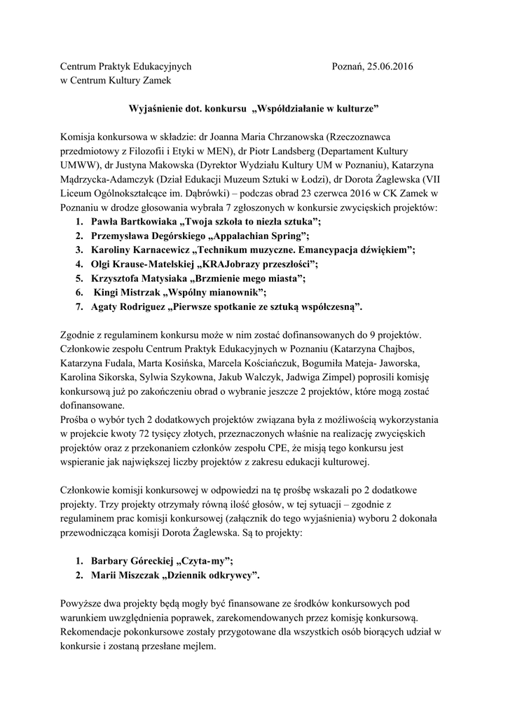 Centrum Praktyk Edukacyjnych w Centrum Kultury Zamek Poznań, 25.06.2016 Wyjaśnienie dot. konkursu „Współdziałanie w kulturze” Komisja konkursowa w składzie: dr Joanna Maria Chrzanowska (Rzeczoznawca przedmiotowy z Filozofii i Etyki w MEN), dr Piotr Landsberg (Departament Kultury UMWW), dr Justyna Makowska (Dyrektor Wydziału Kultury UM w Poznaniu), Katarzyna Mądrzycka-Adamczyk (Dział Edukacji Muzeum Sztuki w Łodzi), dr Dorota Żaglewska (VII Liceum Ogólnokształcące im. Dąbrówki) – podczas obrad 23 czerwca 2016 w CK Zamek w Poznaniu w drodze głosowania wybrała 7 zgłoszonych w konkursie zwycięskich projektów: 1. Pawła Bartkowiaka „Twoja szkoła to niezła sztuka”; 2. Przemysława Degórskiego „Appalachian Spring”; 3. Karoliny Karnacewicz „Technikum muzyczne. Emancypacja dźwiękiem”; 4. Olgi Krause-‐Matelskiej „KRAJobrazy przeszłości”; 5. Krzysztofa Matysiaka „Brzmienie mego miasta”; 6. Kingi Mistrzak „Wspólny mianownik”; 7. Agaty Rodriguez „Pierwsze spotkanie ze sztuką współczesną”. Zgodnie z regulaminem konkursu może w nim zostać dofinansowanych do 9 projektów. Członkowie zespołu Centrum Praktyk Edukacyjnych w Poznaniu (Katarzyna Chajbos, Katarzyna Fudala, Marta Kosińska, Marcela Kościańczuk, Bogumiła Mateja- Jaworska, Karolina Sikorska, Sylwia Szykowna, Jakub Walczyk, Jadwiga Zimpel) poprosili komisję konkursową już po zakończeniu obrad o wybranie jeszcze 2 projektów, które mogą zostać dofinansowane. Prośba o wybór tych 2 dodatkowych projektów związana była z możliwością wykorzystania w projekcie kwoty 72 tysięcy złotych, przeznaczonych właśnie na realizację zwycięskich projektów oraz z przekonaniem członków zespołu CPE, że misją tego konkursu jest wspieranie jak największej liczby projektów z zakresu edukacji kulturowej. Członkowie komisji konkursowej w odpowiedzi na tę prośbę wskazali po 2 dodatkowe projekty. Trzy projekty otrzymały równą ilość głosów, w tej sytuacji – zgodnie z regulaminem prac komisji konkursowej (załącznik do tego wyjaśnienia) wyboru 2 dokonała przewodnicząca komisji Dorota Żaglewska. Są to projekty: 1. Barbary Góreckiej „Czyta-‐my”; 2. Marii Miszczak „Dziennik odkrywcy”. Powyższe dwa projekty będą mogły być finansowane ze środków konkursowych pod warunkiem uwzględnienia poprawek, zarekomendowanych przez komisję konkursową. Rekomendacje pokonkursowe zostały przygotowane dla wszystkich osób biorących udział w konkursie i zostaną przesłane mejlem.