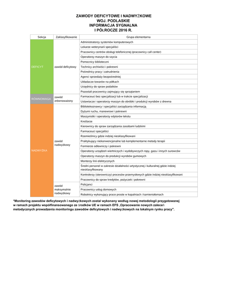 ZAWODY DEFICYTOWE I NADWYŻKOWE WOJ. PODLASKIE INFORMACJA SYGNALNA I PÓŁROCZE 2016 R. Sekcja Zaklasyfikowanie Grupa elementarna Administratorzy systemów komputerowych Lekarze weterynarii specjaliści Pracownicy centrów obsługi telefonicznej (pracownicy call center) Operatorzy maszyn do szycia Pomocnicy biblioteczni DEFICYT zawód deficytowy Technicy archiwiści i pokrewni Pośrednicy pracy i zatrudnienia Agenci sprzedaży bezpośredniej Układacze towarów na półkach Urzędnicy do spraw podatków Pozostali pracownicy zajmujący się sprzątaniem RÓWNOWAGA zawód zrównoważony Farmaceuci bez specjalizacji lub w trakcie specjalizacji Ustawiacze i operatorzy maszyn do obróbki i produkcji wyrobów z drewna Bibliotekoznawcy i specjaliści zarządzania informacją Dyżurni ruchu, manewrowi i pokrewni Maszynistki i operatorzy edytorów tekstu Kreślarze Kierownicy do spraw zarządzania zasobami ludzkimi Farmaceuci specjaliści Rzemieślnicy gdzie indziej niesklasyfikowani zawód nadwyżkowy NADWYŻKA Praktykujący niekonwencjonalne lub komplementarne metody terapii Formierze odlewniczy i pokrewni Operatorzy urządzeń wiertniczych i wydobywczych ropy, gazu i innych surowców Operatorzy maszyn do produkcji wyrobów gumowych Monterzy linii elektrycznych Średni personel w zakresie działalności artystycznej i kulturalnej gdzie indziej niesklasyfikowany Kontrolerzy (sterowniczy) procesów przemysłowych gdzie indziej niesklasyfikowani Pracownicy do spraw kredytów, pożyczek i pokrewni zawód maksymalnie nadwyżkowy Policjanci Pracownicy usług domowych Robotnicy wykonujący prace proste w kopalniach i kamieniołomach *Monitoring zawodów deficytowych i nadwyżkowych został wykonany według nowej metodologii przygotowanej w ramach projektu współfinansowanego ze środków UE w ramach EFS „Opracowanie nowych zaleceń metodycznych prowadzenia monitoringu zawodów deficytowych i nadwyżkowych na lokalnym rynku pracy".