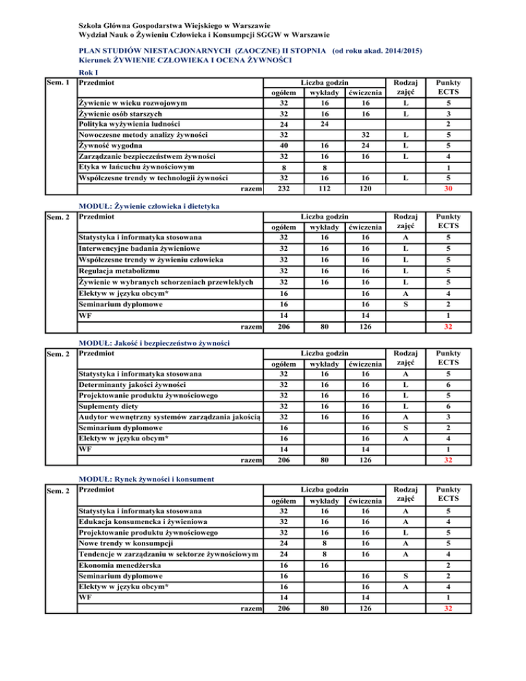 Szkoła Główna Gospodarstwa Wiejskiego w Warszawie Wydział Nauk o Żywieniu Człowieka i Konsumpcji SGGW w Warszawie PLAN STUDIÓW NIESTACJONARNYCH (ZAOCZNE) II STOPNIA (od roku akad. 2014/2015) Kierunek ŻYWIENIE CZŁOWIEKA I OCENA ŻYWNOŚCI Sem. 1 Rok I Przedmiot Liczba godzin ogółem wykłady ćwiczenia 32 16 16 32 16 16 24 24 32 32 40 16 24 32 16 16 Żywienie w wieku rozwojowym Żywienie osób starszych Polityka wyżywienia ludności Nowoczesne metody analizy żywności Żywność wygodna Zarządzanie bezpieczeństwem żywności Etyka w łańcuchu żywnościowym Współczesne trendy w technologii żywności razem Sem. 2 MODUŁ: Żywienie człowieka i dietetyka Przedmiot 16 120 Punkty ECTS L L 5 3 2 5 5 4 L L L L 1 5 30 Rodzaj zajęć Punkty ECTS A 5 Interwencyjne badania żywieniowe 32 16 16 L 5 Współczesne trendy w żywieniu człowieka 32 16 16 L 5 Regulacja metabolizmu 32 16 16 L 5 Żywienie w wybranych schorzeniach przewlekłych Elektyw w języku obcym* Seminarium dyplomowe 32 16 16 L 5 16 16 16 16 A S 4 2 WF 14 14 1 126 32 razem MODUŁ: Jakość i bezpieczeństwo żywności Przedmiot Statystyka i informatyka stosowana Determinanty jakości żywności Projektowanie produktu żywnościowego Suplementy diety Audytor wewnętrzny systemów zarządzania jakością Seminarium dyplomowe Elektyw w języku obcym* WF razem Sem. 2 8 16 112 Liczba godzin ogółem wykłady ćwiczenia 32 16 16 Statystyka i informatyka stosowana Sem. 2 8 32 232 Rodzaj zajęć 206 Liczba godzin ogółem wykłady ćwiczenia 32 16 16 32 16 16 32 16 16 32 16 16 32 16 16 16 16 16 16 14 14 206 80 126 Rodzaj zajęć Punkty ECTS A L L L A S A 5 6 5 6 3 2 4 1 32 Liczba godzin Rodzaj zajęć Punkty ECTS A A L A A 5 4 5 5 4 MODUŁ: Rynek żywności i konsument Przedmiot Statystyka i informatyka stosowana Edukacja konsumencka i żywieniowa Projektowanie produktu żywnościowego Nowe trendy w konsumpcji Tendencje w zarządzaniu w sektorze żywnościowym Ekonomia menedżerska Seminarium dyplomowe Elektyw w języku obcym* WF razem 80 ogółem 32 32 32 24 24 wykłady 16 16 16 8 8 16 16 16 14 206 16 80 ćwiczenia 16 16 16 16 16 16 16 14 126 S A 2 2 4 1 32 Rok II Sem. 3 Przedmiot Liczba godzin 9 10 11 12 13 3 2 2 20 33 32 16 16 16 16 16 L 16 S razem 143 79 OGÓŁEM sem. 1-3 581 Tytuł elektywu Alergie i nietolerancje pokarmowe Style życia Zarządzanie marką na rynku żywnościowym Prognozowanie bezpieczeństwa mikrobiologicznego żywności Nowoczesne metody diagnostyki w higienie żywności Produkty ekologiczne w żywieniu człowieka Zarządzanie procesem projektowania technologicznego Genetyka w żywności i żywieniu Wybrane zagadnienia opieki zdrowotnej w schorzeniach niezakaźnych Nowa żywność Systemy jakości w produkcji żywności Informatyka w zarządzaniu Urządzenia w przemyśle spożywczym Elektywy w języku angielskim Lp. 1 2 3 4 5 6 7 8 3 2 1 ćwiczenia 16 16 Elektywy w języku polskim 7 8 A A wykłady 16 16 15 Fizjologia i żywienie w sporcie Elektyw Seminarium dyplomowe Pracownia dyplomowa 4 5 6 Punkty ECTS ogółem 32 32 15 Socjologia żywienia Ekonomika konsumpcji Żywienie w warunkach ekstremalnych Lp. 1 2 3 Rodzaj zajęć *W przypadku braku znajomości języka angielskiego, student odbywa zajęcia z innego języka obcego (realizowanego na studiach I stopnia) Tytuł elektywu Food chain development Food and nutrition policy Nutrition and health Food safety management Food product development Ecological aspects of food and nutrition Consumer behaviour Organic food marketing 64 95