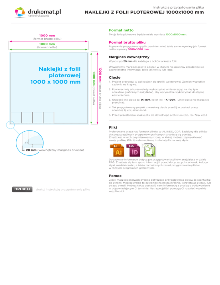drukomat.pl tanie drukowanie Instrukcja przygotowania pliku NAKLEJKI Z FOLII PLOTEROWEJ 1000x1000 mm Format netto Twoja folia ploterowa będzie miała wymiary 1000x1000 mm. 1000 mm (format brutto pliku) Format brutto pliku 1000 mm Poprawnie przygotowany plik powinien mieć takie same wymiary jak format drukomat.pl (format od netto) te feu feugiamet ad Exero do netto wymiary 1000x1000 mm. tanie drukowanie 1000 mm (format brutto pliku) Exero od te feu feugiamet ad do odiamconsent augait la feugiam commod eu facilissed tin et lumsan henibh eum at dolut venit nostrud tat nulput prat, quamet lore te doloreet, vel dolesto dolenis dit praessequate 1000 mm (format netto) odiamconsent augait la feugiam Margines wewnętrzny commod eu facilissed tin et lumWynosi po 20 mm dla każdego z boków arkusza folii. san henibh eum at dolut venitWewnętrzny no- margines jest to obszar, w którym nie powinny znajdować się żadne istotne informacje, takie jak teksty lub logo. Naklejki z folii strud tat nulput prat, quamet lore ploterowej Cięcie te doloreet, vel dolesto dolenis 1. Projekt przygotuj w aplikacjach do grafiki wektorowej. Zamień wszystkie 1000 x 1000 mm dit praessequate czcionki na krzywe. 2.Powierzchnię arkusza należy wykorzystać umieszczając na niej tyle obiektów graficznych (użytków), aby optymalnie wykorzystać dostępną powierzchnię. 3.Grubość linii cięcia to: 0,1 mm, kolor linii - K 100%. Linie cięcia nie mogą się przecinać. 4.Tak przygotowany projekt z warstwą cięcia prześlij w postaci pracy otwartej, tj. cdr, ai lub indd. 5.Przed przesłaniem spakuj plik do dowolnego archiwum (zip, rar, 7zip, etc.) Pliki Preferowane przez nas formaty plików to AI, INDD, CDR. Szablony dla plików dla poszczególnych programów graficznych znajdują się poniżej. Znajdziesz w nich zwymiarowaną stronę, w której możesz zaprojektować swoją grafikę. Kliknij wybraną ikonę i załaduj plik na swój dysk. 20 mm (wewnętrzny margines arkusza) Dodatkowe informacje dotyczące przygotowania plików znajdziesz w dziale FAQ. Znajduje się tam sporo informacji i porad dotyczących czcionek, kolorystyki, rozdzielczości, a także technicznych zasad przygotowania plików w różnych programach graficznych. Pomoc DRUKUJ drukuj instrukcję przygotowania pliku Jeżeli masz jakiekolwiek pytania dotyczące przygotowania plików to skontaktuj się z nami. Możesz zrobić to dzwoniąc na naszą infolinię, korzystając z czatu lub pisząc e-mail. Możesz także zostawić nam informację z prośbą o oddzwonienie w odpowiadającym Ci terminie. Nasi specjaliści pomogą Ci rozwiać wszelkie wątpliwości.