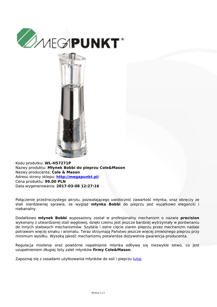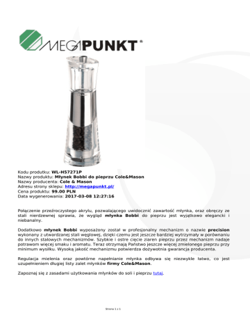 Kodu produtku: WL-H57271P Nazwy produktu: Młynek Bobbi do pieprzu Cole&Mason Nazwy producenta: Cole & Mason Adresu strony sklepu: http://megapunkt.pl/ Cena produktu: 99.00 PLN Data wygenerowania: 2017-03-08 12:27:16 Połączenie przeźroczystego akrylu, pozwalającego uwidocznić zawartość młynka, oraz obręczy ze stali nierdzewnej sprawia, że wygląd młynka Bobbi do pieprzu jest wyjątkowo elegancki i niebanalny. Dodatkowo młynek Bobbi wyposażony został w profesjonalny mechanizm o nazwie precision wykonany z utwardzanej stali węglowej, dzięki czemu jest jeszcze bardziej wytrzymały w porównaniu do innych stalowych mechanizmów. Szybkie i ostre cięcie ziaren pieprzu przez mechanizm nadaje potrawom więcej smaku i aromatu. Teraz otrzymają Państwo jeszcze więcej zmielonego pieprzu przy minimum wysiłku. Wysoką jakość mechanizmu potwierdza dożywotnia gwarancja producenta. Regulacja mielenia oraz powtórne napełnianie młynka odbywa się niezwykle łatwo, co jest uzupełnieniem długiej listy zalet młynków firmy Cole&Mason. Zapoznaj się z zasadami użytkowania młynków do soli i pieprzu tutaj. Strona 1 z 1