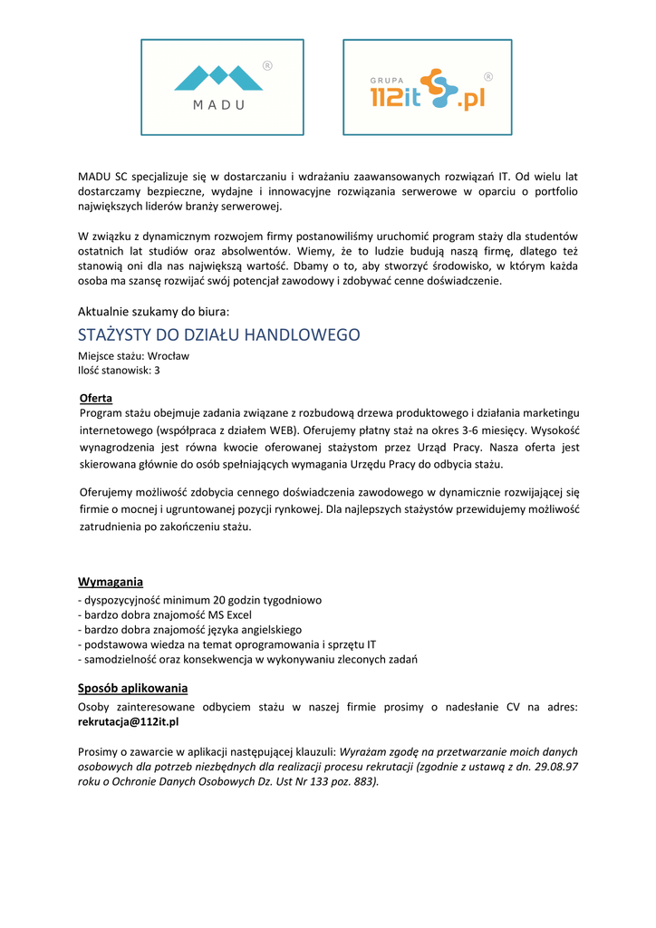 MADU SC specjalizuje się w dostarczaniu i wdrażaniu zaawansowanych rozwiązań IT. Od wielu lat dostarczamy bezpieczne, wydajne i innowacyjne rozwiązania serwerowe w oparciu o portfolio największych liderów branży serwerowej. W związku z dynamicznym rozwojem firmy postanowiliśmy uruchomić program staży dla studentów ostatnich lat studiów oraz absolwentów. Wiemy, że to ludzie budują naszą firmę, dlatego też stanowią oni dla nas największą wartość. Dbamy o to, aby stworzyć środowisko, w którym każda osoba ma szansę rozwijać swój potencjał zawodowy i zdobywać cenne doświadczenie. Aktualnie szukamy do biura: STAŻYSTY DO DZIAŁU HANDLOWEGO Miejsce stażu: Wrocław Ilość stanowisk: 3 Oferta Program stażu obejmuje zadania związane z rozbudową drzewa produktowego i działania marketingu internetowego (współpraca z działem WEB). Oferujemy płatny staż na okres 3-6 miesięcy. Wysokość wynagrodzenia jest równa kwocie oferowanej stażystom przez Urząd Pracy. Nasza oferta jest skierowana głównie do osób spełniających wymagania Urzędu Pracy do odbycia stażu. Oferujemy możliwość zdobycia cennego doświadczenia zawodowego w dynamicznie rozwijającej się firmie o mocnej i ugruntowanej pozycji rynkowej. Dla najlepszych stażystów przewidujemy możliwość zatrudnienia po zakończeniu stażu. Wymagania - dyspozycyjność minimum 20 godzin tygodniowo - bardzo dobra znajomość MS Excel - bardzo dobra znajomość języka angielskiego - podstawowa wiedza na temat oprogramowania i sprzętu IT - samodzielność oraz konsekwencja w wykonywaniu zleconych zadań Sposób aplikowania Osoby zainteresowane odbyciem stażu w naszej firmie prosimy o nadesłanie CV na adres: [email protected] Prosimy o zawarcie w aplikacji następującej klauzuli: Wyrażam zgodę na przetwarzanie moich danych osobowych dla potrzeb niezbędnych dla realizacji procesu rekrutacji (zgodnie z ustawą z dn. 29.08.97 roku o Ochronie Danych Osobowych Dz. Ust Nr 133 poz. 883).