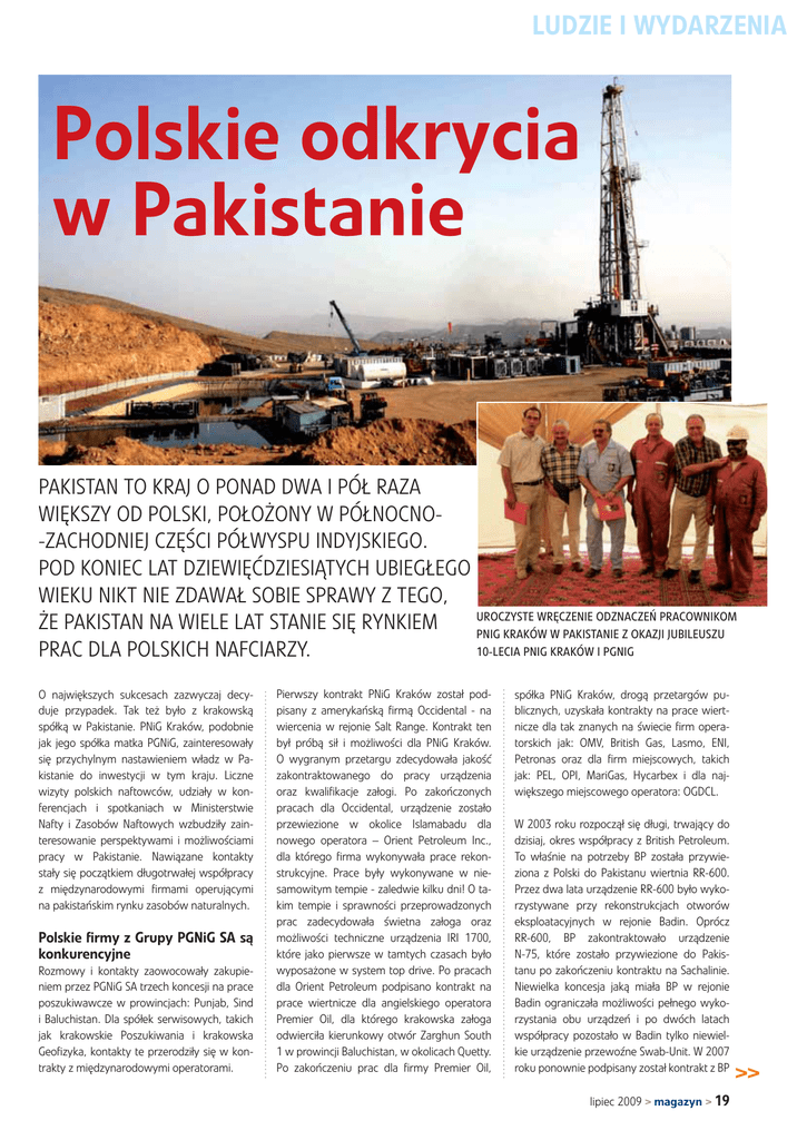 LUDZIE I WYDARZENIA Polskie odkrycia w Pakistanie PAKISTAN TO KRAJ O PONAD DWA I PÓŁ RAZA WIĘKSZY OD POLSKI, POŁOŻONY W PÓŁNOCNO-ZACHODNIEJ CZĘŚCI PÓŁWYSPU INDYJSKIEGO. POD KONIEC LAT DZIEWIĘĆDZIESIĄTYCH UBIEGŁEGO WIEKU NIKT NIE ZDAWAŁ SOBIE SPRAWY Z TEGO, UROCZYSTE WRĘCZENIE ODZNACZEŃ PRACOWNIKOM ŻE PAKISTAN NA WIELE LAT STANIE SIĘ RYNKIEM PNIG KRAKÓW W PAKISTANIE Z OKAZJI JUBILEUSZU 10-LECIA PNIG KRAKÓW I PGNIG PRAC DLA POLSKICH NAFCIARZY. O największych sukcesach zazwyczaj decyduje przypadek. Tak też było z krakowską spółką w Pakistanie. PNiG Kraków, podobnie jak jego spółka matka PGNiG, zainteresowały się przychylnym nastawieniem władz w Pakistanie do inwestycji w tym kraju. Liczne wizyty polskich naftowców, udziały w konferencjach i spotkaniach w Ministerstwie Nafty i Zasobów Naftowych wzbudziły zainteresowanie perspektywami i możliwościami pracy w Pakistanie. Nawiązane kontakty stały się początkiem długotrwałej współpracy z międzynarodowymi firmami operującymi na pakistańskim rynku zasobów naturalnych. Polskie firmy z Grupy PGNiG SA są konkurencyjne Rozmowy i kontakty zaowocowały zakupieniem przez PGNiG SA trzech koncesji na prace poszukiwawcze w prowincjach: Punjab, Sind i Baluchistan. Dla spółek serwisowych, takich jak krakowskie Poszukiwania i krakowska Geofizyka, kontakty te przerodziły się w kontrakty z międzynarodowymi operatorami. Pierwszy kontrakt PNiG Kraków został podpisany z amerykańską firmą Occidental - na wiercenia w rejonie Salt Range. Kontrakt ten był próbą sił i możliwości dla PNiG Kraków. O wygranym przetargu zdecydowała jakość zakontraktowanego do pracy urządzenia oraz kwalifikacje załogi. Po zakończonych pracach dla Occidental, urządzenie zostało przewiezione w okolice Islamabadu dla nowego operatora – Orient Petroleum Inc., dla którego firma wykonywała prace rekonstrukcyjne. Prace były wykonywane w niesamowitym tempie - zaledwie kilku dni! O takim tempie i sprawności przeprowadzonych prac zadecydowała świetna załoga oraz możliwości techniczne urządzenia IRI 1700, które jako pierwsze w tamtych czasach było wyposażone w system top drive. Po pracach dla Orient Petroleum podpisano kontrakt na prace wiertnicze dla angielskiego operatora Premier Oil, dla którego krakowska załoga odwierciła kierunkowy otwór Zarghun South 1 w prowincji Baluchistan, w okolicach Quetty. Po zakończeniu prac dla firmy Premier Oil, spółka PNiG Kraków, drogą przetargów publicznych, uzyskała kontrakty na prace wiertnicze dla tak znanych na świecie firm operatorskich jak: OMV, British Gas, Lasmo, ENI, Petronas oraz dla firm miejscowych, takich jak: PEL, OPI, MariGas, Hycarbex i dla największego miejscowego operatora: OGDCL. W 2003 roku rozpoczął się długi, trwający do dzisiaj, okres współpracy z British Petroleum. To właśnie na potrzeby BP została przywieziona z Polski do Pakistanu wiertnia RR-600. Przez dwa lata urządzenie RR-600 było wykorzystywane przy rekonstrukcjach otworów eksploatacyjnych w rejonie Badin. Oprócz RR-600, BP zakontraktowało urządzenie N-75, które zostało przywiezione do Pakistanu po zakończeniu kontraktu na Sachalinie. Niewielka koncesja jaką miała BP w rejonie Badin ograniczała możliwości pełnego wykorzystania obu urządzeń i po dwóch latach współpracy pozostało w Badin tylko niewielkie urządzenie przewoźne Swab-Unit. W 2007 roku ponownie podpisany został kontrakt z BP lipiec 2009 > magazyn > 19 >> LUDZIE I WYDARZENIA na urządzenia RR-600. I tak oba urządzenia pracują tam do tej pory. Obecnie w Pakistanie pracują nieprzerwanie, od prawie dziesięciu lat, trzy krakowskie urządzenia: IRI 1700, RR 600 oraz Swab Unit. Trudna i odpowiedzialna praca Praca w Pakistanie nie należy do najłatwiejszych, inwestorzy są bardzo wymagający, a na rynku istnieje bardzo duża konkurencja. Wśród czołowych firm wiertniczych jest: Schlumberger, Weatherford, Deutag, Atlantic, OGDCL oraz dwie bardzo agresywnie działające firmy chińskie, które w ciągu ostatnich czterech lat sprowadziły do Pakistanu kilkadziesiąt urządzeń wiertniczych. Niezwykle wymagający nadzór operatorski w Pakistanie zmusza spółki usługowe do pracy na najwyższych obrotach. Bardzo duży nacisk kładziony jest na bezpieczeństwo pracy, ochronę środowiska oraz zdrowie pracowników. Kontrakty podpisywane są tylko z tymi firmami, które gwarantują sprawne, ale i bezpieczne wykonanie zadań. Dotychczas krakowskiej firmie udało się uniknąć wypadków. Jest to zasługa bardzo dobrego wyszkolenia pracowników oraz zatrudnienia na wiertniach specjalistów do spraw HSE, wdrożenia w pracy na wiertniach systemów pozwalających na monitorowanie zachowań i sytuacji zagrażających bezpieczeństwu pracy, wreszcie nakładom finansowym na odpowiedniej jakości sprzęt i wyposażenie. Praca w Pakistanie wymaga nie tylko rzetelności i skrupulatności na co dzień, ale przede wszystkim szacunku dla innej religii, tolerancji dla tamtejszych obyczajów, no i przyzwyczajenia się do gorącego klimatu. Jest to suma składników, które określają kulturę biznesową firmy oraz ludzi, którzy reprezentują PNiG Kraków i są jej ambasadorami za granicą. Ostatnio zagraniczne firmy borykają się z innym, bardzo istotnym problemem – bezpieczeństwem zewnętrznym. W 2001 roku w związku z działaniami wojennymi w Afganistanie, firma musiała przerwać prace wiertnicze w Pakistanie. Ewakuowano pięćdziesięcioosobową załogę, a także załogi innych polskich firm pracujących na terenie tego kraju. Działania te były podyktowane wymogami bezpieczeństwa i koniecznością dostosowania się do międzynarodowych przepisów. Po półtora miesięcznej przerwie krakowscy pracownicy wrócili na wiertnie. Od samego początku swojej aktywności w Pakistanie, ludzie i miejsca, gdzie pracują są pod stałym monitoringiem i ochroną paramilitarną. Dodatkowo firma zapewnia szkolenia
