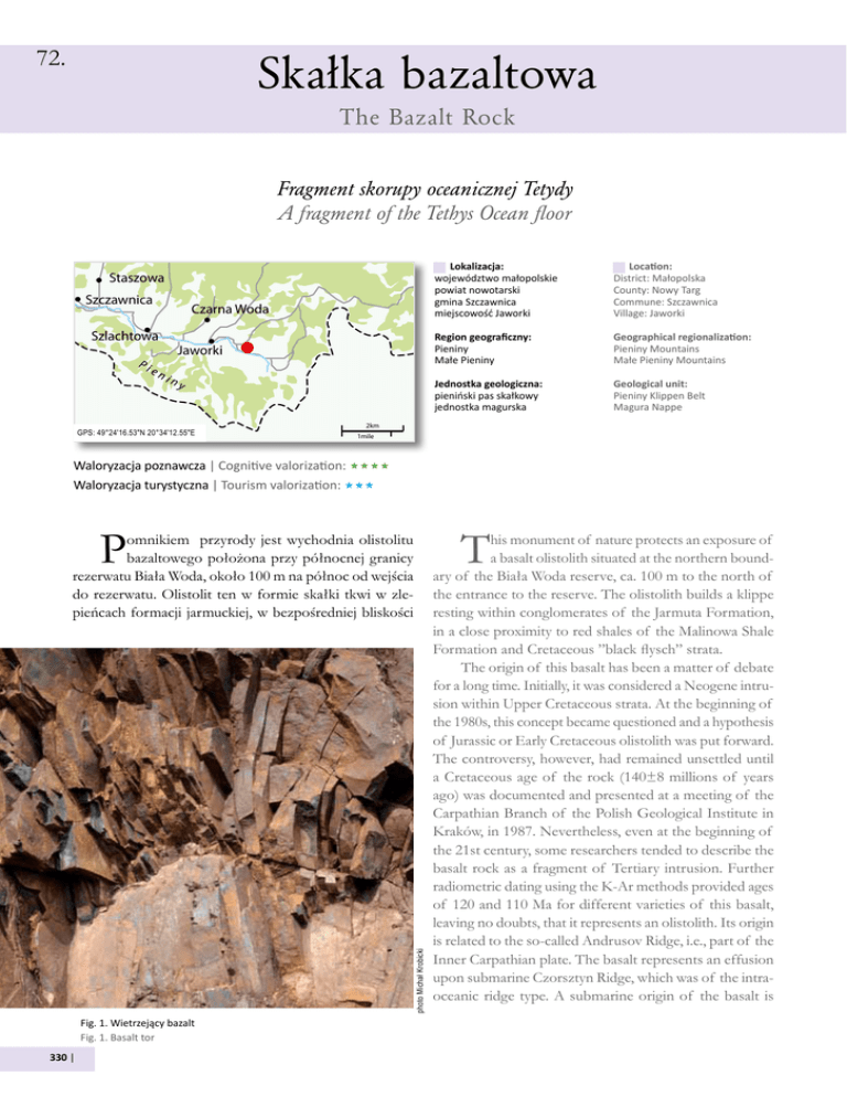 72. Skałka bazaltowa The Bazalt Rock Fragment skorupy oceanicznej Tetydy A fragment of the Tethys Ocean floor Staszowa Szczawnica Czarna Woda Szlachtowa Pi en Jaworki in y GPS: 49°24'16.53"N 20°34'12.55"E Lokalizacja: województwo małopolskie powiat nowotarski gmina Szczawnica miejscowość Jaworki Location: District: Małopolska County: Nowy Targ Commune: Szczawnica Village: Jaworki Region geograficzny: Pieniny Małe Pieniny Geographical regionalization: Pieniny Mountains Małe Pieniny Mountains Jednostka geologiczna: pieniński pas skałkowy jednostka magurska Geological unit: Pieniny Klippen Belt Magura Nappe 2km 1mile Waloryzacja poznawcza | Cognitive valorization: Waloryzacja turystyczna | Tourism valorization: P T photo Michał Krobicki omnikiem przyrody jest wychodnia olistolitu bazaltowego położona przy północnej granicy rezerwatu Biała Woda, około 100 m na północ od wejścia do rezerwatu. Olistolit ten w formie skałki tkwi w zlepieńcach formacji jarmuckiej, w bezpośredniej bliskości Fig. 1. Wietrzejący bazalt Fig. 1. Basalt tor 330 | his monument of nature protects an exposure of a basalt olistolith situated at the northern boundary of the Biała Woda reserve, ca. 100 m to the north of the entrance to the reserve. The olistolith builds a klippe resting within conglomerates of the Jarmuta Formation, in a close proximity to red shales of the Malinowa Shale Formation and Cretaceous ”black flysch” strata. The origin of this basalt has been a matter of debate for a long time. Initially, it was considered a Neogene intrusion within Upper Cretaceous strata. At the beginning of the 1980s, this concept became questioned and a hypothesis of Jurassic or Early Cretaceous olistolith was put forward. The controversy, however, had remained unsettled until a Cretaceous age of the rock (140±8 millions of years ago) was documented and presented at a meeting of the Carpathian Branch of the Polish Geological Institute in Kraków, in 1987. Nevertheless, even at the beginning of the 21st century, some researchers tended to describe the basalt rock as a fragment of Tertiary intrusion. Further radiometric dating using the K-Ar methods provided ages of 120 and 110 Ma for different varieties of this basalt, leaving no doubts, that it represents an olistolith. Its origin is related to the so-called Andrusov Ridge, i.e., part of the Inner Carpathian plate. The basalt represents an effusion upon submarine Czorsztyn Ridge, which was of the intraoceanic ridge type. A submarine origin of the basalt is photo Marek Doktor Fig. 2. Skałka bazaltowa w pobliżu rezerwatu Biała Woda Fig. 2. Basalt tor near the Biała Woda reserve z czerwonymi łupkami formacji łupków z Malinowej i kredowym czarnym fliszem. Pochodzenie bazaltu było przedmiotem długo trwającej dyskusji. Uważano go początkowo za intruzję neogeńską wśród skał górnokredowych. Na początku lat osiemdziesiątych zeszłego stulecia wyrażano wątpliwości na temat intruzywnego pochodzenia bazaltu, uznając go za olistolit wieku jurajskiego, lub wczesnokredowego. Sprawa długo pozostawała nierozstrzygnięta, aż do czasu, kiedy otrzymano informację na temat kredowego wieku (140 +/_8mln lat). W 1987 dane te były przedstawiane na posiedzeniu Oddziału Karpackiego Instytutu Geologicznego w Krakowie. Niemniej jednak, jeszcze w początkach XXI wieku skałkę bazaltową opisują niektórzy badacze jako fragment intruzji trzeciorzędowej. Kolejne badania radiometryczne metodą K-Ar w wyniku dały wiek 120 i 110 mln lat dla różnych typów bazaltu i nie pozostawiły wątpliwości, że jest to olistolit. Pochodzenie bazaltu wiąże się z tak zwanym grzbietem Andrusowa, czyli częścią płyty wewnątrzkarpackiej. Bazalt był wylewem na podmorskim grzbiecie Czorsztyńskim, który miał charakter grzbietu śródoceanicznego. Bazalt dostał się do basenu magurskiego w późnej kredzie. Petrograficznie jest to bazalt oliwinowy, zawierajacy w swoim składzie mineralnym skalenie, pirokseny, attested to by the presence of pillow lavas. The olistolith was shed into the Magura basin in Late Cretaceous time. As far as petrographic composition is concerned, this is an olivine basalt including feldspars, pyroxenes, biotite and amphiboles. Voids left after gas bubbles (vesicles) are commonly filled with calcite. The rock is black, sometimes with greenish hue when fresh, and yellowish, rusty or greenish when weathered. Apart from pillow lavas, the rock shows as well thermal jointing of the sheeting and columnar type. The Upper Cretaceous olistostrome includes as well minor basalt bodies identified with geophysical methods, but not exposed at the surface. The basalt rock is an interesting geotouristic site owing to its high scientific and educational values, as well as due to controversies regarding its origin. Such controversies illustrate research processes in estimation and interpretation of geological phenomena. This site should be visited by both students of geology, participants of geological conferences, and all those who are interested in geological history of the Pieniny Mts. The rock is situated close to the very popular Biała Woda reserve, equipped with a parking lot and cafe enterprises. The vicinities of the reserve are traversed by pedestrian and bicycle tourist tracks. The basalt rock is located near the Biała Woda reserve – very popular tourist destination, | 331 photo Iwona Bieleś Fig. 3. Widok na dolinę Białej Wody Fig. 3. View of the Biała Woda River Valley biotyt, amfibole. Nieliczne pustki po pęcherzykach gazu są wypełnione zwykle kalcytem. Bazalt ma kolor czarny, miejscami z lekkim odcieniem zielonkawym, na zwietrzałych powierzchniach jest koloru żółtawego, rdzawego, lub zielonkawego. W skałce widoczny jest cios termiczny o charakterze skorupowym i słupowym. Olistostroma górnokredowa w formacji jarmuckiej zawiera również inne mniejsze ciała bazaltów niewidoczne na powierzchni, lecz stwierdzone me