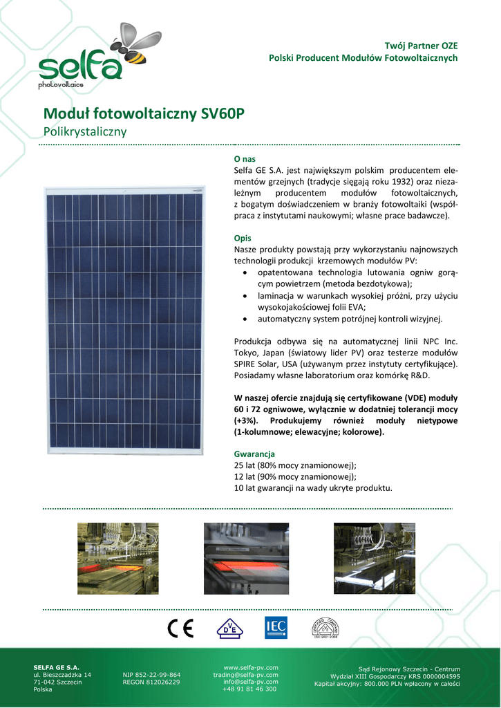 Twój Partner OZE Polski Producent Modułów Fotowoltaicznych Moduł fotowoltaiczny SV60P Polikrystaliczny O nas Selfa GE S.A. jest największym polskim producentem elementów grzejnych (tradycje sięgają roku 1932) oraz niezależnym producentem modułów fotowoltaicznych, z bogatym doświadczeniem w branży fotowoltaiki (współpraca z instytutami naukowymi; własne prace badawcze). Opis Nasze produkty powstają przy wykorzystaniu najnowszych technologii produkcji krzemowych modułów PV:  opatentowana technologia lutowania ogniw gorącym powietrzem (metoda bezdotykowa);  laminacja w warunkach wysokiej próżni, przy użyciu wysokojakościowej folii EVA;  automatyczny system potrójnej kontroli wizyjnej. Produkcja odbywa się na automatycznej linii NPC Inc. Tokyo, Japan (światowy lider PV) oraz testerze modułów SPIRE Solar, USA (używanym przez instytuty certyfikujące). Posiadamy własne laboratorium oraz komórkę R&D. W naszej ofercie znajdują się certyfikowane (VDE) moduły 60 i 72 ogniwowe, wyłącznie w dodatniej tolerancji mocy (+3%). Produkujemy również moduły nietypowe (1-kolumnowe; elewacyjne; kolorowe). Gwarancja 25 lat (80% mocy znamionowej); 12 lat (90% mocy znamionowej); 10 lat gwarancji na wady ukryte produktu. SELFA GE S.A. ul. Bieszczadzka 14 71-042 Szczecin Polska NIP 852-22-99-864 REGON 812026229 www.selfa-pv.com [email protected] [email protected] +48 91 81 46 300 Sąd Rejonowy Szczecin - Centrum Wydział XIII Gospodarczy KRS 0000004595 Kapitał akcyjny: 800.000 PLN wpłacony w całości Twój Partner OZE Polski Producent Modułów Fotowoltaicznych Specyfikacja techniczna SV60P Typ modułu Moc maksymalna (+3%; -0%) Napięcie obwodu otwartego Napięcie mocy maksymalnej Prąd zwarcia Natężenie prądu mocy maksymalnej Współczynnik wypełnienia Sprawność Masa całkowita SV60P-230 SV60P-235 SV60P-240 SV60P-245 230 37,00 29,80 8,30 7,70 74,70 14,00 20 235 37,30 30,20 8,35 7,80 75,50 14,40 20 240 37,60 30,40 8,37 7,90 76,00 14,70 20 245 37,90 30,50 8,60 8,05 76,00 15,00 20 Pmax [W] Voc [V] Vmpp [V] Isc [A] Impp [A] [%] [%] [kg] Współczynniki temperaturowe NOCT: 46°C Isc: 0,05% /°C Temperatura pracy: -40 ÷ +85°C Temperatura otoczenia: -40 ÷ +45°C Wskaźniki maksymalne Voc: -0,34% /°C Max. Napięcie Systemu: 1000VDC Wartość zabezpieczenia: 15A Wpływ natężenia promieniowania 2 Isc Voc G[W/m ] [%] [%] 1000 0 0 900 -9,7 -0,4 500 -48,9 -2,9 300 -69,7 -5,3 200 -79,2 -7,2 * wartości nominalne dla standardowych warunków testowania (AM1.5, 1000W/m2, 25°C) Wymiary modułu SELFA GE S.A. ul. Bieszczadzka 14 71-042 Szczecin Polska NIP 852-22-99-864 REGON 812026229 Charakterystyka prądowo-napięciowa www.selfa-pv.com [email protected] [email protected] +48 91 81 46 300 Sąd Rejonowy Szczecin - Centrum Wydział XIII Gospodarczy KRS 0000004595 Kapitał akcyjny: 800.000 PLN wpłacony w całości