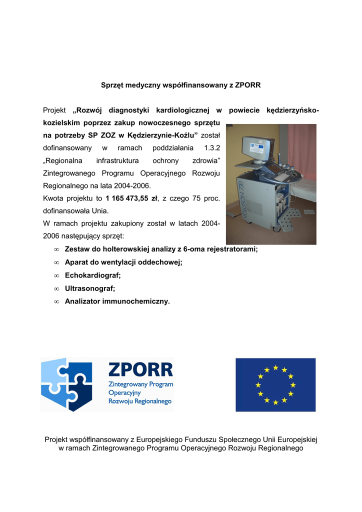 Sprzęt medyczny współfinansowany z ZPORR Projekt „Rozwój diagnostyki kardiologicznej w powiecie kędzierzyńskokozielskim poprzez zakup nowoczesnego sprzętu na potrzeby SP ZOZ w Kędzierzynie-Koźlu” został dofinansowany „Regionalna w ramach infrastruktura poddziałania ochrony 1.3.2 zdrowia” Zintegrowanego Programu Operacyjnego Rozwoju Regionalnego na lata 2004-2006. Kwota projektu to 1 165 473,55 zł, z czego 75 proc. dofinansowała Unia. W ramach projektu zakupiony został w latach 20042006 następujący sprzęt: • Zestaw do holterowskiej analizy z 6-oma rejestratorami; • Aparat do wentylacji oddechowej; • Echokardiograf; • Ultrasonograf; • Analizator immunochemiczny. Projekt współfinansowany z Europejskiego Funduszu Społecznego Unii Europejskiej w ramach Zintegrowanego Programu Operacyjnego Rozwoju Regionalnego