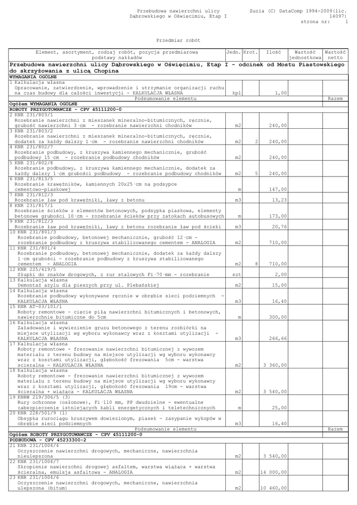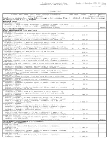 Przebudowa nawierzchni ulicy Dąbrowskiego w Oświęcimiu, Etap I Zuzia (C) DataComp 1994-2009(lic. 14097) strona nr: 1 Przedmiar robót Element, asortyment, rodzaj robót, pozycja przedmiarowa podstawy nakładów Jedn. Krot. Ilość Wartość Wartość jednostkowa netto Przebudowa nawierzchni ulicy Dąbrowskiego w Oświęcimiu, Etap I - odcinek od Mostu Piastowskiego do skrzyżowania z ulicą Chopina WYMAGANIA OGÓLNE 1 Kalkulacja własna Opracowanie, zatwierdzenie, wprowadzenie i utrzymanie organizacji ruchu na czas budowy dla całości inwestycji - KALKULACJA WŁASNA Podsumowanie elementu Ogółem WYMAGANIA OGÓLNE ROBOTY PRZYGOTOWAWCZE - CPV 45111200-0 2 KNR 231/803/1 Rozebranie nawierzchni z mieszanek mineralno-bitumicznych, ręcznie, grubość nawierzchni 3·cm - rozebranie nawierzchni chodników 3 KNR 231/803/2 Rozebranie nawierzchni z mieszanek mineralno-bitumicznych, ręcznie, dodatek za każdy dalszy 1·cm - rozebranie nawierzchni chodników 4 KNR 231/802/7 Rozebranie podbudowy, z kruszywa kamiennego mechanicznie, grubość podbudowy 15·cm - rozebranie podbudowy chodników 5 KNR 231/802/8 Rozebranie podbudowy, z kruszywa kamiennego mechanicznie, dodatek za każdy dalszy 1·cm grubości podbudowy - rozebranie podbudowy chodników 6 KNR 231/813/5 Rozebranie krawężników, kamiennych 20x25·cm na podsypce cementowo-piaskowej 7 KNR 231/812/3 Rozebranie ław pod krawężniki, ławy z betonu 8 KNR 231/817/1 Rozebranie ścieków z elementów betonowych, podsypka piaskowa, elementy betonowe grubości 10·cm - rozebranie ścieków przy zatokach autobusowych 9 KNR 231/812/3 Rozebranie ław pod krawężniki, ławy z betonu rozebranie ław pod ścieki 10 KNR 231/801/3 Rozebranie podbudowy, betonowej mechanicznie, grubość 12·cm rozebranie podbudowy z kruszywa stabilizowanego cementem - ANALOGIA 11 KNR 231/801/4 Rozebranie podbudowy, betonowej mechanicznie, dodatek za każdy dalszy 1·cm grubości - rozebranie podbudowy z kruszywa stabilizowanego cementem - ANALOGIA 12 KNR 225/419/5 Słupki do znaków drogowych, z rur stalowych Fi·70·mm - rozebranie 13 Kalkulacja własna Demontaż azylu dla pieszych przy ul. Plebańskiej 14 Kalkulacja własna Rozebranie podbudowy wykonywane ręcznie w obrębie sieci podziemnych KALKULACJA WŁASNA 15 KNR AT-03/101/1 Roboty remontowe - cięcie piłą nawierzchni bitumicznych i betonowych, nawierzchnie bitumiczne do 5cm 16 Kalkulacja własna Załadowanie i wywiezienie gruzu betonowego z terenu rozbiórki na miejsce utylizacji wg wyboru wykonawcy wraz z kosztami utylizacji KALKULACJA WŁASNA 17 Kalkulacja własna Roboty remontowe - frezowanie nawierzchni bitumicznej z wywozem materiału z terenu budowy na miejsce utylizacji wg wyboru wykonawcy wraz z kosztami utylizacji, głębokość frezowania 5cm - warstwa scieralna - KALKULACJA WŁASNA 18 Kalkulacja własna Roboty remontowe - frezowanie nawierzchni bitumicznej z wywozem materiału z terenu budowy na miejsce utylizacji wg wyboru wykonawcy wraz z kosztami utylizacji, głębokość frezowania 19cm - warstwa ścieralna + wiążąca - KALKULACJA WŁASNA 19 KNRW 219/306/5 (3) Rury ochronne (osłonowe), Fi·110 mm, PP dwudzielne - ewentualne zabezpieczenie istniejących kabli energetycznych i teletechnicznych 20 KNR 228/501/9 (1) Obsypka rurociągu kruszywem dowiezionym, piasek - zasypanie wykopów w obrębie sieci podziemnych Podsumowanie elementu Ogółem ROBOTY PRZYGOTOWAWCZE - CPV 45111200-0 PODBUDOWA - CPV 45233300-2 21 KNR 231/1004/4 Oczyszczenie nawierzchni drogowych, mechaniczne, nawierzchnia nieulepszona 22 KNR 231/1004/7 Skropienie nawierzchni drogowej asfaltem, warstwa wiążąca + warstwa ścieralna, emulsja asfaltowa - ANALOGIA 23 KNR 231/1004/6 Oczyszczenie nawierzchni drogowych, mechaniczne, nawierzchnia ulepszona (bitum) kpl 1,00 Razem m2 m2 240,00 2 m2 m2 240,00 240,00 5 240,00 m 147,00 m3 13,23 m 173,00 m3 20,76 m2 710,00 m2 8 710,00 szt 2,00 m2 15,00 m3 16,40 m 300,00 m3 266,66 m2 3 360,00 m2 3 540,00 m 25,00 m3 16,40 Razem m2 3 540,00 m2 14 000,00 m2 10 460,00 Przebudowa nawierzchni ulicy Dąbrowskiego w Oświęcimiu, Etap I Zuzia (C) DataComp 1994-2009(lic. 14097) strona nr: 2 Element, asortyment, rodzaj robót, pozycja przedmiarowa Jedn. Krot. podstawy nakładów 24 KNR 231/204/4 Nawierzchnie z tłucznia kamiennego, warstwa dolna z tłucznia, dodatek za każdy dalszy 1·cm grubości warstwy, podbudowa z kruszywa łamanego na chodnikach, kruszywo 0/31,5mm - ANALOGIA m2 25 KNR 231/204/4 Nawierzchnie z tłucznia kamiennego, warstwa dolna z tłucznia, dodatek za każdy dalszy 1·cm grubości warstwy, podbudowa z kruszywa łamanego m2 5 na chodnikach, kruszywo 0/31,5mm - ANALOGIA 26 KNR 223/105/1 Podbudowa betonowa zagęszczona ręcznie, warstwa grubości 15·cm podbudowa z chudego betonu C8/10 R= 0,955 M= 1,000 S= 1,000 m2 27 KNR 223/105/2 Podbudowa betonowa zagęszczona ręcznie, dodatek za każdy 1·cm różnicy grubości - podbudowa z chudego betonu C8/10 R= 0,955 M= 1,000 S= 1,000 m2 5 28 KNR 231/110/1 Podbudowy z mieszanek mineralno-bitumicznych, mieszanki o lepiszczu asfaltowym, grubość warstwy po zagęszczeniu 4·cm [podbudowa z betonu asfaltowego AC 22P] m2 29 KNR 231/110/2 Podbudowy z mieszanek mineralno-bitumicznych, mieszanki o lepiszczu asfaltowym, dodatek za każdy następny 1·cm warstwy [podbudowa z betonu m2 4 asfaltowego AC 22P] 30 KNR 231/110/2 Podbudowy z mieszanek mineralno-bitumicznych, mieszanki o lepiszczu asfaltowym, dodatek za każdy następny 1·cm warstwy [podbudowa z m2 7 betonu asfaltowego AC 22P] 31 KNR 231/310/5 Nawierzchnie z mieszanek mineralno-bitumicznych grysowych, asfaltowe, warstwa wyrównawcza o grubości 3·cm [beton asfaltowy AC 11S] m2 wyrównanie podbudowy betonowej w miejscach spękań odbitych 32 KNR 911/401/2 (1) Wzmocnienie nawierzchni geosiatką poliestrową 100/100 kN/m kotwiona do podbudowy w miejscach napraw spękań odbitych - ANALOGIA m2 Podsumowanie elementu Ogółem PODBUDOWA - CPV 45233300-2 NAWIERZCHNIA - CPV 45233252-0 33 KNR 231/3