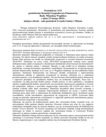 Protokół nr 3/15 posiedzenia Komisji Gospodarczo-Finansowej Rady Miejskiej Węglińca z dnia 23 lutego 2015r. miejsce obrad – sala posiedzeń Urzędu Gminy i Miasta Witając zebranych, Przewodniczący Komisji - radny Zbigniew Zawadzki, o godz. 9.02, otworzył posiedzenie. Stwierdził, iż posiedzenie jest prawomocne, bowiem spośród pięcioosobowego składu komisji w posiedzeniu uczestniczy czworo jej członków. Dodał, że nieobecny radny Mariusz Mól jest usprawiedliwiony. Lista obecności radnych stanowi zał. nr 1, a osób zaproszonych i uczestniczących w posiedzeniu-zał. nr 2. Następnie prowadzący obrady przypomniał ich porządek zawarty w zaproszeniu na komisję (zał. nr 3). Uwag nie zgłoszono i 4 głosami „za” porządek obrad został przyjęty. Pierwszym tematem była INFORMACJA W SPRAWIE DZIAŁALNOŚCI KLUBÓW SPORTOWYCH, SEZON 2014/2015. Pisemna informacja w tej sprawie stanowi zał. nr 4. Burmistrz Stanisław Mikołajczyk podkreślił, iż wskazany w informacji okres dotyczy rundy jesiennej. Na takich samych zasadach zostały przeprowadzone konkursy na rundę wiosenną. Każdy klub otrzyma też środki na zakończenie rozgrywek w sezonie jesienno-wiosennym 2014/2015. Natomiast na nowy sezon 2015/2016 przygotowane zostaną nowe zasady dofinansowania zadań związanych z określonymi działaniami skierowanymi do mieszkańców tut. gminy w zakresie sportu i rekreacji. Sposób, w jaki środki na te działania zostaną podzielone, wymaga konsultacji uzgodnień i modyfikacji. Przypomniał tu, że dotychczasowa metoda finansowania skutkuje m.in. tym, że w Węglińcu finansuje się dwa piłkarskie kluby sportowe. Natomiast finansowanie ma dotyczyć działań związanych z zapewnieniem mieszkańcom udziału w zadaniach związanych ze sportem, rekreacją czy z zadaniami prozdrowotnymi, a nie działalności klubów. Nie jest bowiem obowiązkiem gminy finansować i zapewnić pieniądze na działalność klubów lecz na konkretne działania. Poza tym w wysokości, na jaką pozwala budżet gminy. Dodał jeszcze, że dwa spotkania z zarządami obydwu węglinieckich klubów sportowych, nie przyniosło skutecznych uzgodnień w kwestii ich połączenia. Jednym z powodów negatywnego stanowiska KS Górnik jest obawa, iż zostaną wybrani tylko lepsi zawodnicy. Burmistrz przybliżył także kwestie związane z ewentualnymi kryteriami i zasadami stanowiącymi podstawy do oceny i wyboru oferty złożonej przez dany klub w odniesieniu do konkretnej działalności (m.in. liczebność grupy zawodników, liczba zawodników zgłoszonych do rozgrywek w OZPN. Zwrócono także uwagę na potrzebę zapewnienia uczestnictwa w zajęciach sportowych mieszkańcom gminy, nawet kosztem rozgrywek w niższej lidze. Odnosząc się jeszcze do podniesionych spraw dot. utrzymania boisk, wyjaśnił m.in., że utrzymujemy tylko gminne obiekty sportowe. Kwestią wyboru jest więc to, czy najpierw realizujemy niezbędne prace na naszym obiekcie, czy np. na dzierżawionym od Nadleśnictwa boisku Victorii Ruszów. W kwestii uzyskanej od Dyrektora Zakładu Usług Komunalnych informacji nt. braku w umowie zadania dot. utrzymania boiska w Czerwonej Wodzie zapewnił, że sprawa zostanie sprawdzona i uregulowana. Natomiast Skarbnik Jolanta Zawisza odnosząc się do wskazanej sprawy utrzymywania boiska szkolnego w Czerwonej Wodzie wyjaśniła, że szkoła corocznie otrzymuje środki na ten cel. Sprawy organizacyjne w tym względzie należą więc do kompetencji Dyrektora Szkoły. 1 Burmistrz S.Mikołajczyk odpowiadając na pytanie przybliżył także sprawy związane z utrzymaniem poboczy (roboty publiczne płatne przez Powiatowy Urząd Pracy, koordynatorem których będzie ZUK przy współudziale sołtysów). Kolejnym tematem był INFORMACJA NT. WYKORZYSTANIA ŚRODKÓW POZABUDŻETOWYCH W OŚWIACIE, KULTURZE I SPORCIE W ROKU 2014. Pisemna informacja stanowi zał. nr 5. Burmistrz S. Mikołajczyk zauważył, iż informacja nie zawiera danych dot. OSP wyjaśniając jednocześnie, że jednostki te nie podlegają organizacyjnie gminie. Odnosząc się do pytań poinformował, iż na terenie tut. gminy zatrudnionych jest dwóch animatorów sportu. Poza tym wskazał, iż związane jest to z wymogiem programu Orlik, w ramach którego, i z którego środków realizowane były obiekty, na których działają w/w animatorzy. Kierownik Wydziału Planowania i Rozwoju - Agata Adamczyk wyjaśniła sprawę związaną ze środkami pozyskanymi na zajęcia sportowe prowadzone przez trenera dla uczniów klas IVVI w ramach projektu MULTISPORT oraz na sprzęt sportowy. M.in. wyjaśniła, że jest to program rządowy połączony z programem Urzędu Marszałkowskiego. W ramach pozyskanych środków (po ok. 2 tys. zł. na szkołę) realizowane były zajęcia sportowe w Szkole Podstawowej w Ruszowie oraz w Szkole Podstawowej w Czerwonej Wodzie. Szkoły te otrzymały także zakupiony przez Urząd Marszałkowski sprzęt sportowy. Przystąpiono do realizacji kolejnego punktu porządku obrad tj. OPINIOWANIE WNIOSKU FIRMY DINO W SPR. NABYCIA DZIAŁKI NR 1/15 POŁOŻONEJ W WĘGLIŃCU. Pisemny komplet materiałów z tym związanych stanowi zał. nr 6. Na wyświetlonej na ekranie mapie sytuacyjnej Burmistrz S.Mikołajczyk wskazał lokalizację terenu planowanego pod zabudowę sklepu oraz urządzenia towarzyszące jak np. parking. Z przedstawionych informacji wynikało, że w skład tego kompleksu wchodzą działka będąca własnością Gminnej Spółdzielni oraz teren gminy. Obecnie część działki gminnej dzierżawiona jest na ogrody. Najdalszy okres ich dzierżawy to rok 2017, a okres ich wypowiedzenia wynosi 1 miesiąc. Burmistrz zasugerował, że w przypadku pozytywnej opinii nt. omawianego wniosku, powierzchnię sprzedaży należy powiększyć o pas wzdłuż ulicy, do torów kolejowych, co zapewni cały, estetyczny ciąg zagospodarowania tego terenu. Dalej wyjaśnił, iż ewentualna jego sprzedaż może się odbyć w trybie przetargowym. Wsk