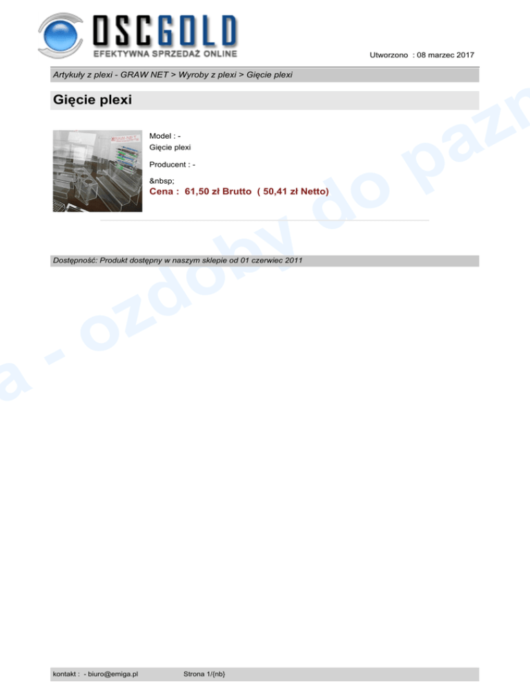 a g Utworzono : 08 marzec 2017 Artykuły z plexi - GRAW NET > Wyroby z plexi > Gięcie plexi n z Gięcie plexi Model : Gięcie plexi Producent : o d Cena : 61,50 zł Brutto ( 50,41 zł Netto) y b o d z Dostępność: Produkt dostępny w naszym sklepie od 01 czerwiec 2011 o - kontakt : - [email protected] Strona 1/{nb} a p