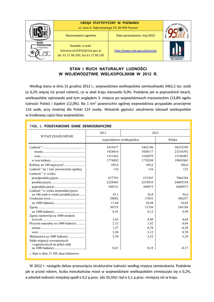 URZĄD STATYSTYCZNY W POZNANIU ul. Jana H. Dąbrowskiego 79, 60‐959 Poznań Opracowania sygnalne Data opracowania: maj 2013 Kontakt: e‐mail: [email protected] tel. 61 27 98 200, fax 61 27 98 100 http://www.stat.gov.pl/poznan STAN I RUCH NATURALNY LUDNOŚCI W WOJEWÓDZTWIE WIELKOPOLSKIM W 2012 R. Według stanu w dniu 31 grudnia 2012 r., województwo wielkopolskie zamieszkiwało 3462,2 tys. osób (o 0,2% więcej niż przed rokiem), co w skali kraju stanowiło 9,0%. Podobnie jak w poprzednich latach, wielkopolskie zajmowało pod tym względem 3. miejsce po województwach mazowieckim (13,8% ogółu ludności Polski) i śląskim (12,0%). Na 1 km2 powierzchni ogólnej województwa przypadało przeciętnie 116 osób, przy średniej dla Polski 123 osoby. Wskaźnik gęstości zaludnienia lokował wielkopolskie w środkowej części listy województw. TABL. 1. PODSTAWOWE DANE DEMOGRAFICZNE WYSZCZEGÓLNIENIE Ludność a.................................................... miasta ................................................... wieś ...................................................... w tym kobiety .......................................... Kobiety na 100 mężczyzna ......................... Ludność a na 1 km2 powierzchni ogólnej Ludność a w wieku: przedprodukcyjnym ................................. produkcyjnym.......................................... poprodukcyjnym...................................... Ludność a w wieku nieprodukcyjnym na 100 osób w wieku produkcyjnym ....... Urodzenia żywe .......................................... na 1000 ludności...................................... Zgony ......................................................... na 1000 ludności...................................... Zgony niemowląt na 1000 urodzeń żywych .................................................... Przyrost naturalny na 1000 ludności .......... miasta ...................................................... wieś ......................................................... Małżeństwa na 1000 ludności .................... Saldo migracji wewnętrznych i zagranicznych na pobyt stały na 1000 ludności...................................... a 2011 2012 województwo wielkopolskie Polska 3455477 1924014 1531463 1774892 105,6 116 3462196 1920117 1542079 1778298 105,6 116 38533299 23336392 15196907 19883965 106,6 123 677781 2228465 549231 673307 2219016 569873 7066768 24605558 6860973 55,1 38082 11,04 30755 8,91 56,0 37833 10,94 31536 9,12 56,6 386257 10,02 384788 9,99 3,65 2,12 1,27 3,20 5,59 4,49 1,82 0,78 3,12 5,52 4,64 0,04 -0,39 0,70 5,29 0,41 0,18 -0,17 Stan w dniu 31 XII; dane bilansowe. W 2012 r. nastąpiły dalsze przesunięcia strukturalne ludności według miejsca zamieszkania. Podobnie jak w przed rokiem, liczba mieszkańców miast w województwie wielkopolskim zmniejszyła się o 0,2%, a odsetek ludności miejskiej spadł o 0,2 p.proc. (do 55,5%) i był o 5,1 p.proc. mniejszy niż w kraju. W badanym okresie nie zmieniła się struktura ludności według płci. W 2012 r. w populacji mieszkań‐ ców województwa wielkopolskiego nadal przeważały kobiety (51,4%), a współczynnik feminizacji, oznaczający liczbę kobiet przypadających na 100 mężczyzn, utrzymał się na poziomie z poprzednich lat i wyniósł 105,6, tj. nieco mniej niż przeciętnie w kraju (106,6). W miastach przewaga liczebna kobiet była większa (110,1 kobiet na 100 mężczyzn), natomiast na wsi obserwowano niemal równowagę płci (100,3 kobiet na 100 mężczyzn). W 2012 r. w województwie wielkopolskim nastąpiły dalsze przesunięcia w strukturze ludności we‐ dług ekonomicznych grup wieku. Liczba ludności w wieku przedprodukcyjnym w ciągu roku zmniejszyła się o 0,7%, a udział tej grupy w całej populacji spadł o 0,2 p.proc. do 19,4%. Zbiorowość osób w wieku poprodukcyjnym zwiększyła się o 3,8%, a jej odsetek wzrósł o 0,6 p.proc do 16,5%. Mniej osób niż w 2011 r. liczyła grupa w wieku produkcyjnym (spadek o 0,4%). Jej udział zmniejszył się w ciągu roku o 0,4 p.proc. do 64,1%. Przy takich zmianach w strukturze ludności odnotowano wzrost współczynnika obciążenia demograficznego, oznaczającego liczbę osób w wieku nieprodukcyjnym (przed‐ i poproduk‐ cyjnym) przypadającą na 100 osób w wieku produkcyjnym. W 2012 r. w województwie wielkopolskim współczynnik ten wyniósł 56,0 (wobec 55,1 przed rokiem) i był nieco mniejszy niż przeciętnie w kraju (56,6). Ryc. 1. STRUKTURA LUDNOŚCI WEDŁUG PŁCI I WIEKU Stan w dniu 31 XII Na stan i strukturę ludności duży wpływ mają zjawiska demograficzne, określane jako ruch natural‐ ny. W całym roku 2012 w województwie wielkopolskim zawarto 19103 małżeństwa, zarejestrowano 37833 urodzenia żywe oraz 31536 zgonów, w tym 170 zgonów niemowląt. Współczynniki ruchu natu‐ ralnego, liczone na 1000 ludności, w większości kształtowały się na nieco niższym poziomie niż w po‐ przednim roku. W przypadku małżeństw, których liczba była o 0,9% mniejsza niż w 2011 r., współczyn‐ nik obniżył się z 5,59‰ do 5,52‰. Liczba zarejestrowanych urodzeń żywych w ciągu roku zmniejszyła się o 0,7%, a współczynnik urodzeń na 1000 ludności spadł z 11,04‰ do 10,94‰. Na poziomie wyż‐ szym niż przed rokiem ukształtował się współczynnik zgonów (9,12‰ wobec 8,91‰ w 2011 r., przy wzroście liczby zgonów o 2,5%), w tym także zgonów niemowląt (4,49‰ wobec 3,65‰). Wzrost liczby zgonów, przy jednoczesnym spadku urodzeń, spowodował zmniejszenie różnicy dzielącej te dwie wiel‐ kości, określanej jako przyrost naturalny. Współczynnik przyrostu naturalnego na 1000 ludności w cią‐ gu roku obniżył się z 2,12‰ do 1,82‰. 2 Ryc. 2. RUCH NATURALNY LUDNOŚCI W WOJEWÓDZTWIE WIELKOPOLSKIM Czynnikami wpływającymi na spadek lub przyrost liczby ludności są migracje, zarówno wewnętrzne – rozpatrywane w skali kraju i województwa – jak i zagraniczne. W 2012 r. poza grani