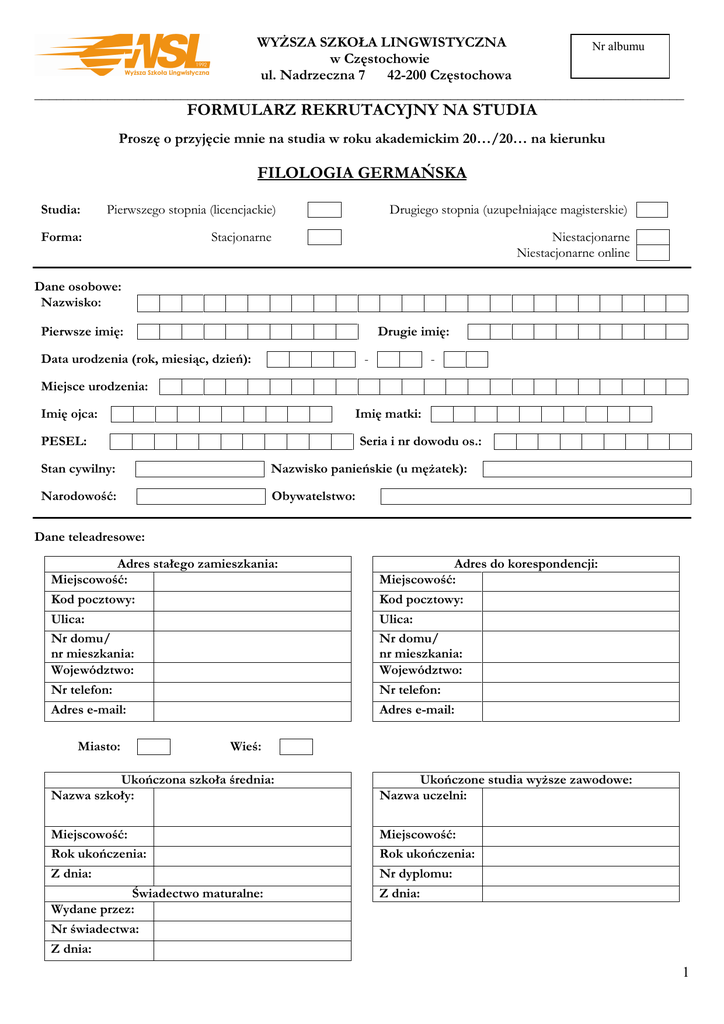 WYŻSZA SZKOŁA LINGWISTYCZNA Nr albumu w Częstochowie ul. Nadrzeczna 7 42-200 Częstochowa _________________________________________________________________________________________ FORMULARZ REKRUTACYJNY NA STUDIA Proszę o przyjęcie mnie na studia w roku akademickim 20…/20… na kierunku FILOLOGIA GERMAŃSKA Studia: Pierwszego stopnia (licencjackie) Forma: Drugiego stopnia (uzupełniające magisterskie) Stacjonarne Niestacjonarne Niestacjonarne online Dane osobowe: Nazwisko: Pierwsze imię: Drugie imię: Data urodzenia (rok, miesiąc, dzień): - - Miejsce urodzenia: Imię ojca: Imię matki: PESEL: Seria i nr dowodu os.: Stan cywilny: Nazwisko panieńskie (u mężatek): Narodowość: Obywatelstwo: Dane teleadresowe: Adres stałego zamieszkania: Miejscowość: Kod pocztowy: Ulica: Nr domu/ nr mieszkania: Województwo: Nr telefon: Adres e-mail: Miasto: Adres do korespondencji: Miejscowość: Kod pocztowy: Ulica: Nr domu/ nr mieszkania: Województwo: Nr telefon: Adres e-mail: Wieś: Ukończona szkoła średnia: Nazwa szkoły: Ukończone studia wyższe zawodowe: Nazwa uczelni: Miejscowość: Rok ukończenia: Z dnia: Świadectwo maturalne: Wydane przez: Nr świadectwa: Z dnia: Miejscowość: Rok ukończenia: Nr dyplomu: Z dnia: 1 Orzeczenie o niepełnosprawności: nie dotyczy stopień rodzaj: ..................................................................... ................................................................................................................................................................ Pracuję zawodowo: tak: nie: Nazwa firmy: W okresie: od: do: Na czyim utrzymaniu pozostaje kandydat: na stanowisku: rodziców opiekuna własnym Proszę podać dokładne dane osobowe i adresowe osoby utrzymującej:: …...…….………………………………………………… …………………………….……………………………… telefon: …………………………………………..………… e-mail: ……………………………………….……..……… Stosunek do powszechnego obowiązku służby wojskowej: kategoria Zwolniony od obowiązku służby wojskowej tak nie poborowy przedpoborowy przeniesiony do rezerwy - kategoria WKU Prawidłowość powyższych danych potwierdzam własnoręcznym podpisem Wyrażam zgodę na zbieranie i przetwarzanie informacji dotyczących moich danych osobowych zawartych w Kwestionariuszu osobowym dla potrzeb niezbędnych do rekrutacji na studia i do celów informacyjnych (zgodnie z Ustawą z dnia 29.08.97r o ochronie danych osobowych. Dziennik Ustaw Nr 133 Poz. 883). Podanie danych osobowych jest dobrowolne, a każdy ma prawo wglądu do swoich danych osobowych oraz ich poprawienia lub usunięcia. Administratorem danych osobowych jest Wyższa Szkoła Lingwistyczna w Częstochowie, ul. Nadrzeczna 7, 42-200 Częstochowa. Częstochowa, dnia.................................20… roku ............................................................................. podpis kandydata Do podania załączam: □ świadectwo dojrzałości - oryginał lub odpis □ świadectwo ukończenia szkoły średniej - oryginał lub odpis □ odpis dyplomu □ kserokopię suplementu do dyplomu (oryginał dokumentu do wglądu) □ certyfikat ........................................................................................................................................................ □ 4 fotografie o wymiarze 37 x 52 - bez nakrycia głowy □ fotografię w formacie JPG 20 mm x 25 mm, rozdzielczość 300 dpi (na opisanej płycie CD - imię i nazwisko kandydata) □ kserokopię dowodu osobistego(strona ze zdjęciem, numerem dowodu i adresem stałego zameldowania) – oryginał dokumentu do wglądu Potwierdzenie otrzymania w/w dokumentów przez Uczelnię ................................................................... data i podpis pracownika WSL 2 Wybór specjalizacji: Studia pierwszego stopnia: Nauczyciel języka niemieckiego Tłumaczenia pisemne Język obcy w biznesie — podstawy edukacji ekonomicznej i przedsiębiorczości Komunikacja w kontaktach międzynarodowych Lingwistyka stosowana i komunikacja społeczna Lingwistyka stosowana - multimedia i e-komunikacja Lingwistyka stosowana i komunikacja międzykulturowa Lingwistyka stosowana - mediacje i negocjacje Wybór specjalizacji dodatkowej: Specjalizacje w języku obcym Wczesnoszkolne nauczanie języka angielskiego Specjalne potrzeby edukacyjne Język niemiecki w biznesie- podstawy edukacji ekonomicznej i przedsiębiorczości Specjalizacje w języku polskim Dziennikarstwo i public relations Nauczyciel multimedialny Edukacja wczesnoszkolna z wychowaniem przedszkolnym Logopedia Opieka nad dzieckiem Arteterapia Infobrokering Studia drugiego stopnia: Nauczyciel języka niemieckiego Tłumaczenia pisemne Tłumaczenia ustne Język obcy w biznesie — podstawy edukacji ekonomicznej i przedsiębiorczości Lingwistyka stosowana i komunikacja społeczna Lingwistyka stosowana - multimedia i e-komunikacja Lingwistyka stosowana i komunikacja międzykulturowa Lingwistyka stosowana - mediacje i negocjacje Wybór specjalizacji dodatkowej: Specjalizacje w języku obcym Wczesnoszkolne nauczanie języka angielskiego Specjalne potrzeby edukacyjne Język niemiecki w biznesie- podstawy edukacji ekonomicznej i przedsiębiorczości Specjalizacje w języku polskim Dziennikarstwo i komunikacja społeczna Nauczyciel multimedialny Edukacja wczesnoszkolna z wychowaniem przedszkolnym Logopedia Opieka nad dzieckiem Arteterapia Infobrokering Wybór specjalizacji seminaryjnej (dotyczy studiów drugiego stopnia)*: 1. Studia stacjonarne: METODYKA ** JĘZYKOZNAWSTWO HISTORIA/TEORIA LITERATURY/ KULTUROZNAWSTWO/PRZEKŁAD LITERACKI PRZEKŁADOZNAWSTWO 2. Studia niestacjonarne: METODYKA ** JĘZYKOZNAWSTWO HISTORIA/TEORIA LITERATURY PRZEKŁADOZNAWSTWO * kandydat będzie miał możliwość wyboru specjalizacji po wypełnieniu pkt. 15 regulaminu rekrutacji ** dotyczy tylko specjalizacji nauczycielskiej 3 Wy