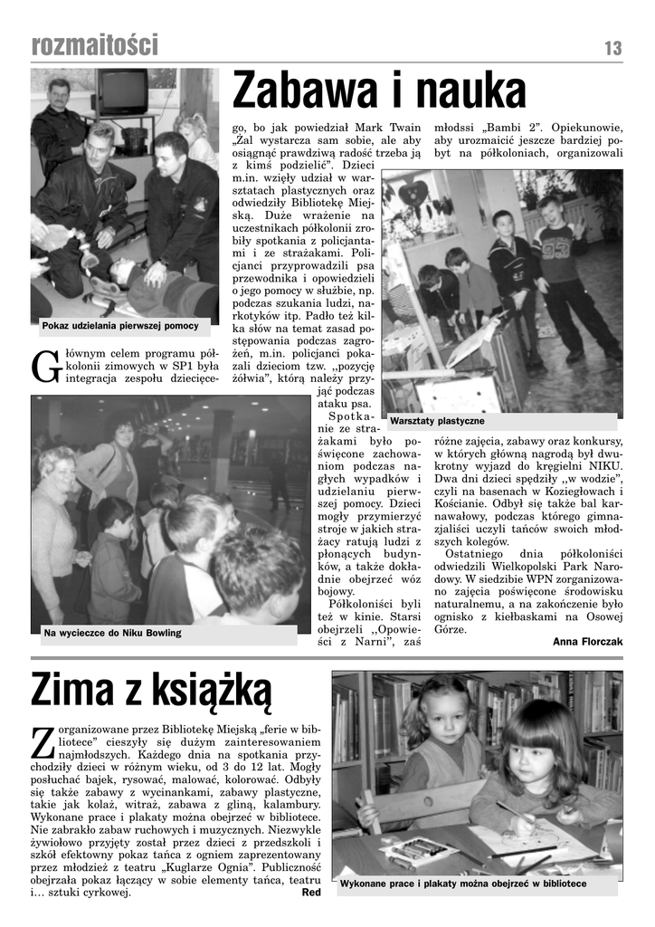 rozmaitoci Pokaz udzielania pierwszej pomocy G ³ównym celem programu pó³kolonii zimowych w SP1 by³a integracja zespo³u dzieciêce- Na wycieczce do Niku Bowling Zabawa i nauka 13 go, bo jak powiedzia³ Mark Twain m³odssi Bambi 2. Opiekunowie, ¯al wystarcza sam sobie, ale aby aby urozmaiciæ jeszcze bardziej poosi¹gn¹æ prawdziw¹ radoæ trzeba j¹ byt na pó³koloniach, organizowali z kim podzieliæ. Dzieci m.in. wziê³y udzia³ w warsztatach plastycznych oraz odwiedzi³y Bibliotekê Miejsk¹. Du¿e wra¿enie na uczestnikach pó³kolonii zrobi³y spotkania z policjantami i ze stra¿akami. Policjanci przyprowadzili psa przewodnika i opowiedzieli o jego pomocy w s³u¿bie, np. podczas szukania ludzi, narkotyków itp. Pad³o te¿ kilka s³ów na temat zasad postêpowania podczas zagro¿eñ, m.in. policjanci pokazali dzieciom tzw. ,,pozycjê ¿ó³wia, któr¹ nale¿y przyj¹æ podczas ataku psa. Spotka- Warsztaty plastyczne nie ze stra¿akami by³o po- ró¿ne zajêcia, zabawy oraz konkursy, wiêcone zachowa- w których g³ówn¹ nagrod¹ by³ dwuniom podczas na- krotny wyjazd do krêgielni NIKU. g³ych wypadków i Dwa dni dzieci spêdzi³y ,,w wodzie, udzielaniu pierw- czyli na basenach w Kozieg³owach i szej pomocy. Dzieci Kocianie. Odby³ siê tak¿e bal karmog³y przymierzyæ nawa³owy, podczas którego gimnastroje w jakich stra- zjalici uczyli tañców swoich m³od¿acy ratuj¹ ludzi z szych kolegów. p³on¹cych budynOstatniego dnia pó³kolonici ków, a tak¿e dok³a- odwiedzili Wielkopolski Park Narodnie obejrzeæ wóz dowy. W siedzibie WPN zorganizowabojowy. no zajêcia powiêcone rodowisku Pó³kolonici byli naturalnemu, a na zakoñczenie by³o te¿ w kinie. Starsi ognisko z kie³baskami na Osowej obejrzeli ,,Opowie- Górze. ci z Narni, za Anna Florczak Zima z ksi¹¿k¹ Z organizowane przez Bibliotekê Miejsk¹ ferie w bibliotece cieszy³y siê du¿ym zainteresowaniem najm³odszych. Ka¿dego dnia na spotkania przychodzi³y dzieci w ró¿nym wieku, od 3 do 12 lat. Mog³y pos³uchaæ bajek, rysowaæ, malowaæ, kolorowaæ. Odby³y siê tak¿e zabawy z wycinankami, zabawy plastyczne, takie jak kola¿, witra¿, zabawa z glin¹, kalambury. Wykonane prace i plakaty mo¿na obejrzeæ w bibliotece. Nie zabrak³o zabaw ruchowych i muzycznych. Niezwykle ¿ywio³owo przyjêty zosta³ przez dzieci z przedszkoli i szkó³ efektowny pokaz tañca z ogniem zaprezentowany przez m³odzie¿ z teatru Kuglarze Ognia. Publicznoæ obejrza³a pokaz ³¹cz¹cy w sobie elementy tañca, teatru i sztuki cyrkowej. Red Wykonane prace i plakaty mo¿na obejrzeæ w bibliotece