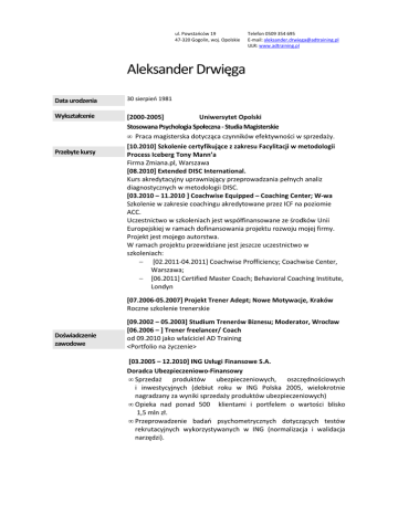 ul. Powstańców 19 47-320 Gogolin, woj. Opolskie Telefon 0509 354 695 E-mail: [email protected] ULR: www.adtraining.pl Aleksander Drwięga Data urodzenia 30 sierpień 1981 Wykształcenie [2000-2005] Uniwersytet Opolski Stosowana Psychologia Społeczna - Studia Magisterskie • Praca magisterska dotycząca czynników efektywności w sprzedaży. [10.2010] Szkolenie certyfikujące z zakresu Facylitacji w metodologii Process Iceberg Tony Mann’a Firma Zmiana.pl, Warszawa [08.2010] Extended DISC International. Kurs akredytacyjny uprawniający przeprowadzania pełnych analiz diagnostycznych w metodologii DISC. [03.2010 – 11.2010 ] Coachwise Equipped – Coaching Center; W-wa Szkolenie w zakresie coachingu akredytowane przez ICF na poziomie ACC. Uczestnictwo w szkoleniach jest współfinansowane ze środków Unii Europejskiej w ramach dofinansowania projektu rozwoju mojej firmy. Projekt jest mojego autorstwa. W ramach projektu przewidziane jest jeszcze uczestnictwo w szkoleniach: − [02.2011-04.2011] Coachwise Profficiency; Coachwise Center, Warszawa; − [06.2011] Certified Master Coach; Behavioral Coaching Institute, Londyn Przebyte kursy [07.2006-05.2007] Projekt Trener Adept; Nowe Motywacje, Kraków Roczne szkolenie trenerskie Doświadczenie zawodowe [09.2002 – 05.2003] Studium Trenerów Biznesu; Moderator, Wrocław [06.2006 – ] Trener freelancer/ Coach od 09.2010 jako właściciel AD Training <Portfolio na życzenie> [03.2005 – 12.2010] ING Usługi Finansowe S.A. Doradca Ubezpieczeniowo-Finansowy • Sprzedaż produktów ubezpieczeniowych, oszczędnościowych i inwestycyjnych (debiut roku w ING Polska 2005, wielokrotnie nagradzany za wyniki sprzedaży produktów ubezpieczeniowych) • Opieka nad ponad 500 klientami i portfelem o wartości blisko 1,5 mln zł. • Przeprowadzenie badań psychometrycznych dotyczących testów rekrutacyjnych wykorzystywanych w ING (normalizacja i walidacja narzędzi). [07.2004 – 11.2007] Emm Consulting Opole Trener współpracujący • Opracowanie i sprzedaż oferty szkoleń miękkich. • Tworzenie programów szkoleniowych. • Prowadzenie szkoleń. [08.2003 – 04.2004] Europejski Fundusz Leasingowy Wrocław Specjalista ds. rozwoju personelu • Prowadzenie całego procesu rekrutacyjnego na stanowiska sprzedażowe i specjalistyczne od zamieszczenia ogłoszenia po prowadzenie rozmów rekrutacyjnych, • Prowadzenie szkoleń sprzedażowych dla nowych przedstawicieli, • Prowadzenie strony www dotyczącej rekrutacji w EFL, • Administrowanie oceną pracowniczą, • Uczestniczenie w dużych projektach HR (wdrażanie e-learningu, opis, wycena stanowisk, tworzenie siatki wynagrodzeń). [02.2003 – 03.2003] Momentum – Agencja Reklamowa Warszawa Trener Przeprowadzenie 8 warsztatów dotyczących sprzedaży dla hostess i pracowników sprzedaży biorących udział w promocji nowych produktów firmy Agfa [08.2002 – 02.2003 ] Biuro Integracji Europejskiej w Opolu Trener • Przeprowadzenie 4 szkoleń i warsztatów dla wolontariuszy współpracujących z BIE na terenie całego województwa. • Warsztaty dotyczyły autoprezentacji oraz sztuki argumentowania Języki Język Angielski – bardzo dobry (w mowie i w piśmie) Język Niemiecki – podstawowy (w mowie) Otrzymane nagrody • Debiut roku 2005 - Wyróżnienie dla najlepszego doradcy ING w Polsce zatrudnionego w 2005 roku. • Wyróżnienie za zajęcie 3 miejsca w oddziale Opolskim w sprzedaży produktów ING w roku 2006, • Wyróżnienie za zajęcie 7 miejsca w Regionie Południowy – Zachód w sprzedaży produktów ING w roku 2006. • Wyróżnienie za zajęcie IV miejsca w oddziale Opolskim w sprzedaży produktów ING w roku 2007. • Wyróżnienie za zajęcie III miejsca w oddziale Opolskim w sprzedaży produktów ING w roku 2008. • Ośmiokrotnie nagradzany za najwyższą miesięczną sprzedaż w oddziale Opolskim [11.2009 – 07.2010] Projekt „Świadome Zarządzanie siłą opolskich Prowadzenie szkoleń przedsiębiorstw” Realizowany przez fimę Habilis. w projektach szkoleniowych Opiekun merytoryczny dofinansowanych przez Cykl 5 warsztatów dedykowanych właścicielom opolskim firm dotyczących UE. zarządzania firmą, motywowania pracowników i usprawniania komunikacji w firmie obejmujący także coaching uczestników po każdym warsztacie. Strona projektu www.swiadomezarzadzanie.pl [04.2009 – 10.2009] Projekt realizowany na zlecenie Wyższej Szkoły Zarządzania i Administracji w Opolu. Coach i trener Cykl treningów integracyjnych oraz 20 sesji coachingowych dla uczestników projektu „Wykorzystaj potencjał uczelni – załóż firmę”. [08.2008 – w reazlizacji] Projekt „Biedronkowa Akademia Zarządzania” realizowany na zlecenie Nowe Motywacje Trener Szkolenia rozwoju kadry kierowniczej Jeronimo Martins Dystrybucja S.A. Cykl obejmuje 4 tematy: o Budowanie Autorytetu Lidera Grupy o Doskonalenie Umiejętności Kierowniczych o Zarządzanie czasem o Motywowanie Pozafinansowe [09 – 11.2007] Projekt realizowany na zlecenie Emm Consulting Trener Przygotowanie i realizacja cyklu ośmiu szkoleń kompetencji osobistych dla Opolskiego Urzędu Wojewódzkiego: o Obsługa Trudnego Klienta o Efektywność Osobista o Radzenie sobie ze stresem Zainteresowania Sport (jogging, narty, turystyka we wszelkich jej postaciach), dobra książka, muzyka chillout i jazz. Przesłanie niniejszego życiorysu jest równoznaczne z wyrażeniem przeze mnie zgody na przetwarzanie zawartych w nim danych do celów rekrutacyjnych, zgodnie z ustawą o ochronie danych osobowych z dnia 28.08.1997. r. Dz. U. z 2002 r., Nr 101, poz. 923 ze zm.