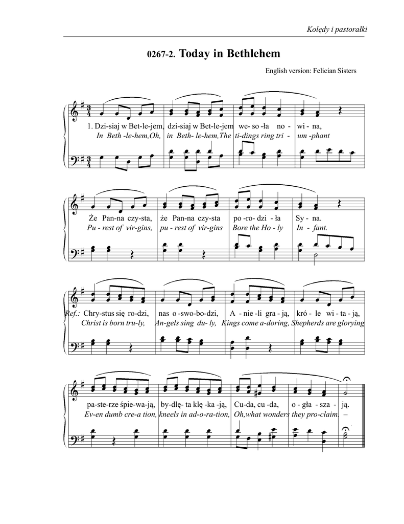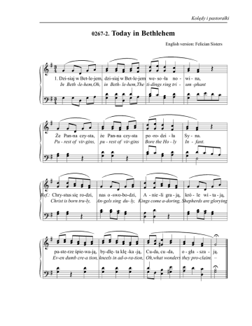 Kolędy i pastorałki 0267-2. Today in Bethlehem English version: Felician Sisters 1. Dzi-siaj w Bet-le-jem, dzi-siaj w Bet-le-jem we- so -ła no - wi - na, In Beth -le-hem,Oh, in Beth- le-hem,The ti-dings ring tri - um -phant Że Pan-na czy-sta, że Pan-na czy-sta Pu - rest of vir-gins, pu - rest of vir-gins po -ro- dzi - ła Bore the Ho - ly Sy - na. In - fant. Ref.: Chry-stus się ro-dzi, nas o -swo-bo-dzi, A - nie -li gra - ją, kró - le wi - ta - ją, Christ is born tru-ly, An-gels sing du- ly, Kings come a-doring, Shepherds are glorying pa-ste-rze śpie-wa-ją, by-dlę- ta klę -ka -ją, Cu-da, cu -da, o - gła - sza - ją. Ev-en dumb cre-a tion, kneels in ad-o-ra-tion, Oh,what wonders they pro-claim. – Kolędy i pastorałki Mel. II, English version: Felician Sisters Dzi - siaj w Be - tle - jem In Be - thle - hem the Że Pan - na Pu - rest of czy vir Chry - stus się Christ is born A Kings Pa - ste - rze Ev - en dumb - sta - gine ro tru nie - li come a - we - so - ła no ti - dings ring tri - - dzi ly, gra - ją, dor - ing, śpie - wa - ją, cre - a - tion po bore wi um ro - dzi - ła the Ho - ly nas o swo an - gels sing kró - le she - pherds - Sy In bo du wi are na, phant, - na. fant. - dzi, ly ta - ją, gloy - ing, by - dlę - ta klę knelss in a - do - ka - ją ra - tion. Kolędy i pastorałki Cu Oh, - da, what Cu Oh, - da, what cu won - da - ders cu - da won - ders o - gła - sza they pro - ją, claim, o - gła - sza they pro - ją. claim. 2. Maryja Panna, Maryja Panna Dzieciątko piastuje I Józef święty, i Józef święty Ono pielęgnuje. Chrystus się rodzi... 3. Choć w stajeneczce, choć w stajeneczce Panna Syna rodzi, Przecież On wkrótce, przecież On wkrótce ludzi oswobodzi. Chrystus się rodzi... 4. I trzej Królowie, i trzej Królowie od wschodu przybyli, I dary Panu, i dary Panu kosztowne złożyli. Chrystus sie rodzi... 5. Pójdźmy też i my, pójdźmy też i my przywitać Jezusa, Króla nad królmi, Króla nad królmi uwielbić Chrystusa. Chrystus się rodzi... 2. Sweet, Virgin Mary, sweet Virgin Mary, how She cares for Him And aged Joseph, and aged Joseph, how He watches o’er Him. Christ is born… 3. Though in the stable, though in the stable, Christ is born of Mary To save His people, to save His people, our Lord will not tarry. Christ is born… 4. Kings from the Orient, Kings from the Orient came; so we are told Bringing the Infant, bringing the Infant gifts in chests of gold. Christ is born ... 5. Come, let us hasten, come, let us hasten and with joyful singing Bowing before Him , bowing before Him greet the King of Nations. Christ is born…