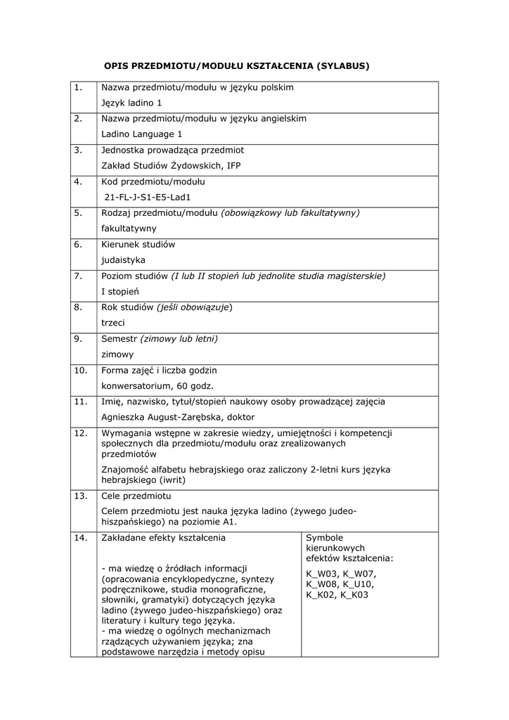OPIS PRZEDMIOTU/MODUŁU KSZTAŁCENIA (SYLABUS) 1. Nazwa przedmiotu/modułu w języku polskim Język ladino 1 2. Nazwa przedmiotu/modułu w języku angielskim Ladino Language 1 3. Jednostka prowadząca przedmiot Zakład Studiów Żydowskich, IFP 4. Kod przedmiotu/modułu 21-FL-J-S1-E5-Lad1 5. Rodzaj przedmiotu/modułu (obowiązkowy lub fakultatywny) fakultatywny 6. Kierunek studiów judaistyka 7. Poziom studiów (I lub II stopień lub jednolite studia magisterskie) I stopień 8. Rok studiów (jeśli obowiązuje) trzeci 9. Semestr (zimowy lub letni) zimowy 10. Forma zajęć i liczba godzin konwersatorium, 60 godz. 11. Imię, nazwisko, tytuł/stopień naukowy osoby prowadzącej zajęcia Agnieszka August-Zarębska, doktor 12. Wymagania wstępne w zakresie wiedzy, umiejętności i kompetencji społecznych dla przedmiotu/modułu oraz zrealizowanych przedmiotów Znajomość alfabetu hebrajskiego oraz zaliczony 2-letni kurs języka hebrajskiego (iwrit) 13. Cele przedmiotu Celem przedmiotu jest nauka języka ladino (żywego judeohiszpańskiego) na poziomie A1. 14. Zakładane efekty kształcenia - ma wiedzę o źródłach informacji (opracowania encyklopedyczne, syntezy podręcznikowe, studia monograficzne, słowniki, gramatyki) dotyczących języka ladino (żywego judeo-hiszpańskiego) oraz literatury i kultury tego języka. - ma wiedzę o ogólnych mechanizmach rządzących używaniem języka; zna podstawowe narzędzia i metody opisu Symbole kierunkowych efektów kształcenia: K_W03, K_W07, K_W08, K_U10, K_K02, K_K03 zjawisk językowych. - ma uporządkowaną wiedzę o systemach fonologicznym, gramatycznym i leksykalnym języka ladino, Potrafi dokonać podstawowego zestawienia struktur i zjawisk języka polskiego oraz ladino, a także ma podstawową wiedzę o przechodzeniu od struktur jednego języka do struktur drugiego. - potrafi tworzyć w języku ladino krótkie teksty ustne i pisane (np. dialogi, opisy), właściwe dla określonej sytuacji komunikacyjnej, wykorzystując przy tym podstawowe źródła informacji (słowniki, podręczniki). - potrafi pracować w zespole, przyjmując w nim różne role, dzieli się posiadaną wiedzą i umiejętnościami. - umie odpowiednio określić priorytety służące realizacji Zadań związanych z nauką języka; potrafi gospodarować czasem i realizować określone zadania w wyznaczonych terminach. 15. Treści programowe 1. Fonetyka i systemy ortograficzne ladino. 2. Zagadnienia gramatyczne: rodzaj i liczba rzeczowników, odmiana przymiotnika przez liczby i rodzaje, rodzajniki, zaimki i przymiotniki wskazujące, zaimiki i przymiotniki dzierżawcze, liczebniki główne i porządkowe, czasownik ser, estar, ay, zdania przeczące, koniugacje czasownika, odmiana czasowników w czasie teraźniejszym, czas przyszły, tryb łączny czasownika (wstęp). 3. Słownictwo i zagadnienia tematyczne: rodzina, zawody, określanie czasu, miejsca, opis mieszkania, zainteresowania. 16. Zalecana literatura (podręczniki) Varol, Marie-Christine (2008) Manual of Judeo-Spanish, University of Maryland. Bunis, David (1975) A Guide to Reading and Writing Judezmo, New York. Kohen, Elli, Kohen-Gordon, Dahlia (2000) Ladino-English / English-Ladino Concise Encyclopedic Dictionary, New York. Nehama, Joseph (1977) Dictionnaire du judéo-espagnol, Madrid. Pascual Recuero, Pascual (1977) Diccionario básico ladino-español, Barcelona. 17. Forma zaliczenia poszczególnych komponentów przedmiotu/modułu, sposób sprawdzenia osiągnięcia zamierzonych efektów kształcenia: Zaliczenie konwersatorium na ocenę na podstawę: - zaliczenia sprawdzianów pisemnych i kartkówek - zaliczenia prac domowych - obecności i aktywnego udziału w zajęciach (dozwolone 4 nieobecności; każdą kolejną należy zaliczyć na konsultacjach w terminie nie dłuższym niż miesiąc od nieobecności). 18. Język wykładowy polski / ladino 19. Obciążenie pracą studenta Forma aktywności studenta Godziny zajęć (wg planu studiów) z nauczycielem: - ćwiczenia: Średnia liczba godzin na zrealizowanie aktywności 60 Praca własna studenta np.: - przygotowanie do zajęć: 15 - przygotowanie do sprawdzianów: 15 30 Suma godzin 90 Liczba punktów ECTS 3