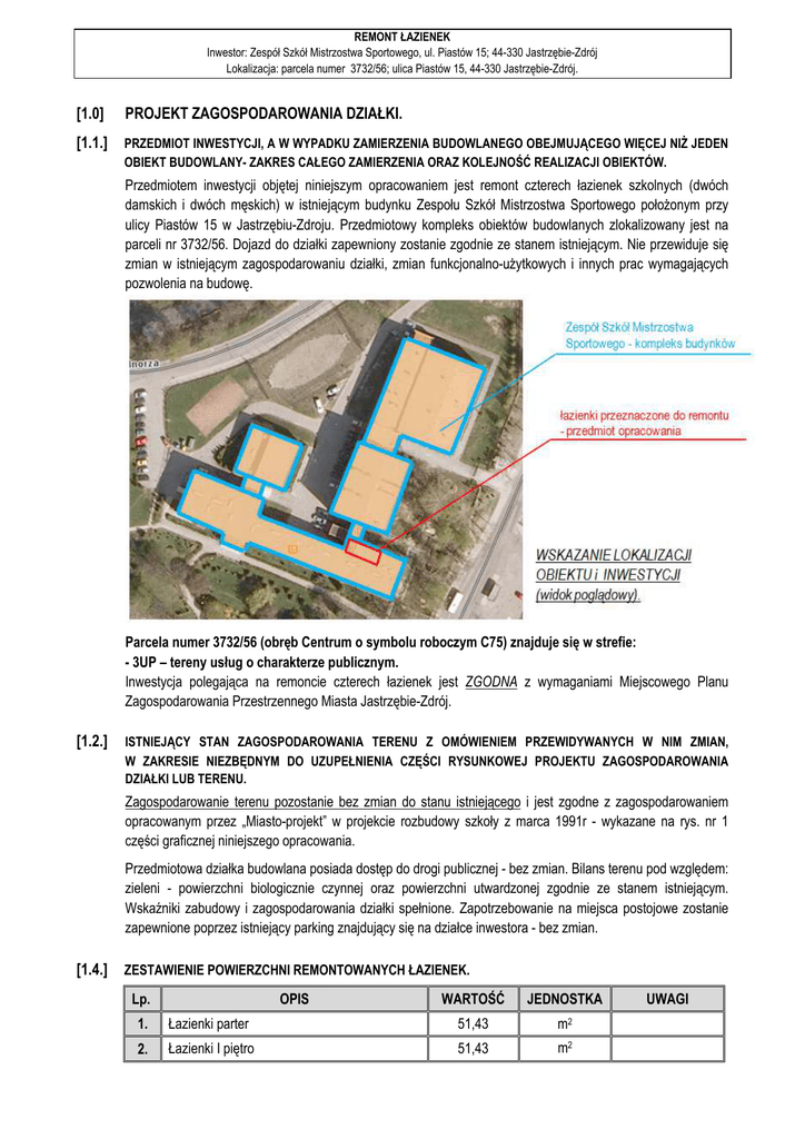 REMONT ŁAZIENEK Inwestor: Zespół Szkół Mistrzostwa Sportowego, ul. Piastów 15; 44-330 Jastrzębie-Zdrój Lokalizacja: parcela numer 3732/56; ulica Piastów 15, 44-330 Jastrzębie-Zdrój. [1.0] PROJEKT ZAGOSPODAROWANIA DZIAŁKI. [1.1.] PRZEDMIOT INWESTYCJI, A W WYPADKU ZAMIERZENIA BUDOWLANEGO OBEJMUJĄCEGO WIĘCEJ NIŻ JEDEN OBIEKT BUDOWLANY- ZAKRES CAŁEGO ZAMIERZENIA ORAZ KOLEJNOŚĆ REALIZACJI OBIEKTÓW. Przedmiotem inwestycji objętej niniejszym opracowaniem jest remont czterech łazienek szkolnych (dwóch damskich i dwóch męskich) w istniejącym budynku Zespołu Szkół Mistrzostwa Sportowego położonym przy ulicy Piastów 15 w Jastrzębiu-Zdroju. Przedmiotowy kompleks obiektów budowlanych zlokalizowany jest na parceli nr 3732/56. Dojazd do działki zapewniony zostanie zgodnie ze stanem istniejącym. Nie przewiduje się zmian w istniejącym zagospodarowaniu działki, zmian funkcjonalno-użytkowych i innych prac wymagających pozwolenia na budowę. Parcela numer 3732/56 (obręb Centrum o symbolu roboczym C75) znajduje się w strefie: - 3UP – tereny usług o charakterze publicznym. Inwestycja polegająca na remoncie czterech łazienek jest ZGODNA z wymaganiami Miejscowego Planu Zagospodarowania Przestrzennego Miasta Jastrzębie-Zdrój. [1.2.] ISTNIEJĄCY STAN ZAGOSPODAROWANIA TERENU Z OMÓWIENIEM PRZEWIDYWANYCH W NIM ZMIAN, W ZAKRESIE NIEZBĘDNYM DO UZUPEŁNIENIA CZĘŚCI RYSUNKOWEJ PROJEKTU ZAGOSPODAROWANIA DZIAŁKI LUB TERENU. Zagospodarowanie terenu pozostanie bez zmian do stanu istniejącego i jest zgodne z zagospodarowaniem opracowanym przez „Miasto-projekt” w projekcie rozbudowy szkoły z marca 1991r - wykazane na rys. nr 1 części graficznej niniejszego opracowania. Przedmiotowa działka budowlana posiada dostęp do drogi publicznej - bez zmian. Bilans terenu pod względem: zieleni - powierzchni biologicznie czynnej oraz powierzchni utwardzonej zgodnie ze stanem istniejącym. Wskaźniki zabudowy i zagospodarowania działki spełnione. Zapotrzebowanie na miejsca postojowe zostanie zapewnione poprzez istniejący parking znajdujący się na działce inwestora - bez zmian. [1.4.] ZESTAWIENIE POWIERZCHNI REMONTOWANYCH ŁAZIENEK. Lp. OPIS WARTOŚĆ JEDNOSTKA 1. Łazienki parter 51,43 m2 2. Łazienki I piętro 51,43 m2 UWAGI REMONT ŁAZIENEK Inwestor: Zespół Szkół Mistrzostwa Sportowego, ul. Piastów 15; 44-330 Jastrzębie-Zdrój Lokalizacja: parcela numer 3732/56; ulica Piastów 15, 44-330 Jastrzębie-Zdrój. Bilans działki nr 3732/56 bez zmian do stanu istniejącego. [2.0] OPIS CZĘŚCI ARCHITEKTONICZNO - KONSTRUKCYJNEJ. [2.1] Stan istniejący łazienek przeznaczonych do remontu: Pomieszczenia łazienek znajdują się w części kompleksu zespołu szkół położonego przy ulicy Piastów 15 w Jastrzębiu - Zdroju. Przewiduje się remont czterech łazienek na kondygnacji parteru i I piętra - dwie łazienki damskie i dwie męskie na każdej przedmiotowej kondygnacji. Toalety przeznaczone dla dziewczyn (parter i I piętro) posiadają wydzielone trzy kabiny ustępowe wyposażone w odpowiednie urządzenia sanitarne zamontowane na jednakowej wysokości niedostosowanej do uczniów klas 1-3 szkoły podstawowej. Brak jest w pomieszczeniu wydzielonego drzwiami przedsionka, a dwie umywalki zlokalizowane są obrębie przestrzeni komunikacyjnej (na przeciw kabin ustępowych). W narożu łazienki wydzielone jest pomieszczenie techniczne (gospodarcze) przeznaczone do magazynowania środków czystości oraz innych potrzebnych przedmiotów mających na celu utrzymanie czystości wewnątrz pomieszczeń. Toalety przeznaczona dla chłopców posiadają wydzielone (analogicznie) trzy kabiny ustępowe wyposażone w odpowiednie urządzenia sanitarne niedostosowane do uczniów klas 1-3 szkoły podstawowej. Na przeciw kabin ustępowych wydzielono kabiny wyposażone w pisuary. Łazienka męska nie posiada wpustu podłogowego z syfonem, a także armatury czerpalnej ze złączką do węża. Dwie umywalki zlokalizowane są obrębie przestrzeni komunikacyjnej - brak jest wydzielonego drzwiami odrębnego przedsionka. Toaleta posiada dwa niezależne pomieszczenia techniczne (gospodarcze). Toalety wyposażone są czynną w instalację elektryczną, kanalizacji sanitarnej, wodociągową oraz c.o. Do poszczególnych punktów czerpalnych doprowadzona jest wyłącznie woda zimna. W pomieszczeniach zastosowano wentylację grawitacyjną miejscowo wspomaganą mechanicznie. W chwili obecnej zastosowana stolarka drzwiowa jest niezgodna z obowiązującymi przepisami technicznobudowlanymi pod względem wymiarów drzwi w świetle ościeży (wysokość i szerokość). Wymiary wewnętrzne kabin ustępowych są zbyt małe (min. 1,0x1,1 m). Po dokonaniu oględzin zewnętrznych ogólny stan elementów konstrukcji toalet nie budzi zastrzeżeń: ściany i stropy w dobrym stanie technicznym. Stan estetyczny toalet określa się jako zły: widoczne są liczne ubytki płytek ceramicznych, ślady korozji oraz zużycia materiału. Korzystanie z pomieszczeń nie zagraża bezpieczeństwu użytkowników. W umywalkach brak jest ciepłej wody użytkowej. [2.2] Stan projektowany - prace rozbiórkowe: ZAKRES ROBÓT ROZBIÓRKOWYCH: • Powiększenie drzwi wejściowych do toalet poprzez rozkucie otworu istniejącego do szerokości ok. 100 cm i montaż nowego nadproża (wymiary otworu wykonać do wybranego typu drzwi), • Demontaż drzwi wewnętrznych, grzejników c.o. i urządzeń sanitarnych, • Rozbiórka ścian działowych, • Skucie płytek ceramicznych z podłóg i ścian oraz usunięcie wylewek i tynków w tzw. "głuchych" miejscach. WYTYCZNE ROBÓT ROZBIÓRKOWYCH: • Przed przystąpieniem do wykonywania prac rozbiórkowych należy upewnić się o odłączeniu pomieszczeń od istniejących sieci zasilających (woda, c.o., kanalizacja i energetyka); • Nie składować materiałów z rozbiórki na terenie szkoły i części budynku remontowanego tylko na bieżąco wywozić je na teren wysypiska odpadów; • Przewraca