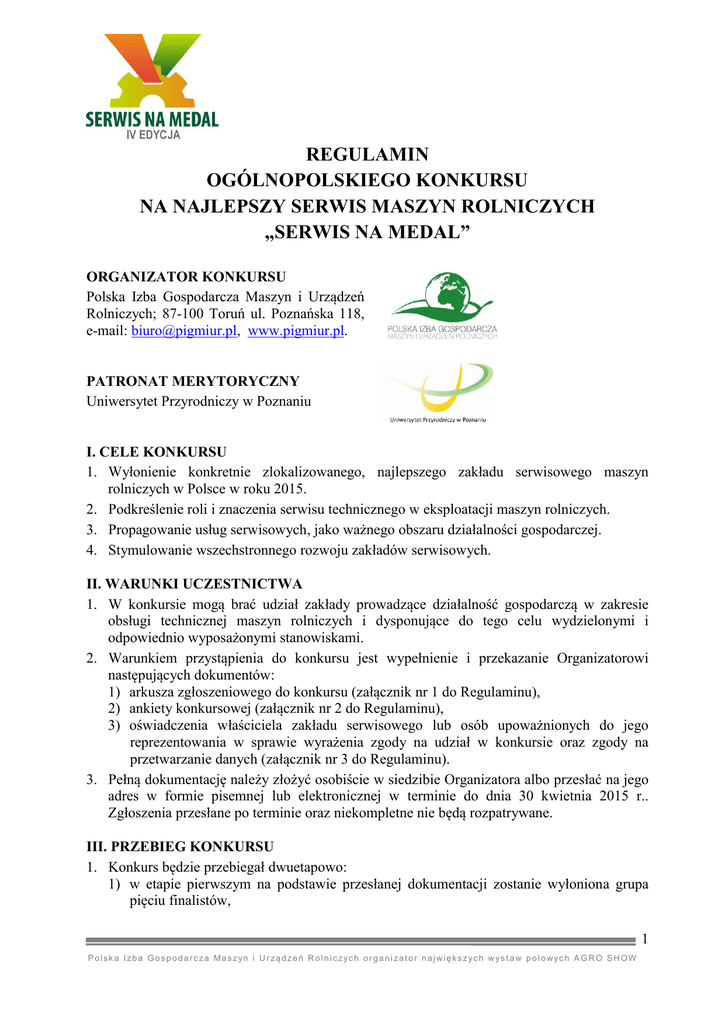 REGULAMIN OGÓLNOPOLSKIEGO KONKURSU NA NAJLEPSZY SERWIS MASZYN ROLNICZYCH „SERWIS NA MEDAL” ORGANIZATOR KONKURSU Polska Izba Gospodarcza Maszyn i Urządzeń Rolniczych; 87-100 Toruń ul. Poznańska 118, e-mail: [email protected], www.pigmiur.pl. PATRONAT MERYTORYCZNY Uniwersytet Przyrodniczy w Poznaniu I. CELE KONKURSU 1. Wyłonienie konkretnie zlokalizowanego, najlepszego zakładu serwisowego maszyn rolniczych w Polsce w roku 2015. 2. Podkreślenie roli i znaczenia serwisu technicznego w eksploatacji maszyn rolniczych. 3. Propagowanie usług serwisowych, jako ważnego obszaru działalności gospodarczej. 4. Stymulowanie wszechstronnego rozwoju zakładów serwisowych. II. WARUNKI UCZESTNICTWA 1. W konkursie mogą brać udział zakłady prowadzące działalność gospodarczą w zakresie obsługi technicznej maszyn rolniczych i dysponujące do tego celu wydzielonymi i odpowiednio wyposażonymi stanowiskami. 2. Warunkiem przystąpienia do konkursu jest wypełnienie i przekazanie Organizatorowi następujących dokumentów: 1) arkusza zgłoszeniowego do konkursu (załącznik nr 1 do Regulaminu), 2) ankiety konkursowej (załącznik nr 2 do Regulaminu), 3) oświadczenia właściciela zakładu serwisowego lub osób upoważnionych do jego reprezentowania w sprawie wyrażenia zgody na udział w konkursie oraz zgody na przetwarzanie danych (załącznik nr 3 do Regulaminu). 3. Pełną dokumentację należy złożyć osobiście w siedzibie Organizatora albo przesłać na jego adres w formie pisemnej lub elektronicznej w terminie do dnia 30 kwietnia 2015 r.. Zgłoszenia przesłane po terminie oraz niekompletne nie będą rozpatrywane. III. PRZEBIEG KONKURSU 1. Konkurs będzie przebiegał dwuetapowo: 1) w etapie pierwszym na podstawie przesłanej dokumentacji zostanie wyłoniona grupa pięciu finalistów, 1 P o lsk a Izb a G o s p o d a r c za Ma s z yn i U r zą d ze ń R o l n i c zyc h o r g a n i za t o r n a j wi ęk s zyc h w ys t a w p o l o w yc h A G R O SH OW 2) w etapie drugim nastąpi wizytacja Komisji Konkursowej w zakładach zakwalifikowanych do finału w celu przeprowadzenia: weryfikacji informacji zawartych w dokumentach złożonych w pierwszym etapie przez finalistów, dodatkowej ankiety, testu teoretycznego przez wskazanego pracownika serwisu. Wizytacja odbędzie się nie później niż do dnia 30 czerwca 2015 r.. A. Pierwszy etap Konkursu 2. Każda z odpowiedzi uczestników zawarta w wypełnionej ankiecie konkursowej oceniana będzie w skali 1 pkt lub 0 pkt. 3. Do finału (drugiego etapu) zakwalifikowani zostaną uczestnicy, którzy złożyli kompletną dokumentację oraz uzyskali największą liczbę punktów. B. Drugi etap konkursu (finał) 4. W przypadku stwierdzenia podczas weryfikacji, że odpowiedź zawarta w ankiecie konkursowej pierwszego etapu jest niezgodna z rzeczywistością, odjęty zostanie punkt przyznany w pierwszym etapie za taką odpowiedź. 5. Dodatkowa ankieta obejmować będzie ocenę zagadnień z zakresu ilości i rodzaju wyposażenia, kwalifikacji pracowników serwisowych, ogólnych reguł obowiązujących w zakładzie serwisowym, w tym dotyczących bezpieczeństwa. 6. Przyznanie przez Komisję Konkursową punktów dla poszczególnych zagadnień ankiety dodatkowej nastąpi po wizytacji uczestnika, w terminie ustalonym przez Komisję. Uczestnik otrzyma informację wyłącznie o ogólnej liczbie otrzymanych przez niego punktów. 7. Test teoretyczny przeprowadzony będzie w wizytowanym zakładzie i rozwiązywany przez pracownika serwisu, którego wskaże uczestnik konkursu. Test zawiera 10 pytań jednokrotnego wyboru, głównie z zakresu napraw maszyn i pojazdów rolniczych. Po zakończeniu weryfikacji zakładów naprawczych sporządzona zostanie lista rankingowa wszystkich testów teoretycznych pracowników serwisu na podstawie, której Komisja Konkursowa przyzna dodatkowe: 5 punktów za pierwsze miejsce na liście rankingowej, 4 punkty za drugie miejsce, 3 punkty za trzecie miejsce, 2 punkty za czwarte miejsce i 1 punkt za miejsce piąte. 8. Uczestnik zakwalifikowany do finału nie będzie brany pod uwagę przy ustalaniu klasyfikacji (dyskwalifikacja), jeżeli: 1) uniemożliwi lub utrudni Komisji Konkursowej przeprowadzenie weryfikacji lub dodatkowej ankiety, 2) na skutek dokonanej weryfikacji ankiety z pierwszego etapu odjęte zostaną punkty i suma punktów tej ankiety po odjęciu powodowałaby, że uczestnik ten nie zakwalifikowałby się do drugiego etapu (finału). 9. W ramach drugiego etapu komisja konkursowa może również przeprowadzić oceny bez wiedzy zakładu serwisowego, np. telefonicznie lub poprzez fikcyjnego klienta. IV. KOMISJA KONKURSOWA Komisję Konkursową powołuje Organizator. V. SPOSÓB OCENY I NAGRODY 2 P o lsk a Izb a G o s p o d a r c za Ma s z yn i U r zą d ze ń R o l n i c zyc h o r g a n i za t o r n a j wi ęk s zyc h w ys t a w p o l o w yc h A G R O SH OW 1. Zwycięzcą Konkursu zostanie zakład, który uzyska największą łączną liczbę punktów w pierwszym i drugim etapie. Zakład otrzyma dodatkowe 2 punkty za udział, co najmniej dwóch pracowników w IV edycji konkursu MECHANIK NA MEDAL. Następne pozycje zajmą zakłady z kolejną największą łączną liczbą punktów. 2. W przypadku równej ilości punktów Komisja Konkursowa przyzna równorzędne lokaty albo przeprowadzi dodatkową klasyfikację w oparciu o ankiety drugiego etapu. 3. Nagrody: 1 miejsce – 15.000 PLN brutto, 2 miejsce – 10.000 PLN brutto, 3 miejsce – 5.000 PLN brutto. 4. Zwycięzca konkursu będzie miał prawo posługiwania się w swojej działalności oznaczeniem zwycięzcy, zgodnie z wzorem opracowanym przez Organizatora. 5. Organizator zastrzega możliwość innego podziału lub zwiększenia ogólnej puli nagród oraz możliwość dodatkowego przyznania wyróżnień. 6. Uroczyste podsumowanie Konkursu oraz wręczenie nagród nastąpi podczas XVII Międzynarodowej Wystawy Rolniczej AGRO SHOW w dniach pomiędzy 18 a 21 września 2015 r.. VI.